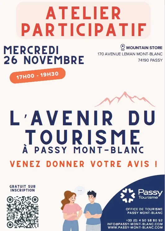 Dieser für alle offene Workshop, der von einem auf den Übergang im Tourismus spezialisierten Berater geleitet wird, dient dem kollektiven Austausch über die Zukunft des Tourismus in Passy Mont-Blanc. Möchten Sie ein Bedürfnis äußern? Eine Idee, die Sie mitteilen möchten? Sie haben das Wort!