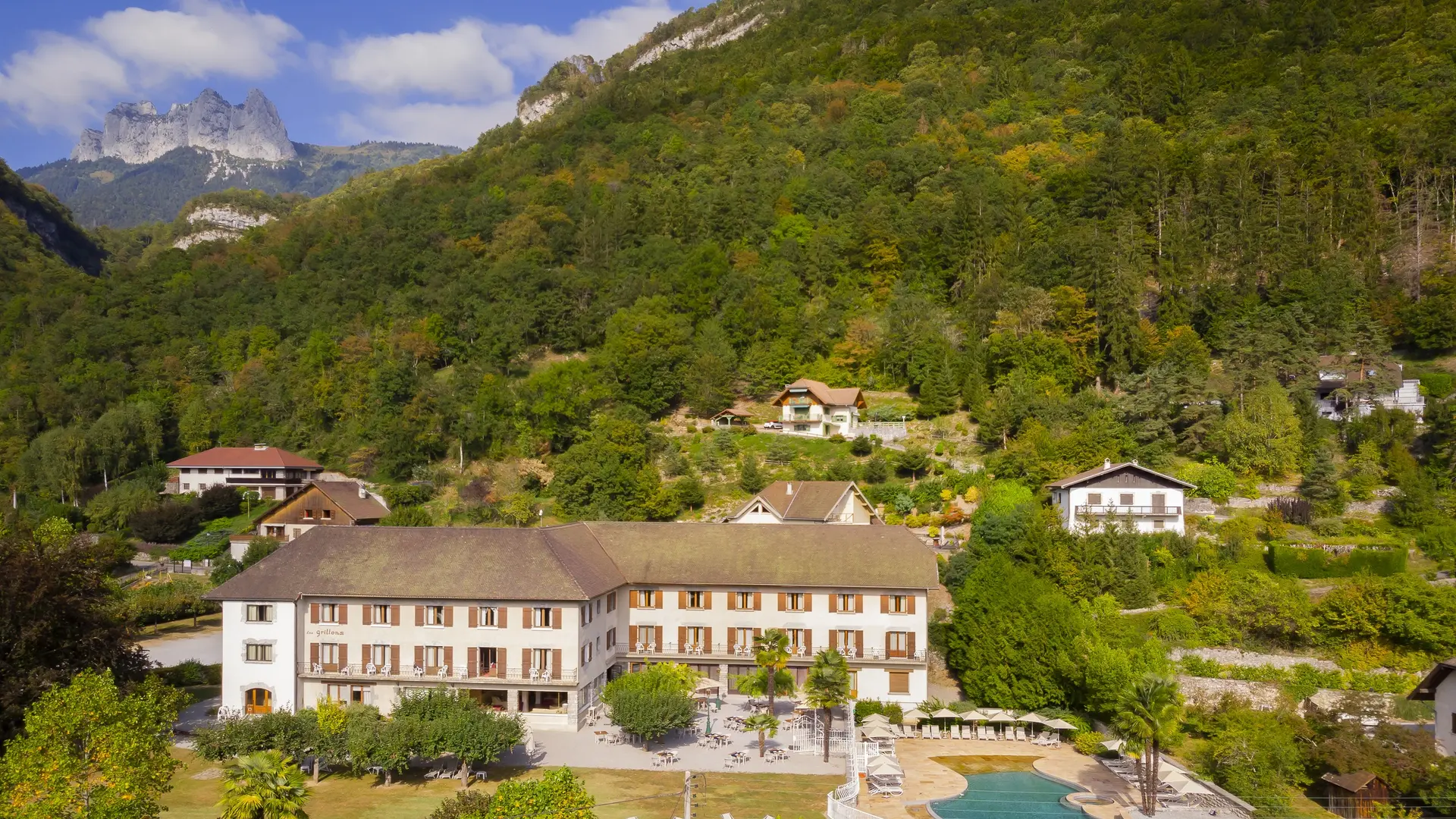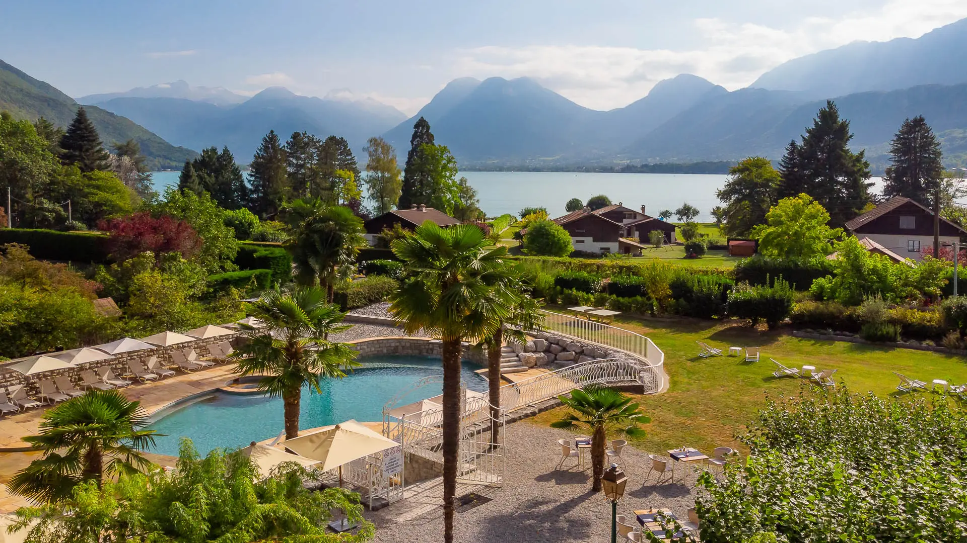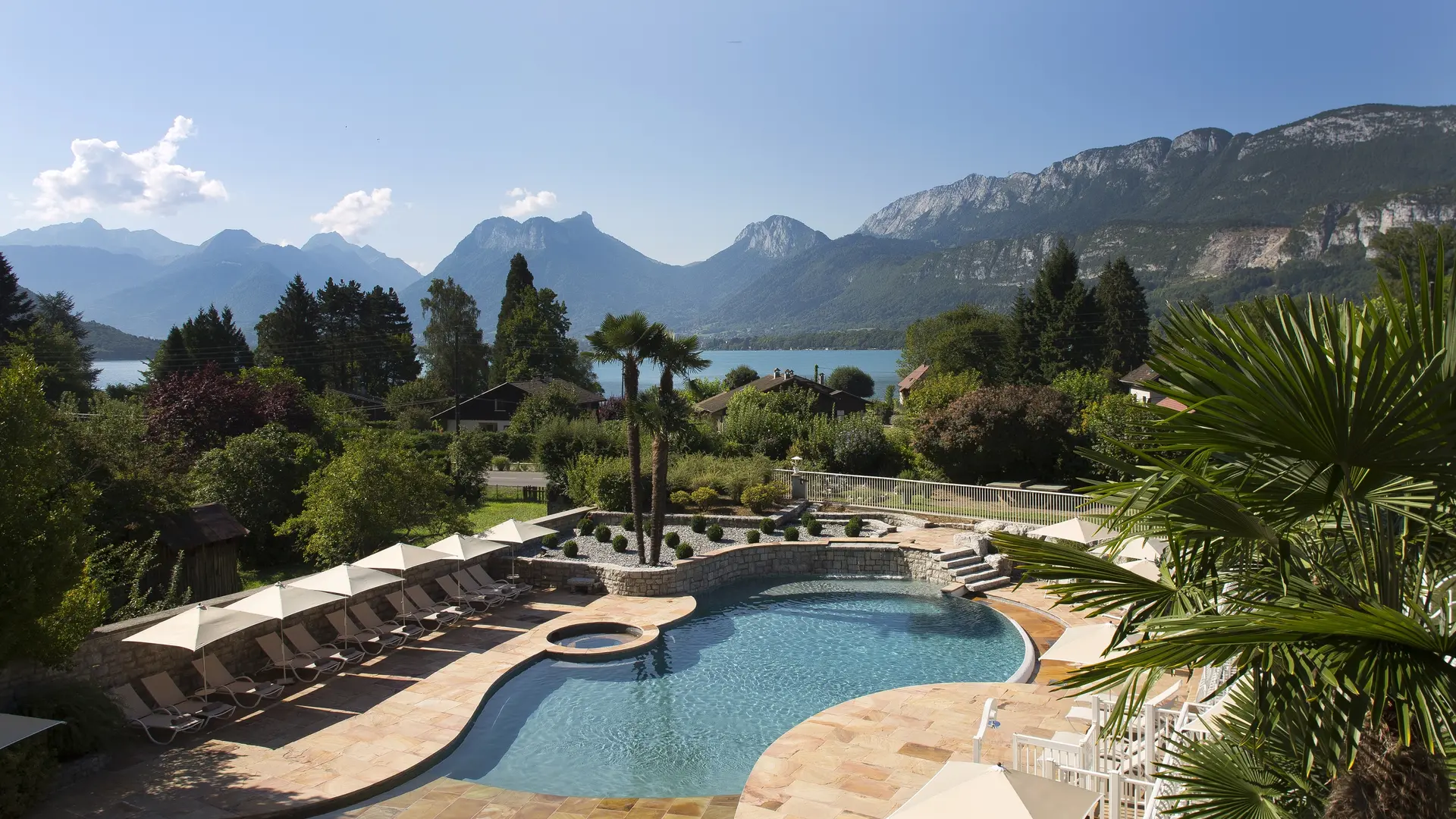 Genießen Sie mittags die naturbelassene Umgebung unserer Terrasse mit Blick auf den Pool und die Berge des Sees von Annecy oder lassen Sie sich in unserem eleganten Speisesaal nieder.