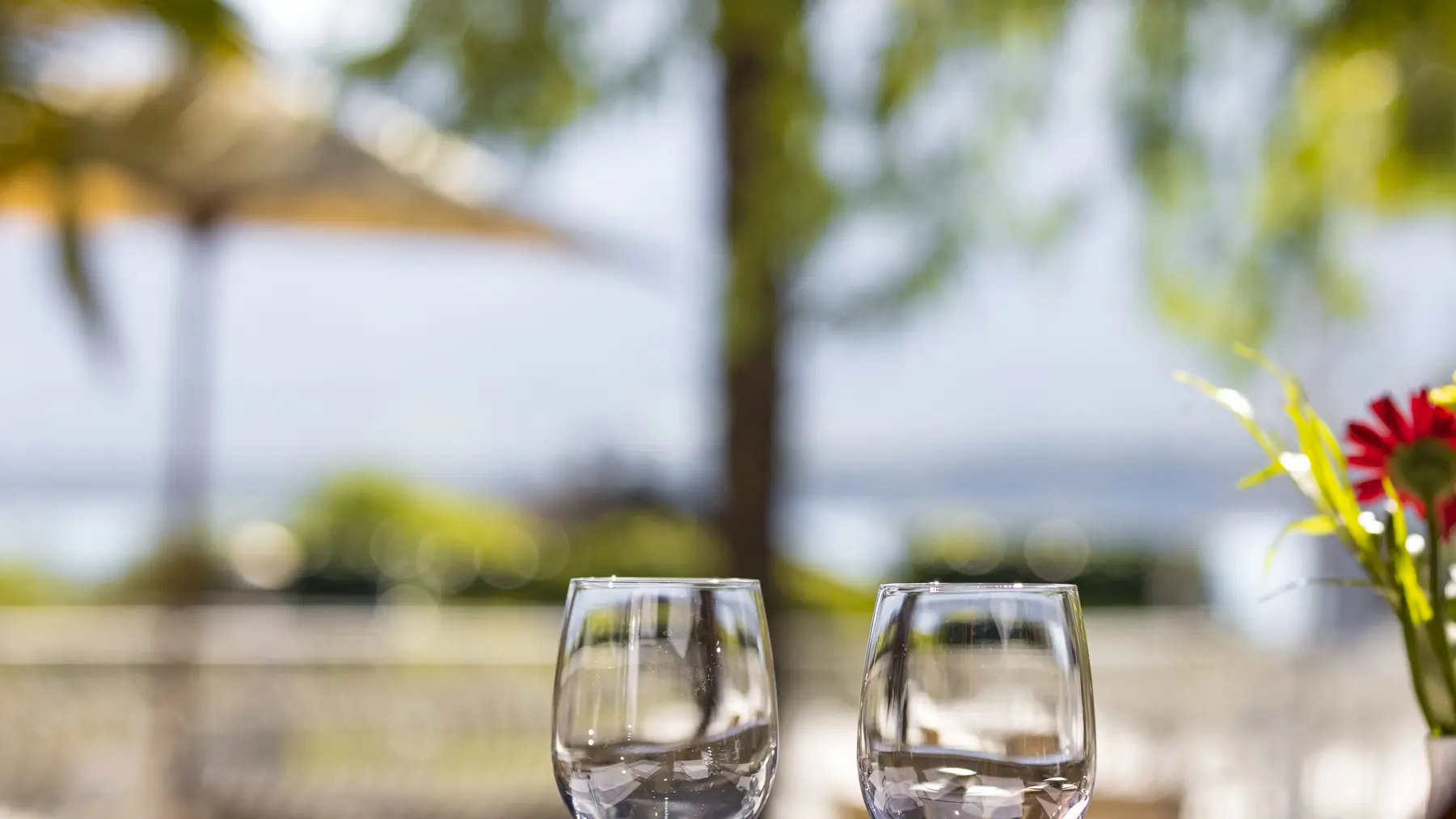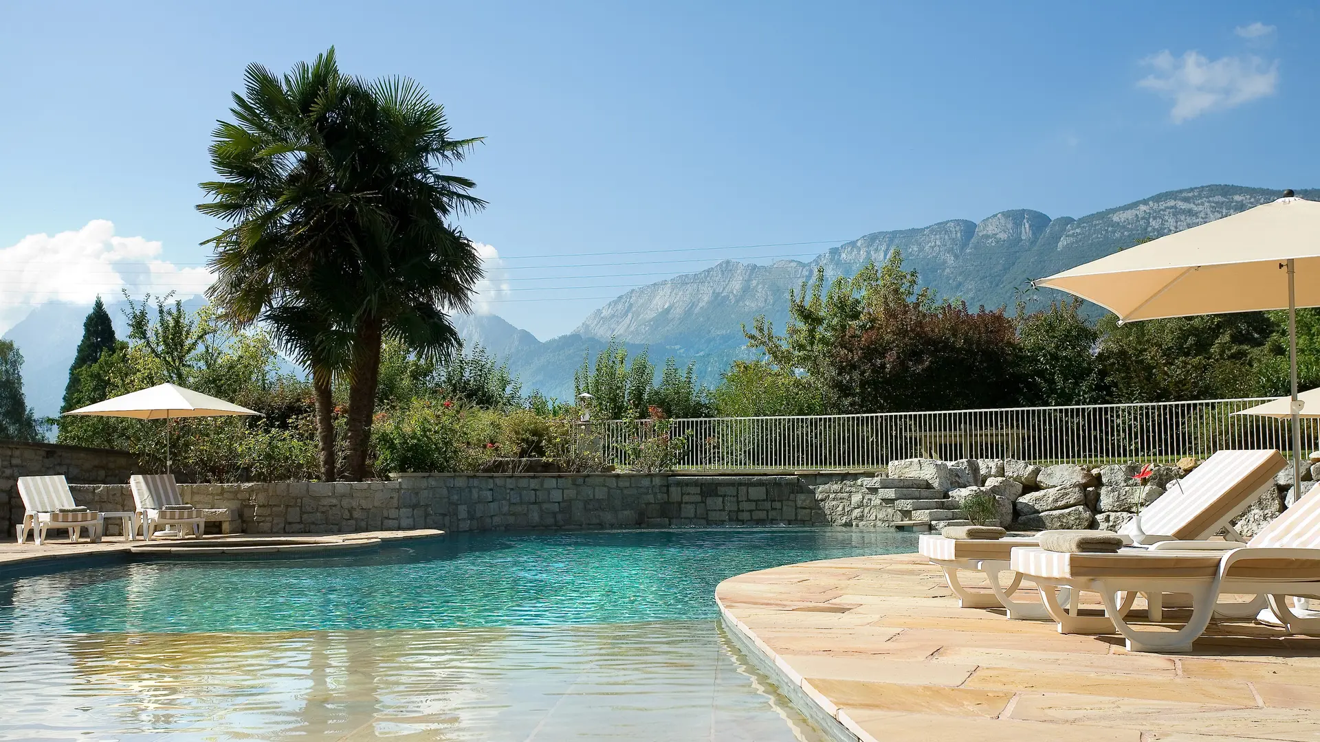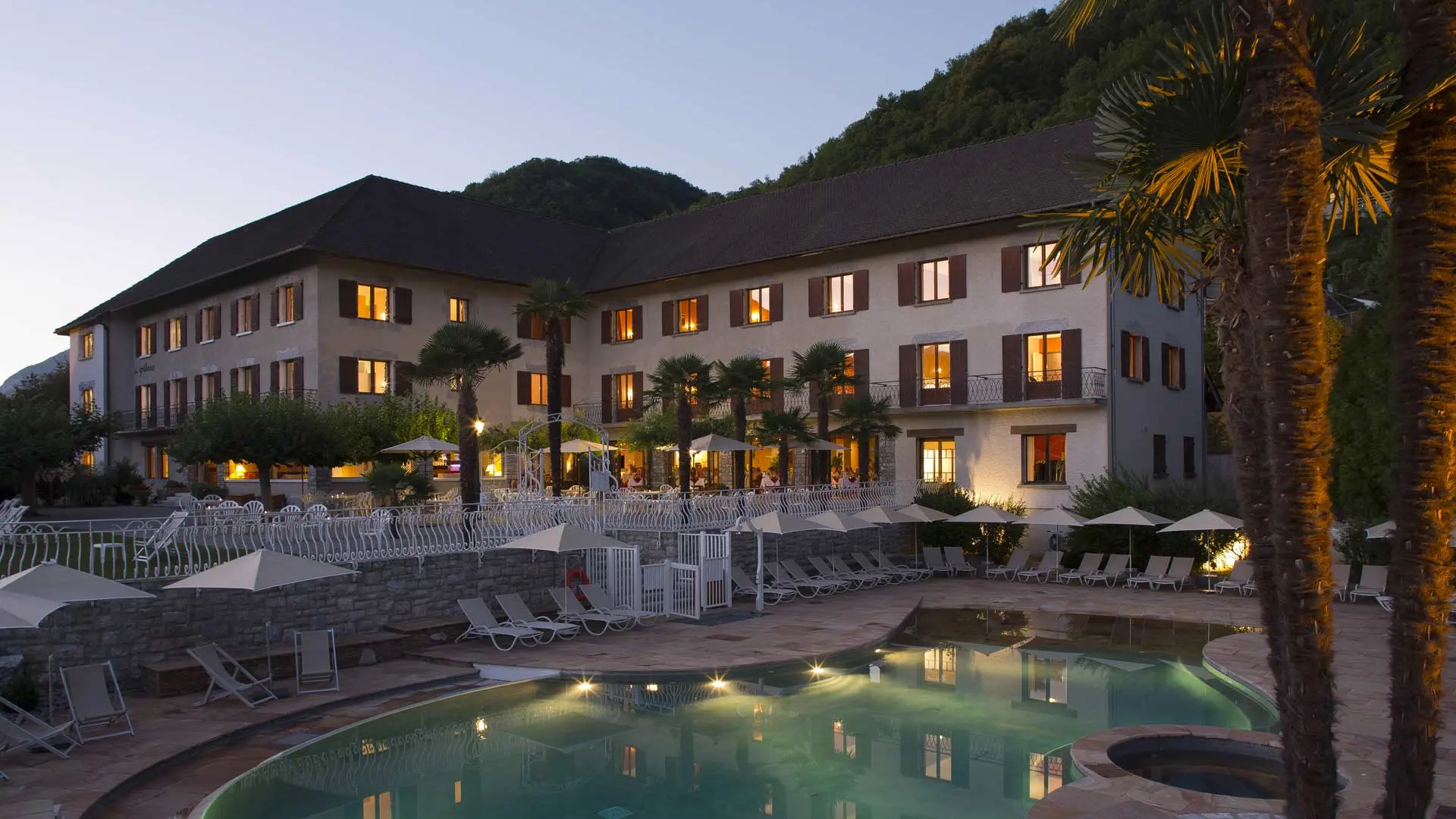 Genießen Sie mittags die naturbelassene Umgebung unserer Terrasse mit Blick auf den Pool und die Berge des Sees von Annecy oder lassen Sie sich in unserem eleganten Speisesaal nieder.