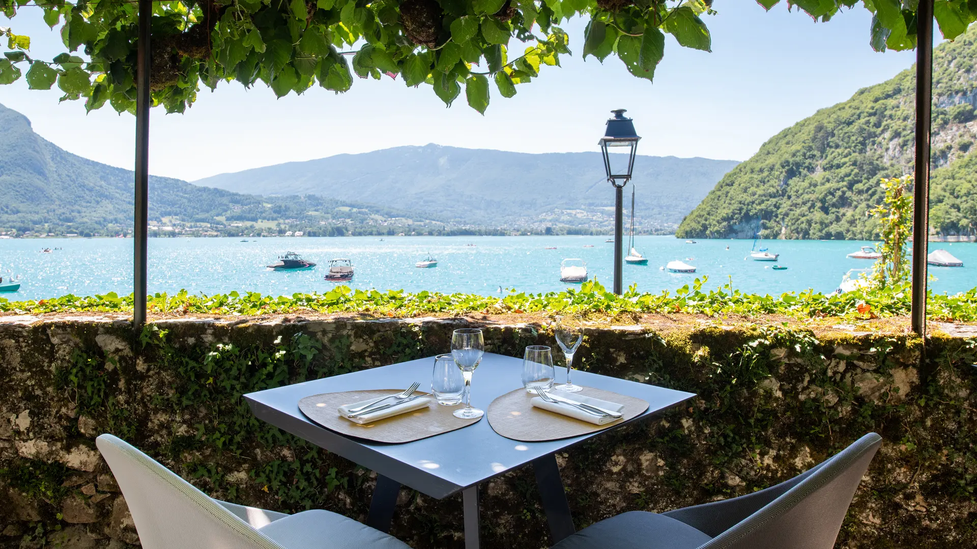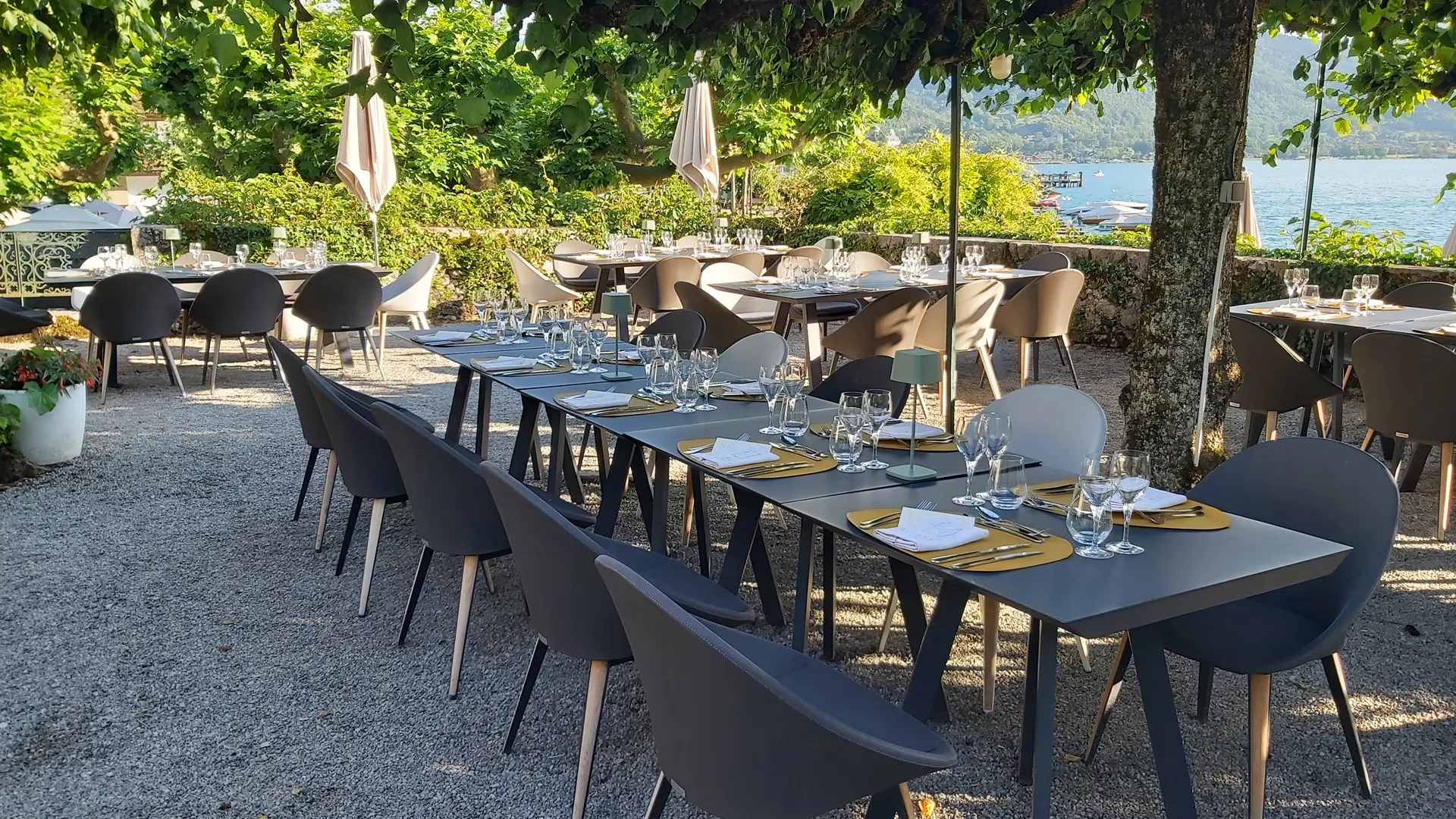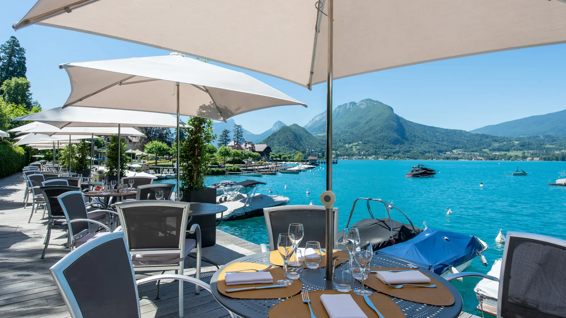 Sehr gute Küche, die im 2022 neu gestalteten Restaurant oder auf den schattigen Terrassen in unmittelbarer Nähe des Sees von Annecy serviert wird.
