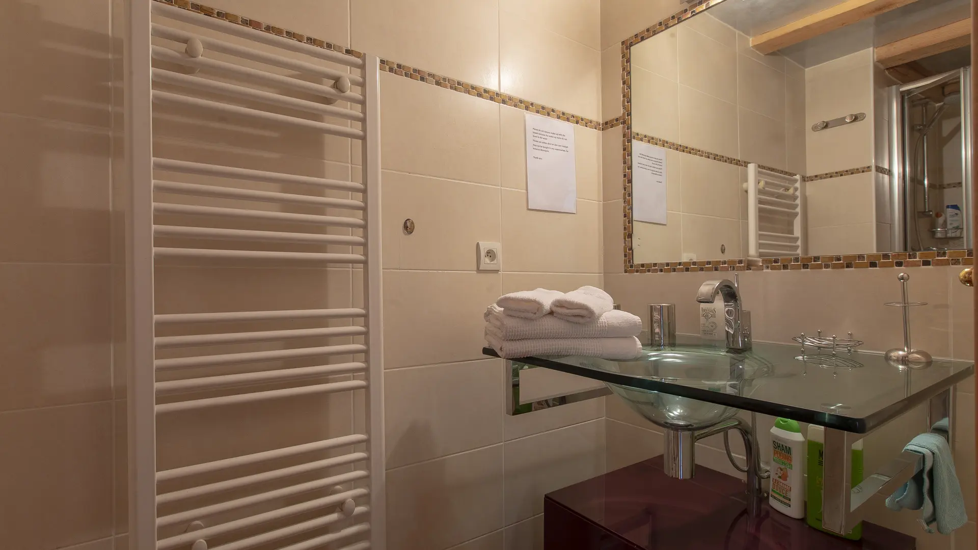 Eine hübsche Eingangshalle führt zum Schlafzimmer mit einem Badezimmer mit Duschkabine, Handtuchheizkörper und Haartrockner auf der einen Seite und einer separaten Toilette mit Handwaschbecken auf der anderen Seite.