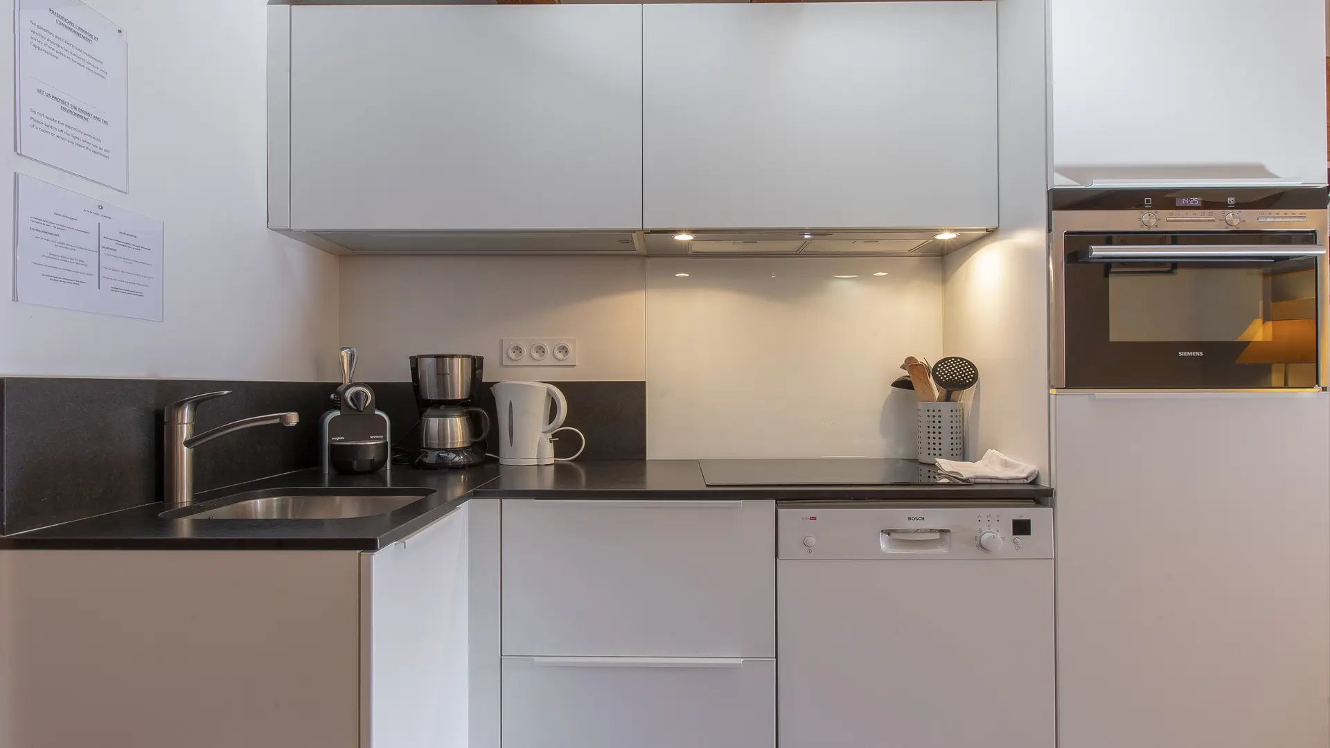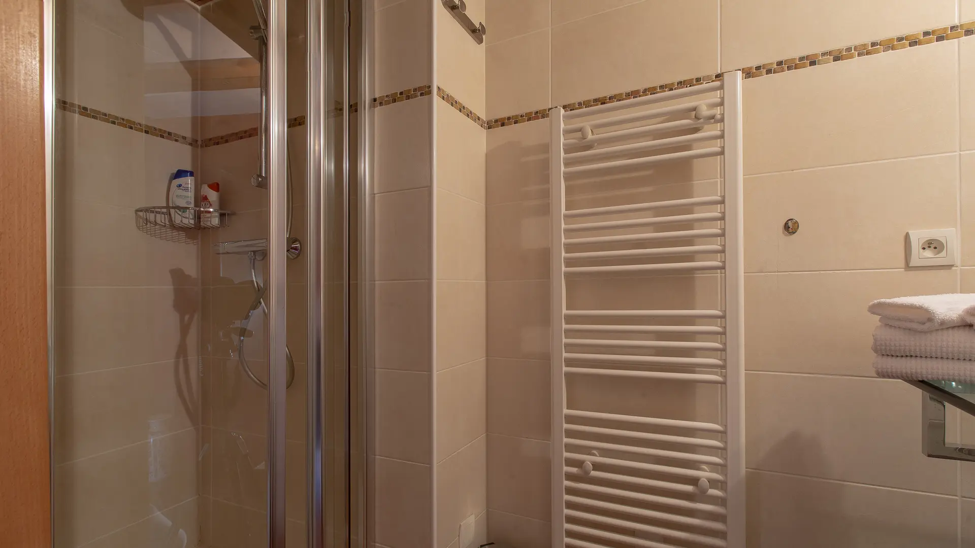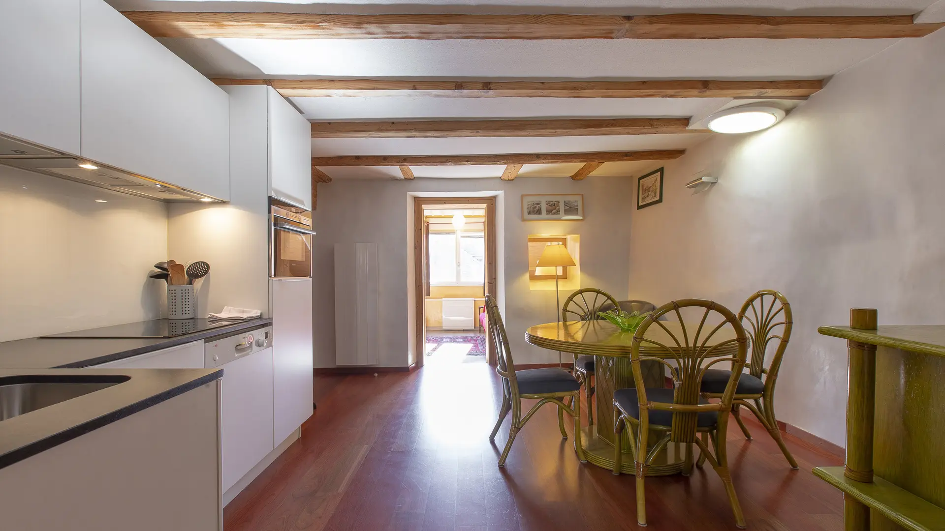 Wohnung (56 m²) im 3. Stock, beidseitig Fenster. Essküche (LCD-TV, DVD-Player), kleines Wohnzimmer mit Klappsofa (Rapido - 140 cm), 2 Sessel und TV, Schlafzimmer (1 Bett 180 x 200 cm oder 2 Einzelbetten), Badezimmer, separates WC.