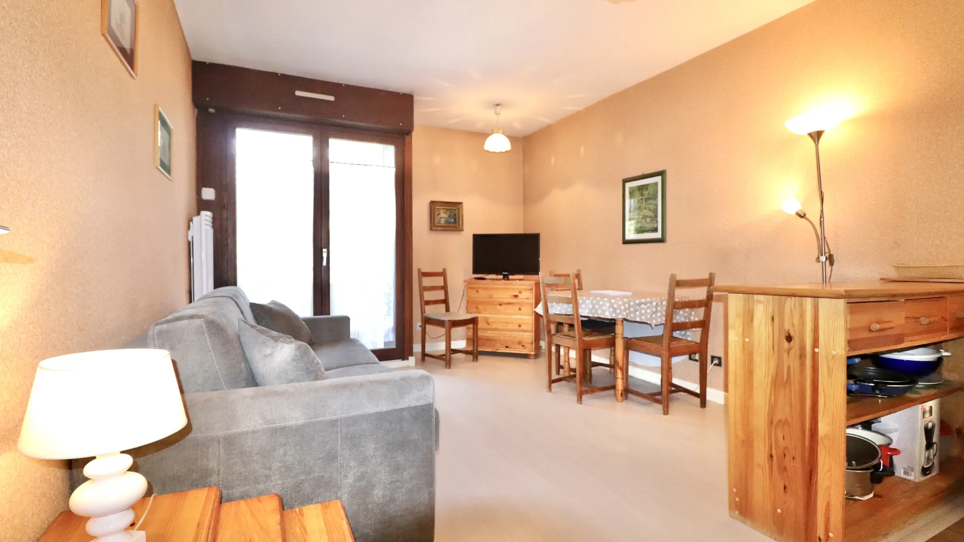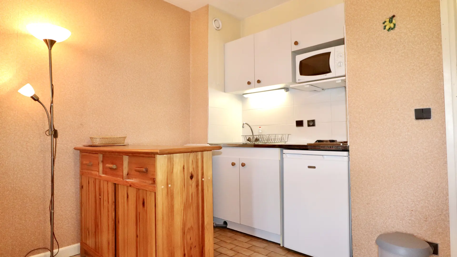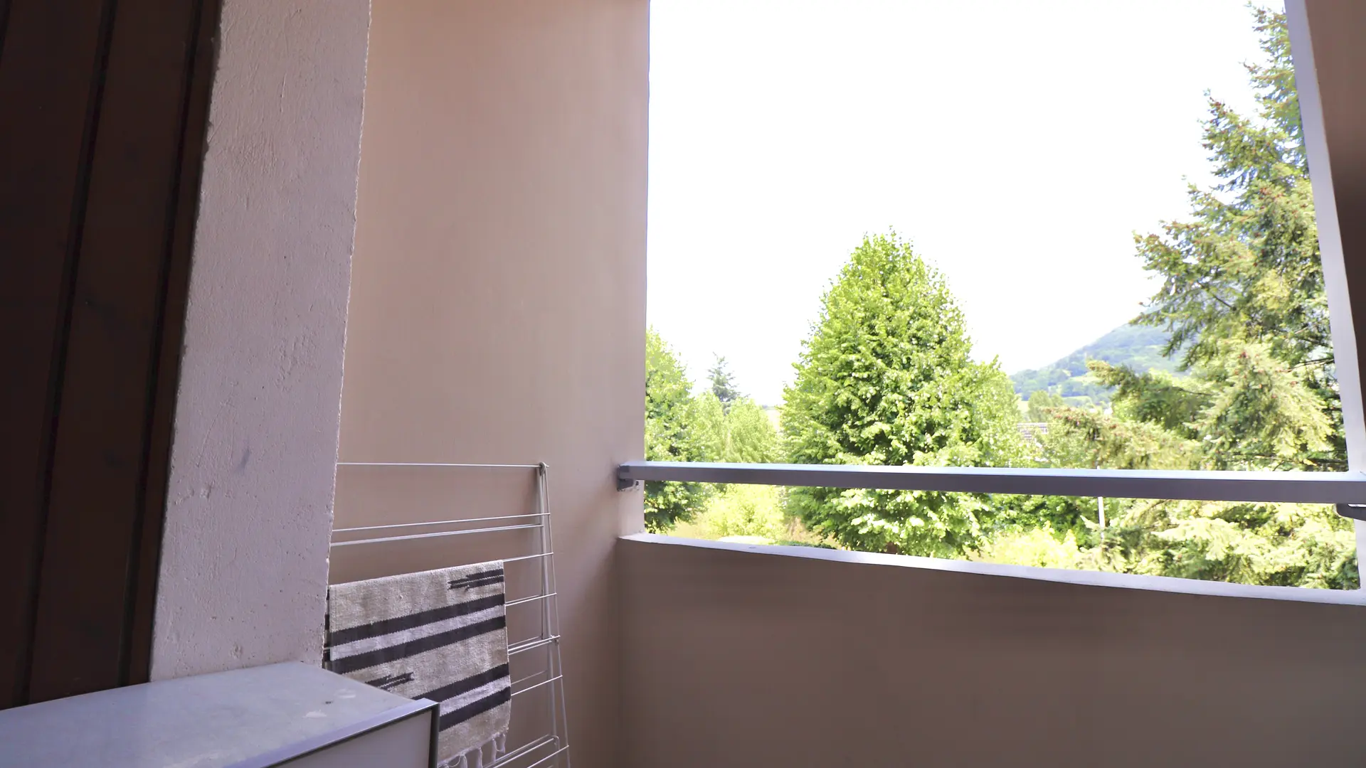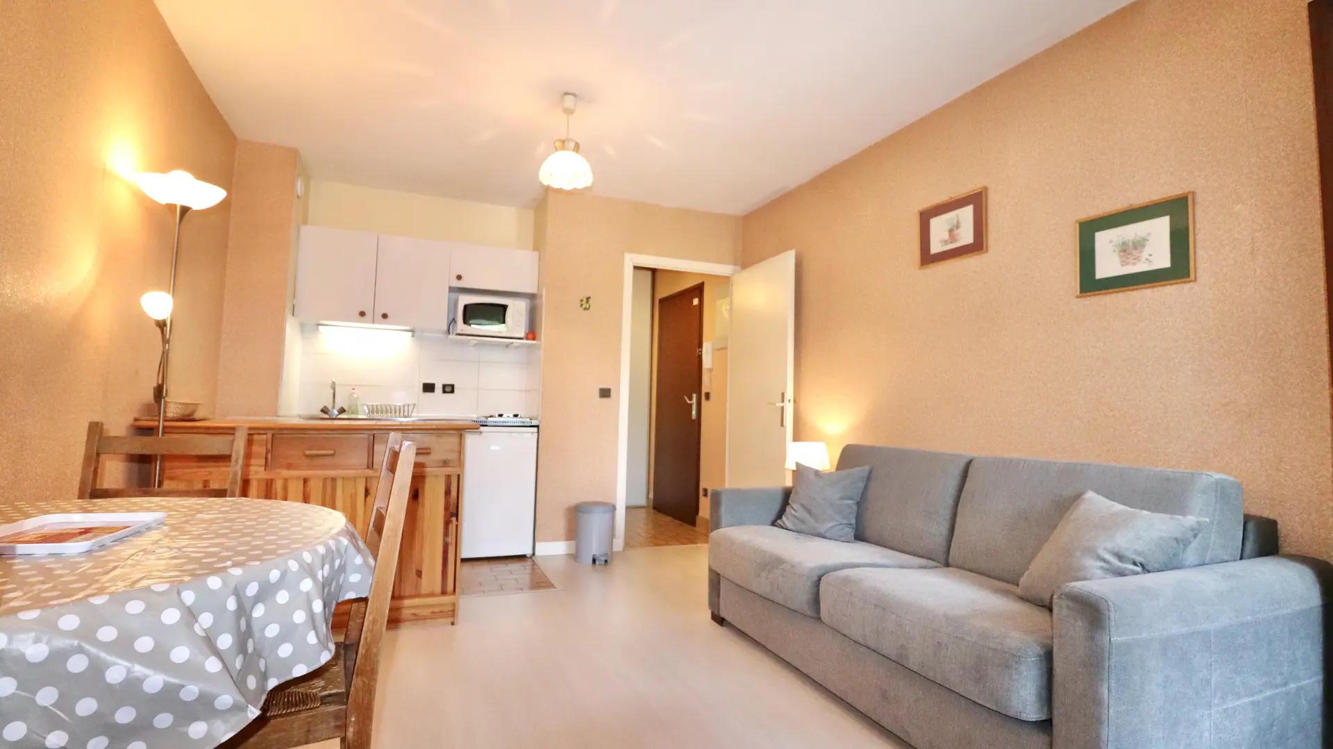 Der Hauptraum verfügt über einen echten Essbereich. Die Terrassentür sorgt für Helligkeit in der Wohnung und öffnet sich zu einem kleinen überdachten Balkon. Ihre persönlichen Sachen können Sie im Schrank im Flur aufbewahren.