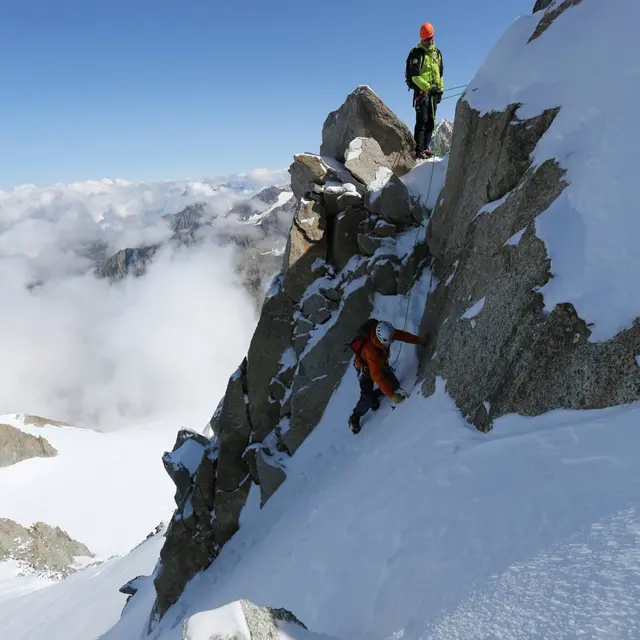 Jetzt ist der Zeitpunkt gekommen, an dem Sie das, was Sie an den vorherigen Tagen gelernt haben, anwenden können! Das Ziel wird mit Ihrem Bergführer je nach den Zielen der Gruppe und den aktuellen Bergbedingungen ausgewählt. Beispiele für durchgeführte Touren: Pointe Lachenal (3 613m), Traversée de Aiguilles Crochues (2 840m).