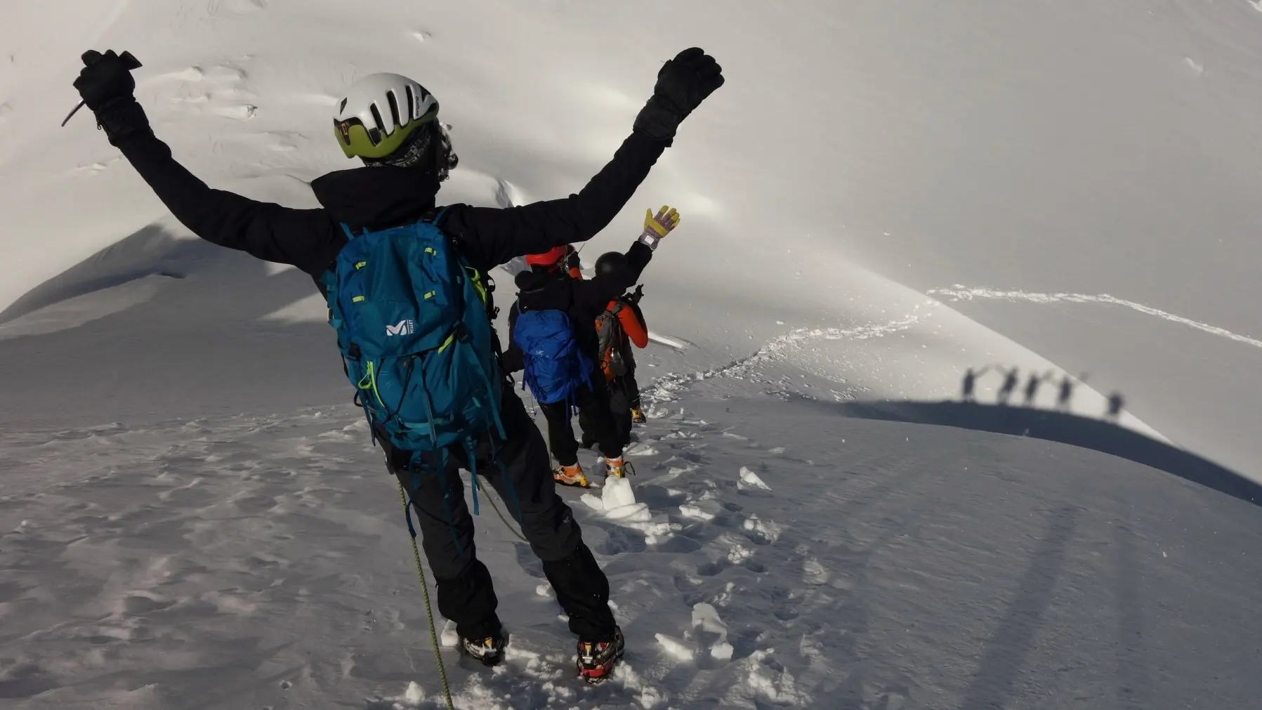 Erste Annäherung oder Wiederholung: Erlernen der verschiedenen Techniken, die für das Gletschergelände spezifisch sind: klassisches Steigeisen mit 10 Zacken, angeseilte Entwicklung, Sicherung.