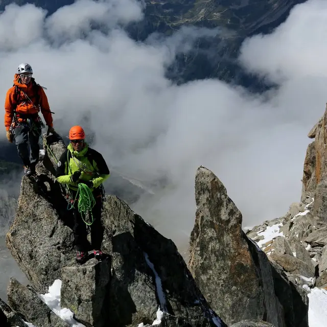 Kontaktaufnahme mit Ihrem Bergführer, technische und klettertechnische Grundlagen. Sichern des Vorsteigers, Einrichten einer sicheren Moulinette. Aufstieg von Seilschaft zu Seilschaft im Reversible: Einrichten einer Seilschaft, Abseilen.