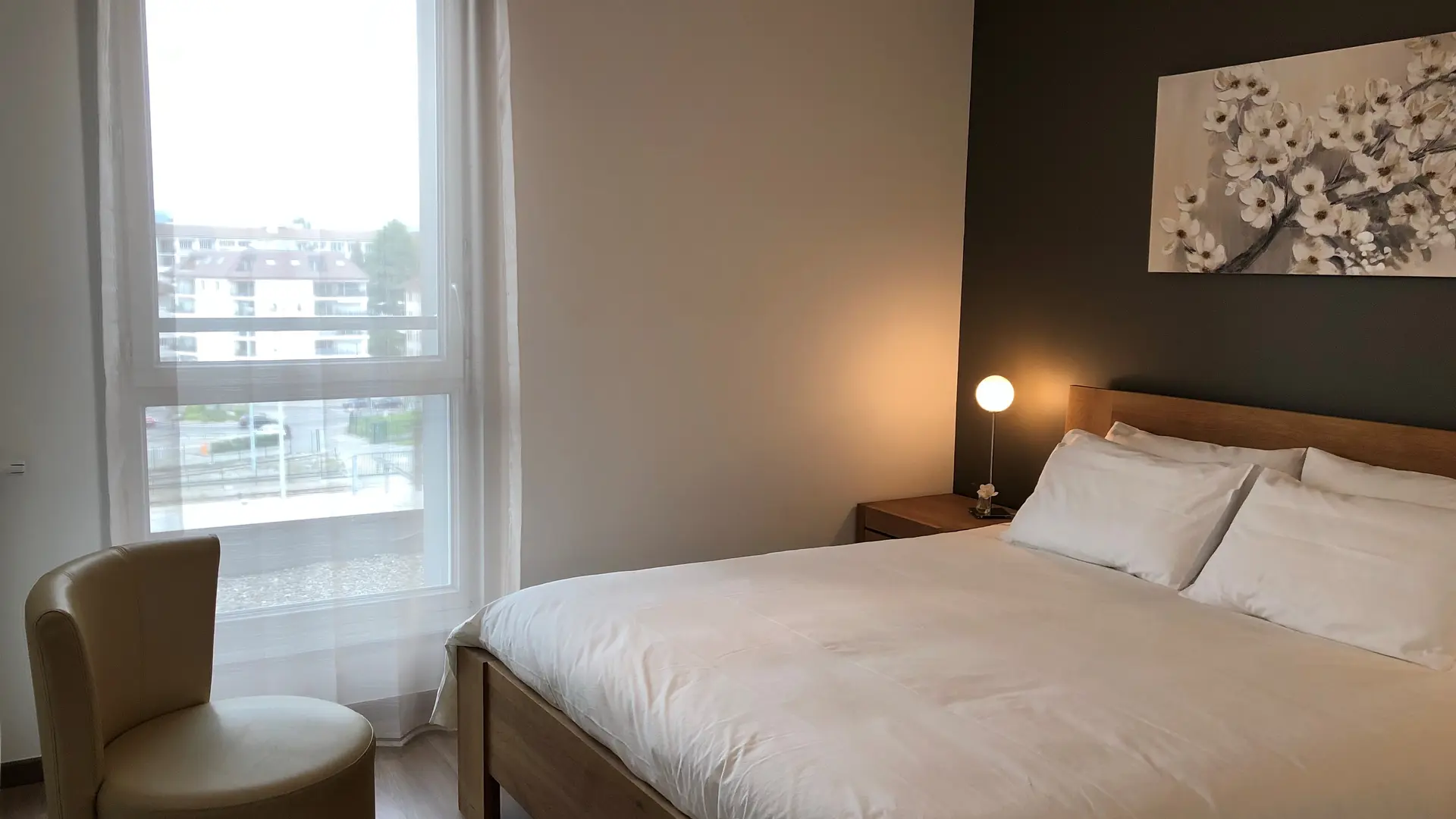 Innenstadt von Annecy, 80 m bis zum Bahnhof. 2-Zimmer-Wohnung. Terrasse. Geschlossene Garage. Grünflächen. Eigentümergemeinschaft. Freie Aussicht. Letzte Etage. 2 bis 4 Personen. Amerikanische Küche mit vollständiger Ausstattung. Schlafzimmer mit 160 x 200 cm Bett. Schlafsofa im Wohnraum mit 140 x 200 cm. Fernseher. W-Lan.