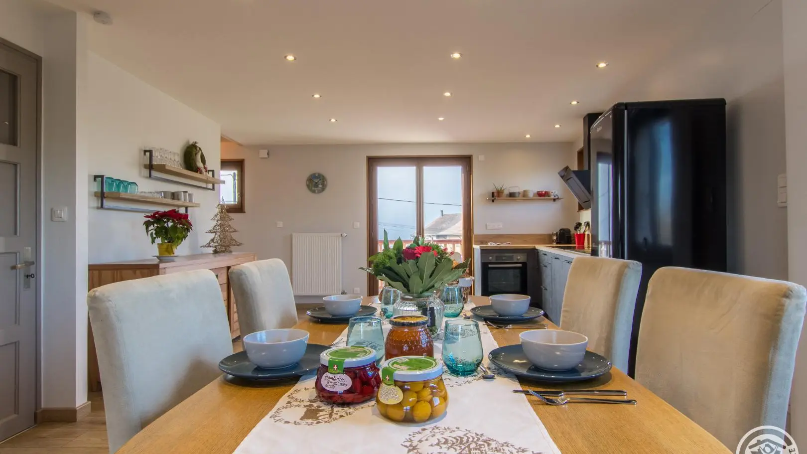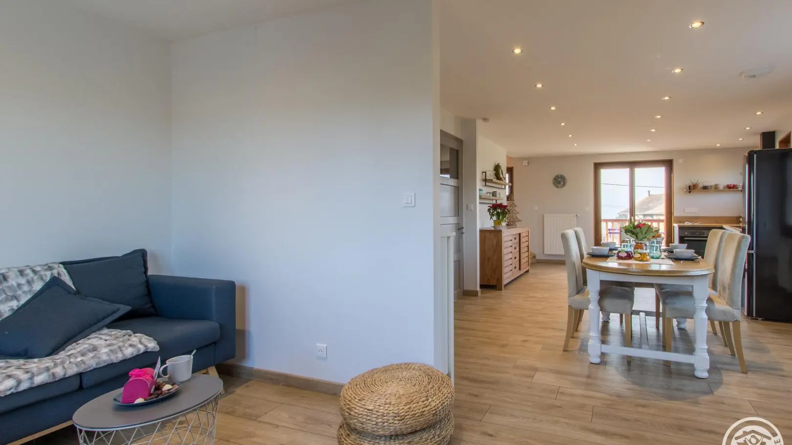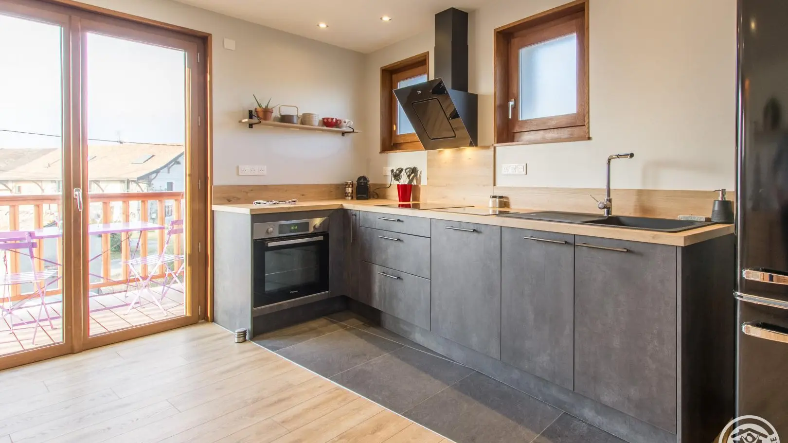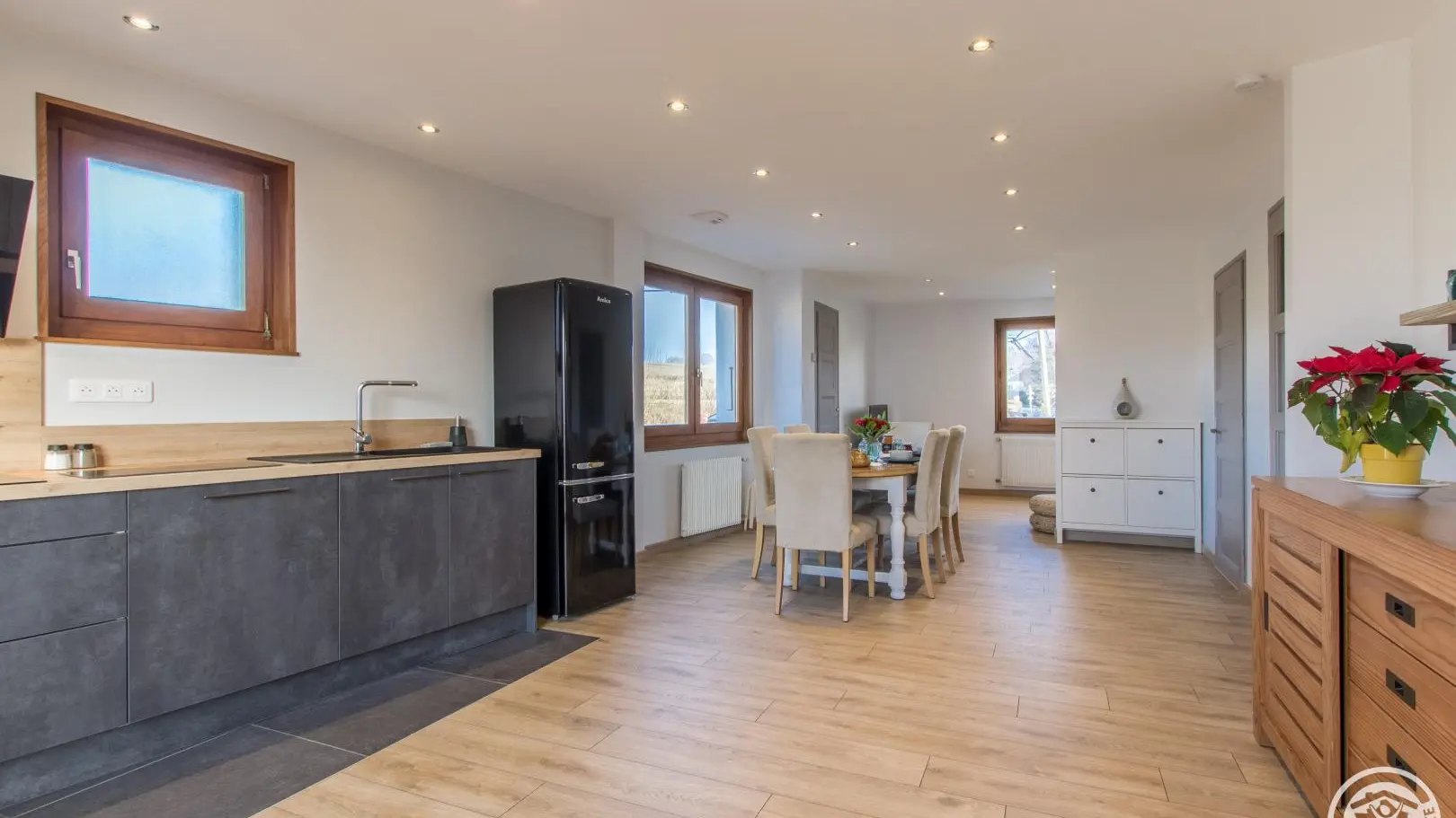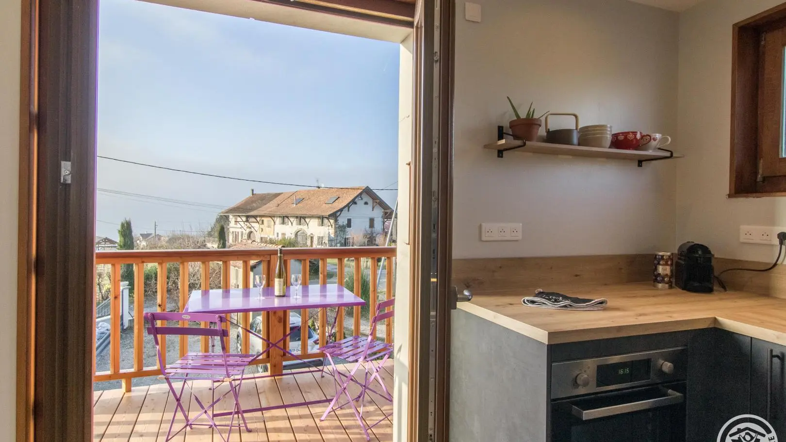 1st floor: fitted kitchen open to the dining area and the living room (corner sofa, television), balcony with garden table, view of Lake Geneva. Small shower room/wc.