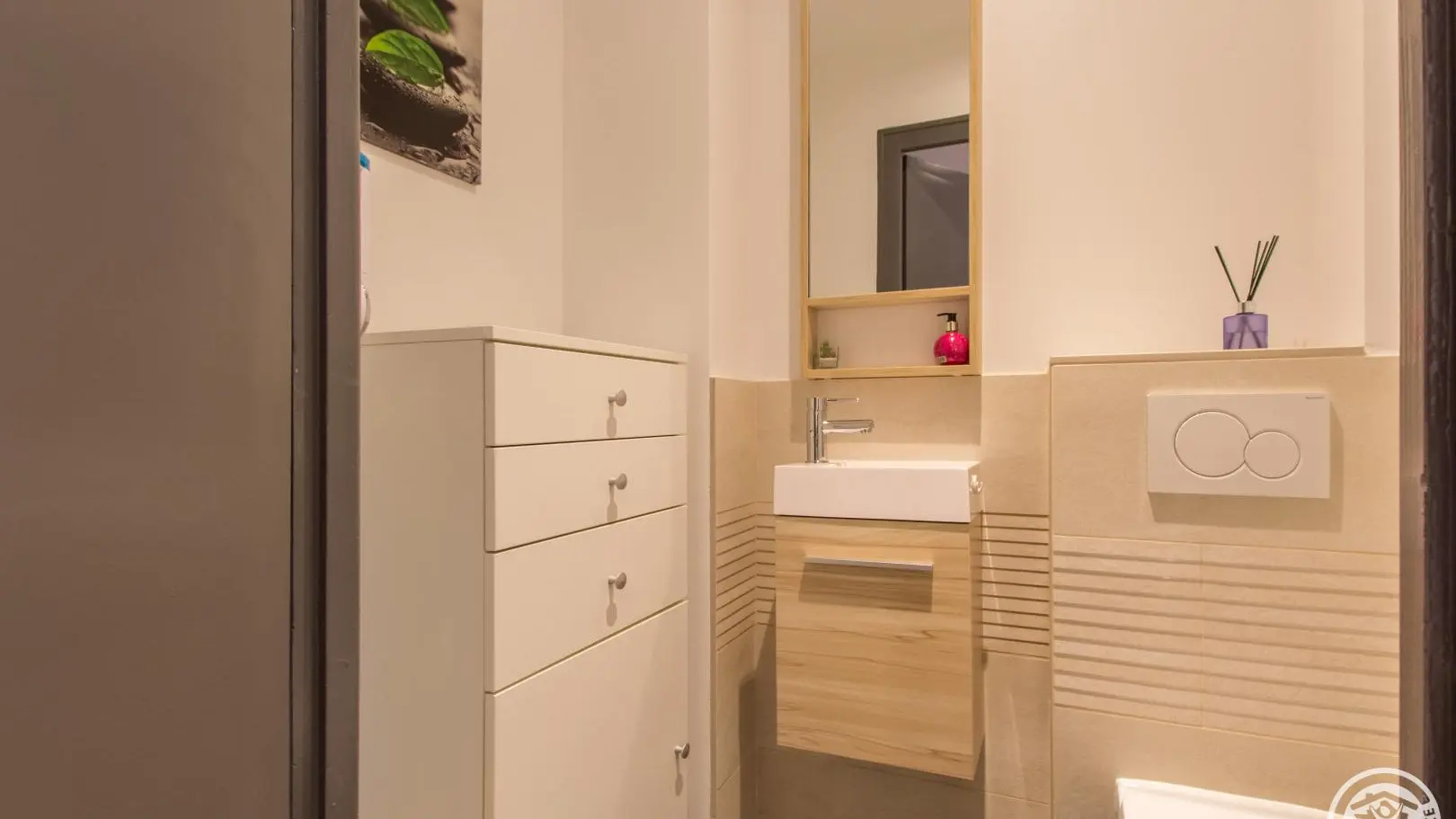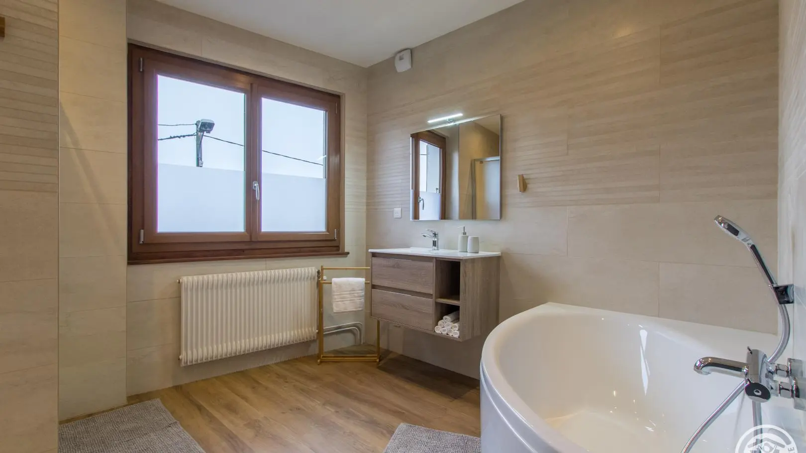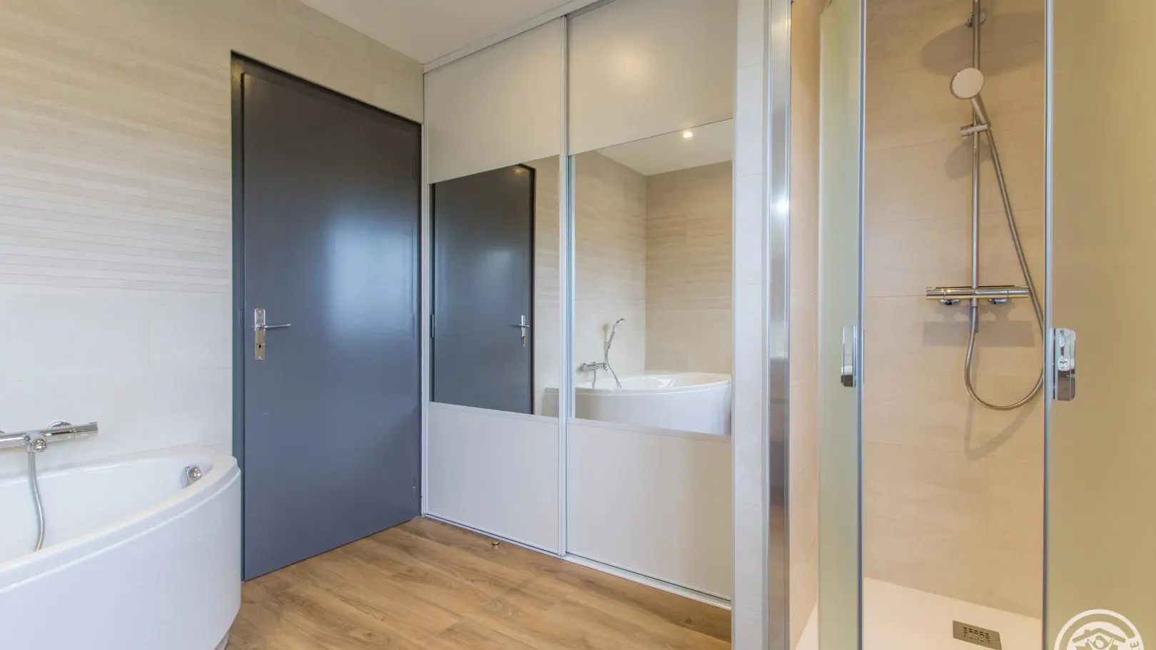 2nd floor: bedroom 1 (1 bed 160x200cm separable into 2 beds 80cm, tv), bedroom 2 (2 beds 90x200cm), large bathroom with shower and bathtub. 1 separate toilet with washbasin.