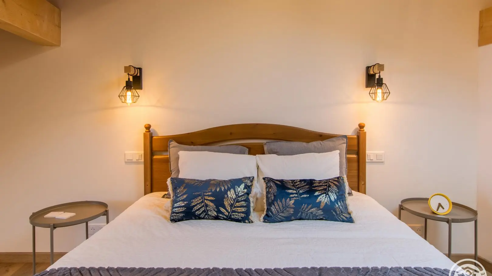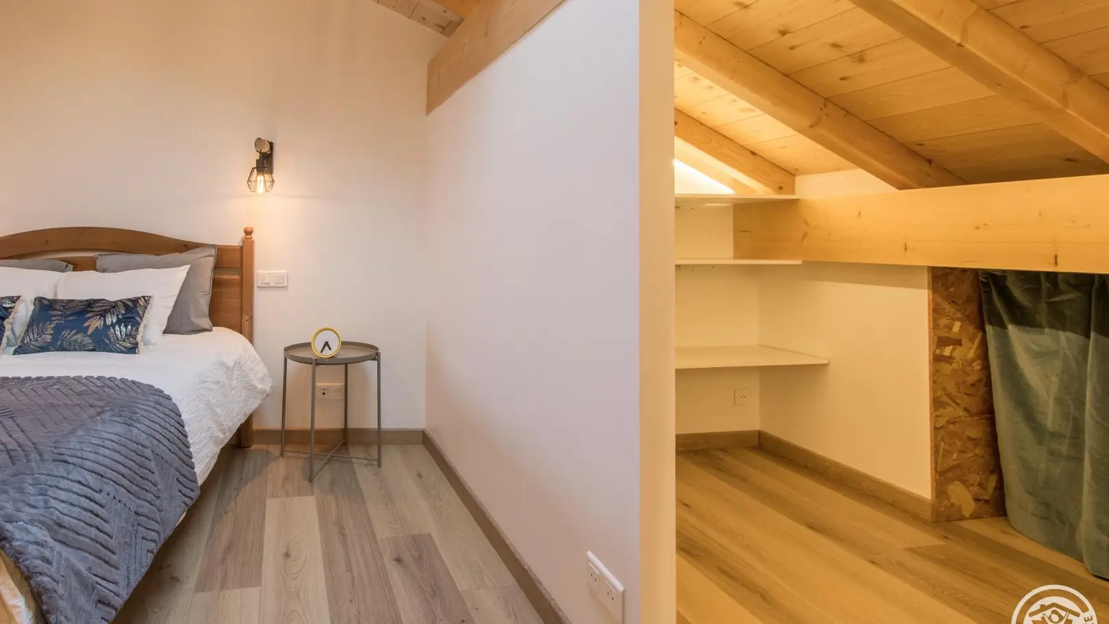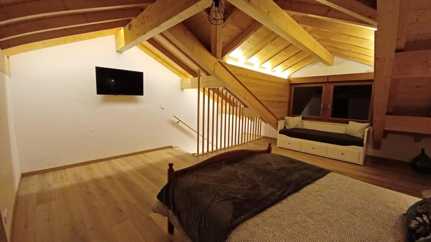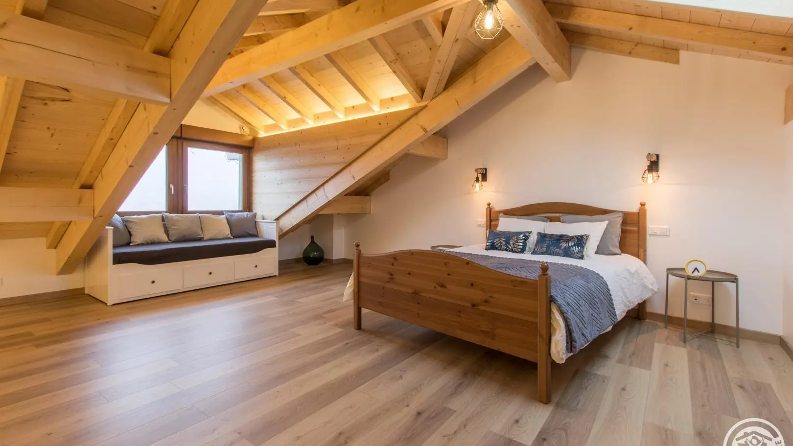3rd floor: large bedroom 3 (1 bed 160x200cm with 2 mattresses 80cm reclining separately, tv, sofa bed 160cm, storage, view of Lake Geneva.