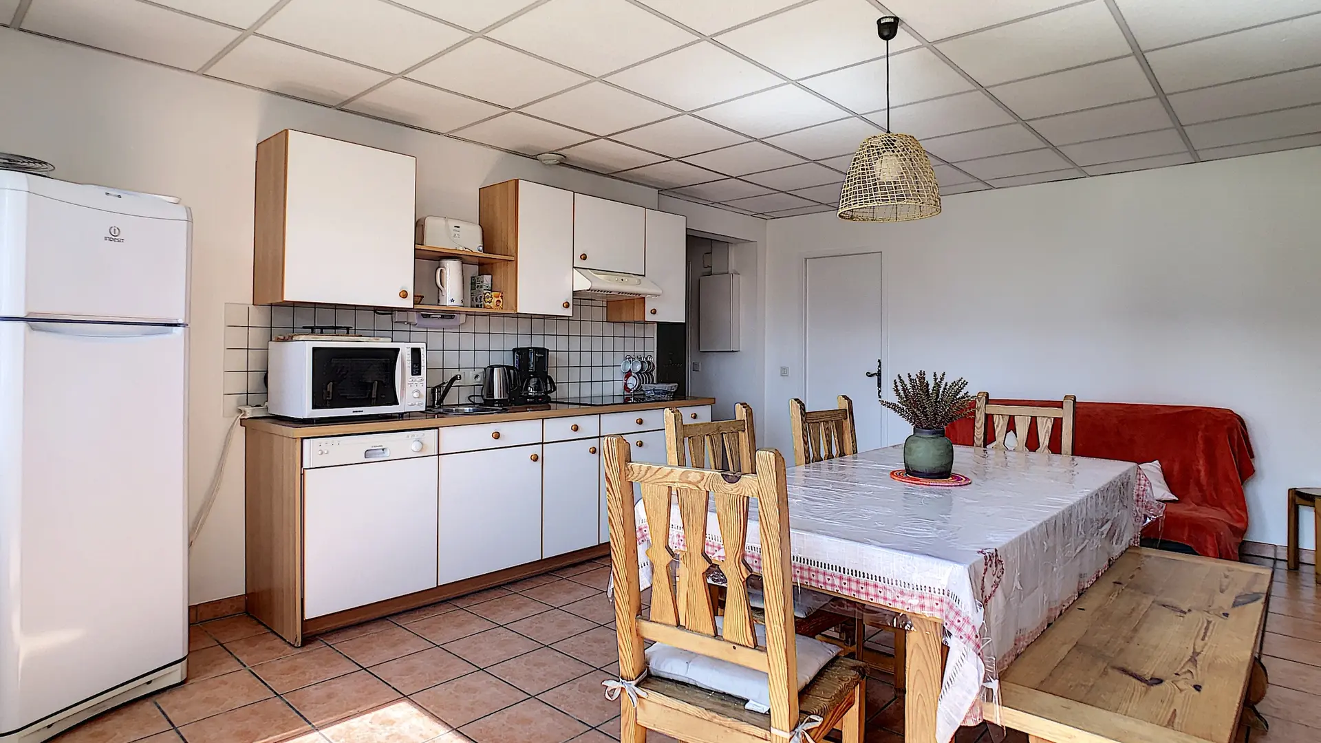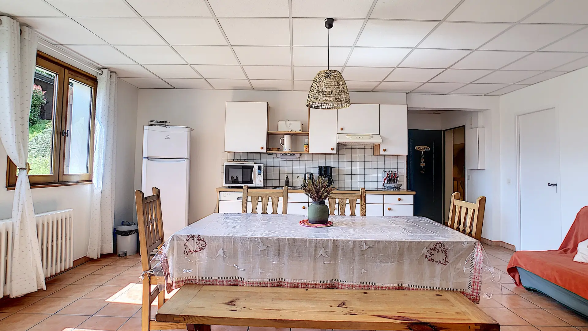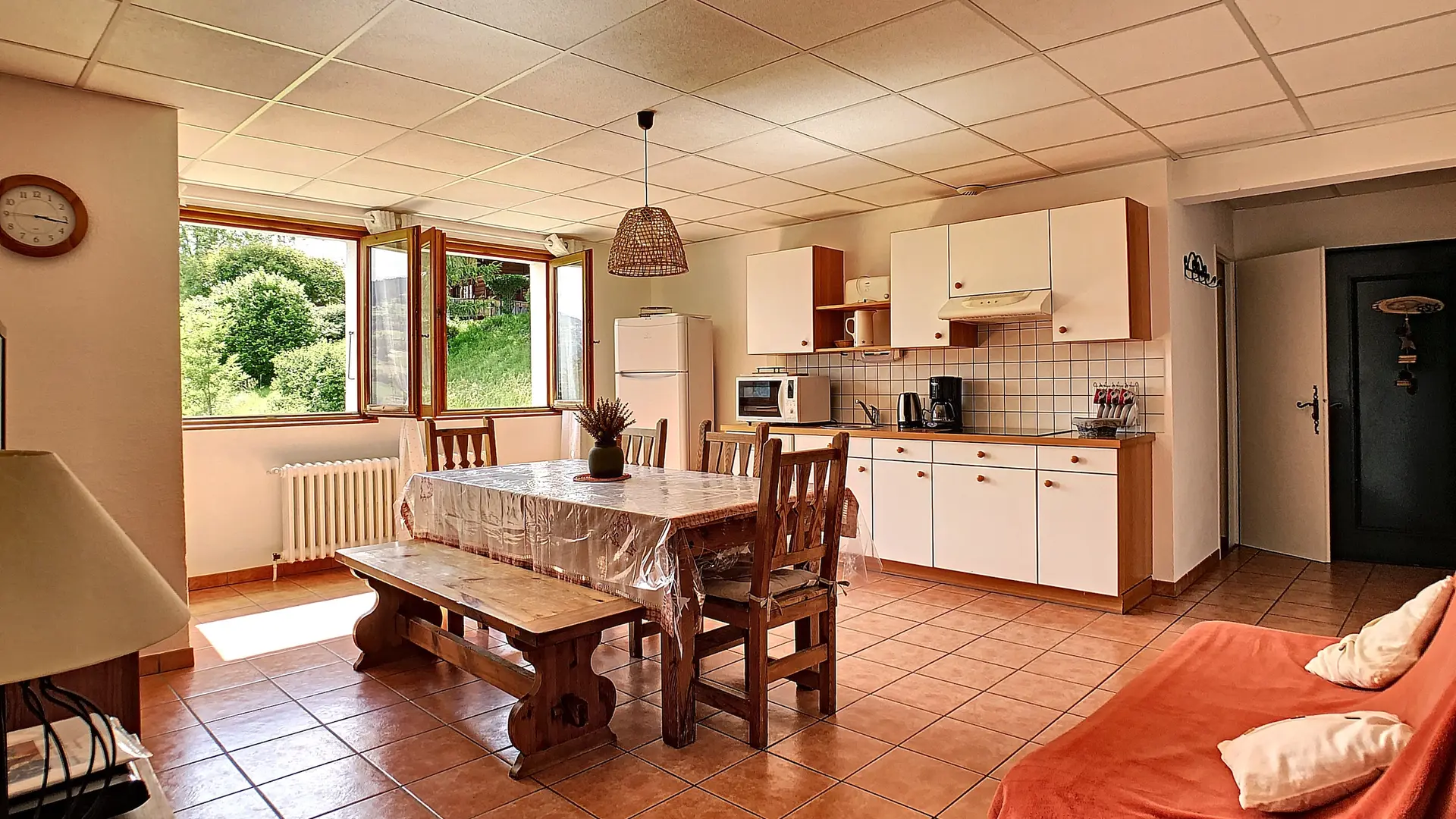 Dans cet appartement, la cuisine est ouverte sur la pièce principale (table à manger, coin canapé/télévision).