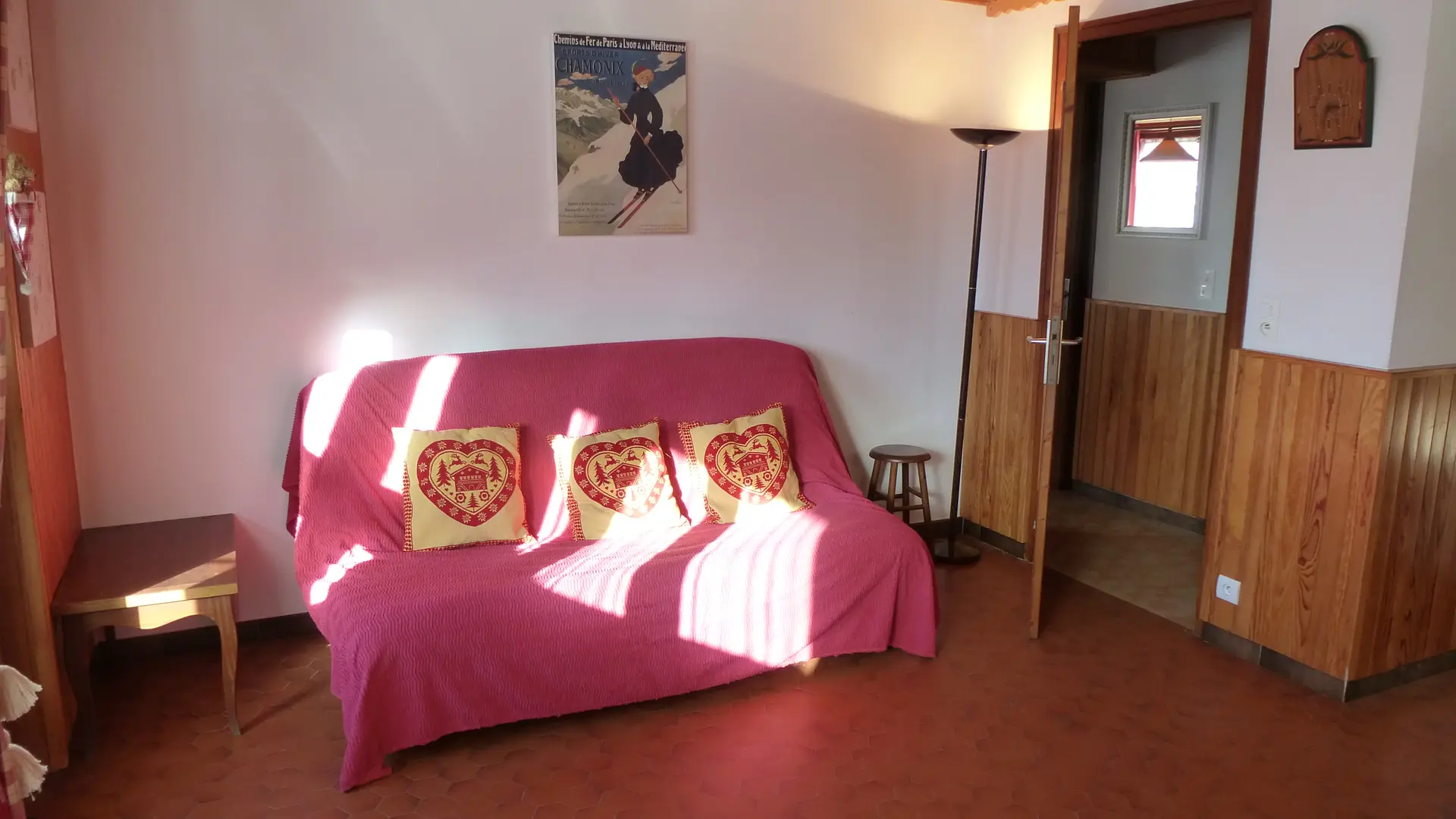 Living room / dining roomwith table and bench + a 2 people sofa bed and TV.
