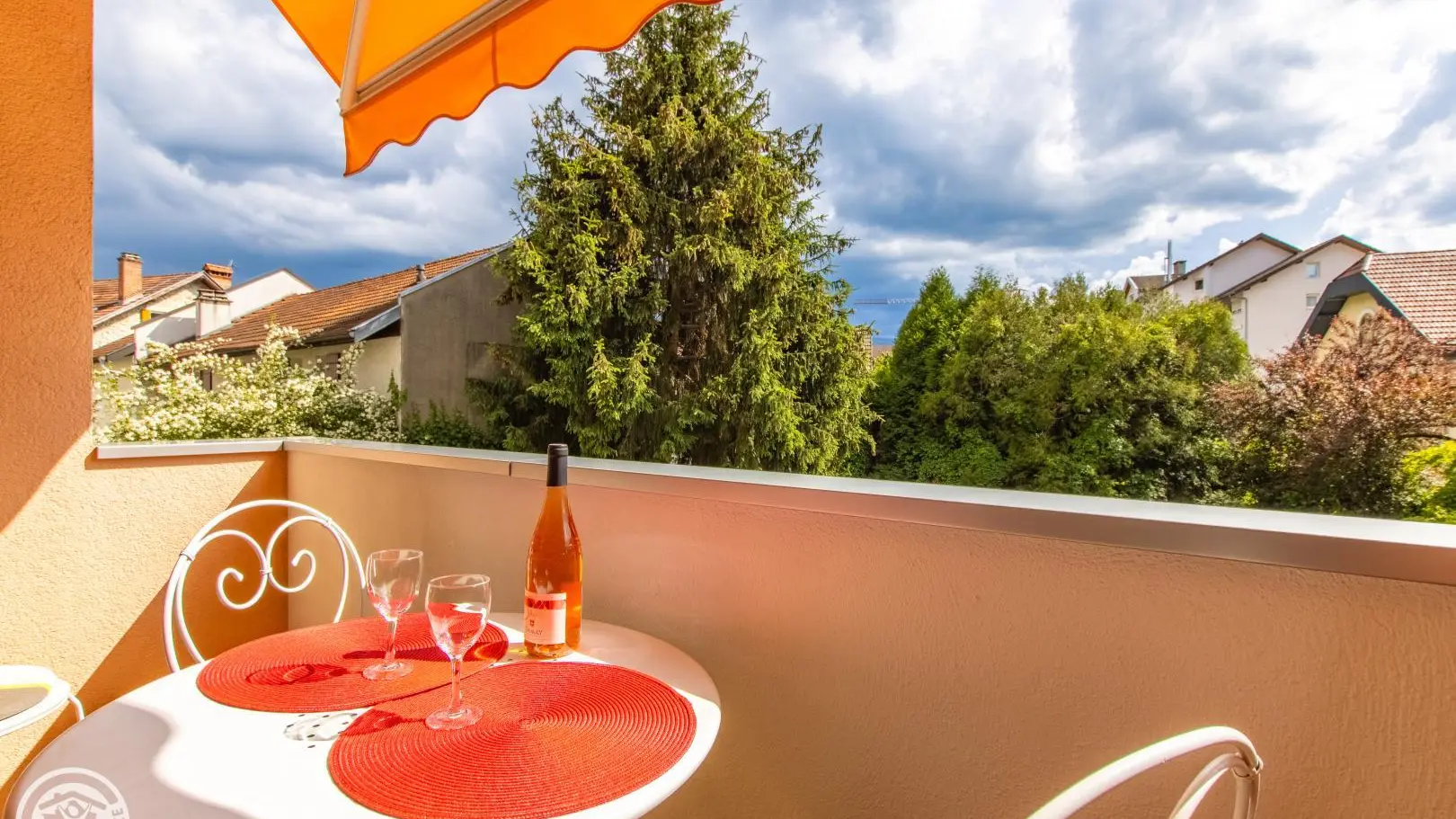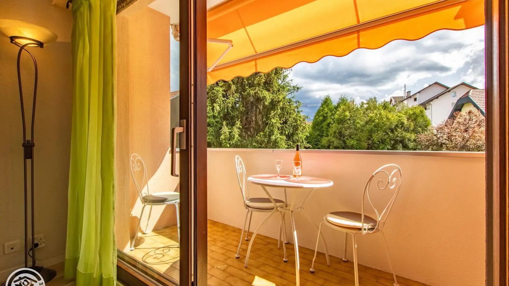 Quiet balcony with blind, garden furniture for 2 people.