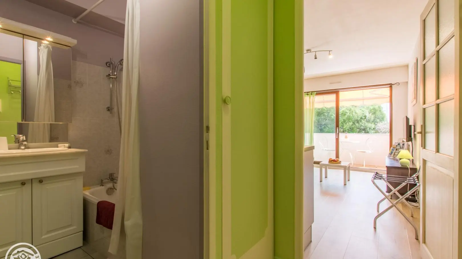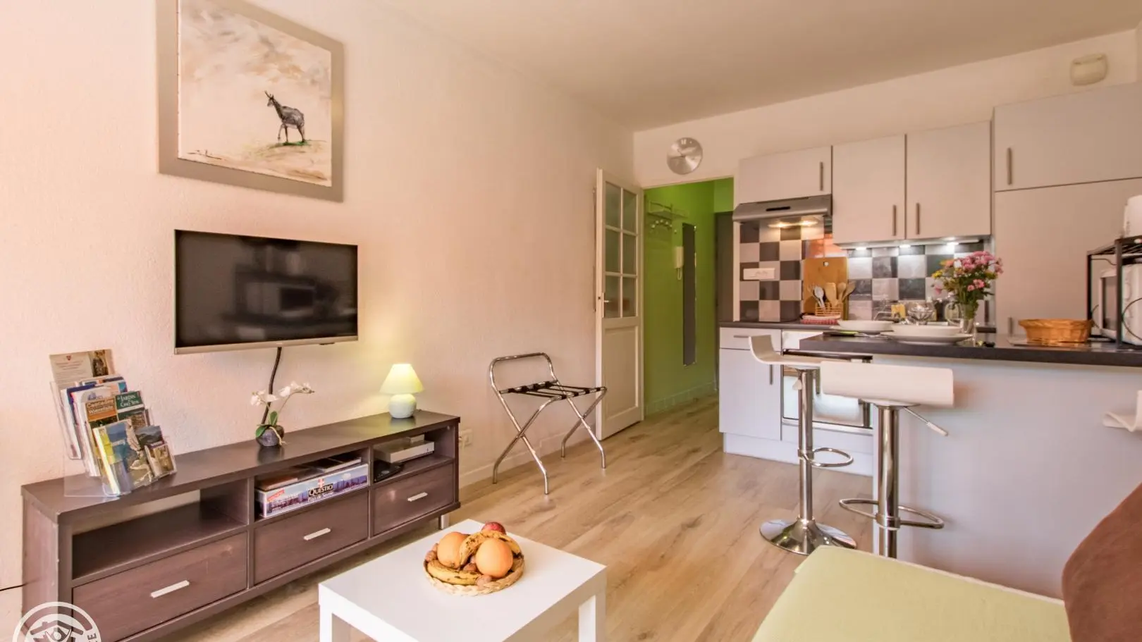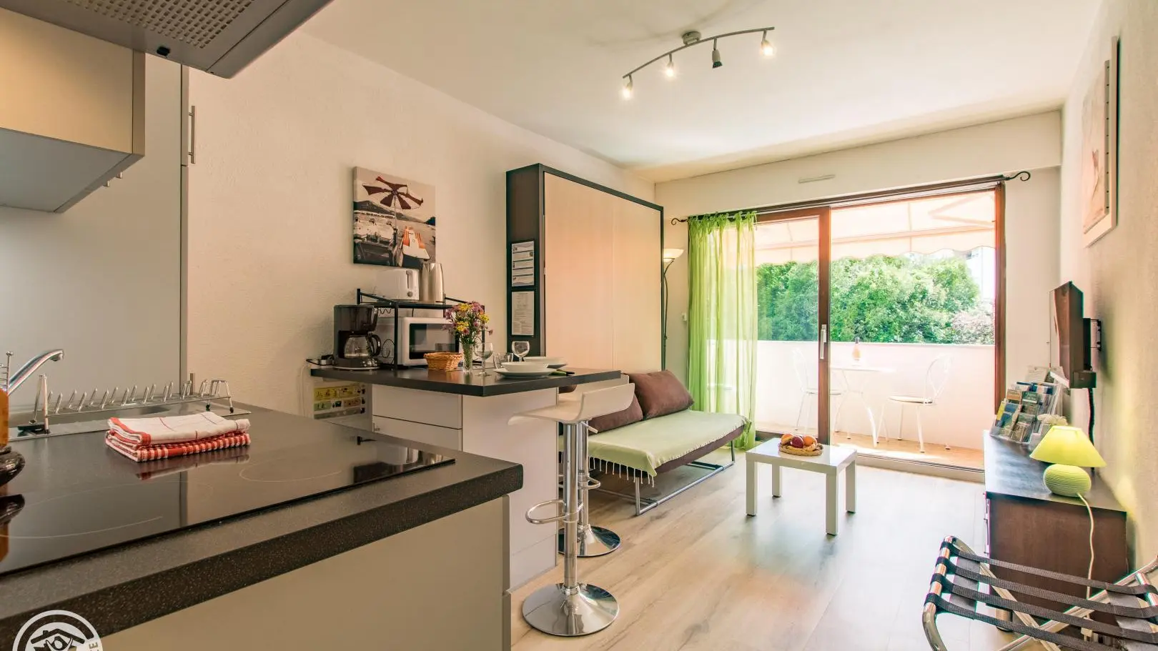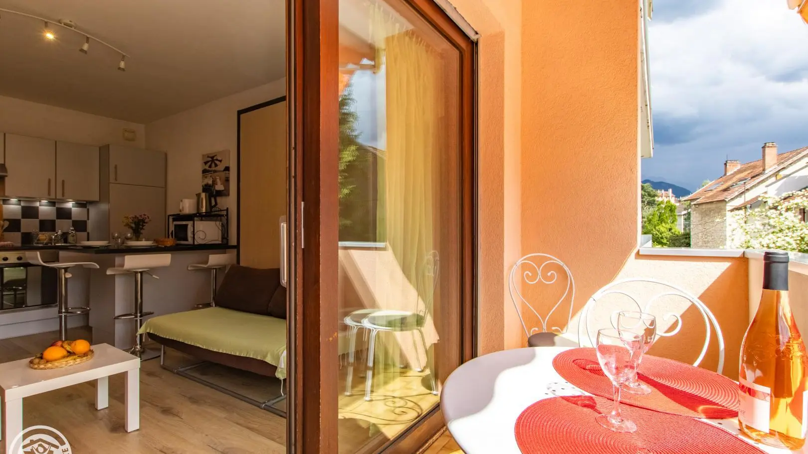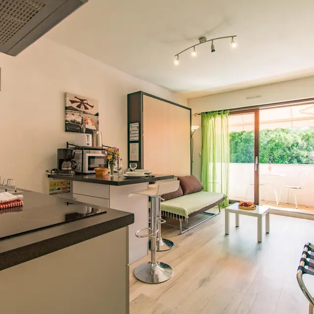 Beautiful location close to the city center. You will be welcomed by the owners who also live nearby. Studio with equipped kitchen open to the living room / sleeping area: kitchen with 2 induction hobs, refrigerator, oven, microwave, pod coffee maker, toaster, kettle... 140x190cm retractable bed (practical bed integrated into a unit with sofa) . You can enjoy your meals at the high table with stools in the kitchen or on the quiet balcony on the courtyard/parking side. Television. Shower room with bathtub (small size), vanity sink, toilet, towel dryer, hairdryer.