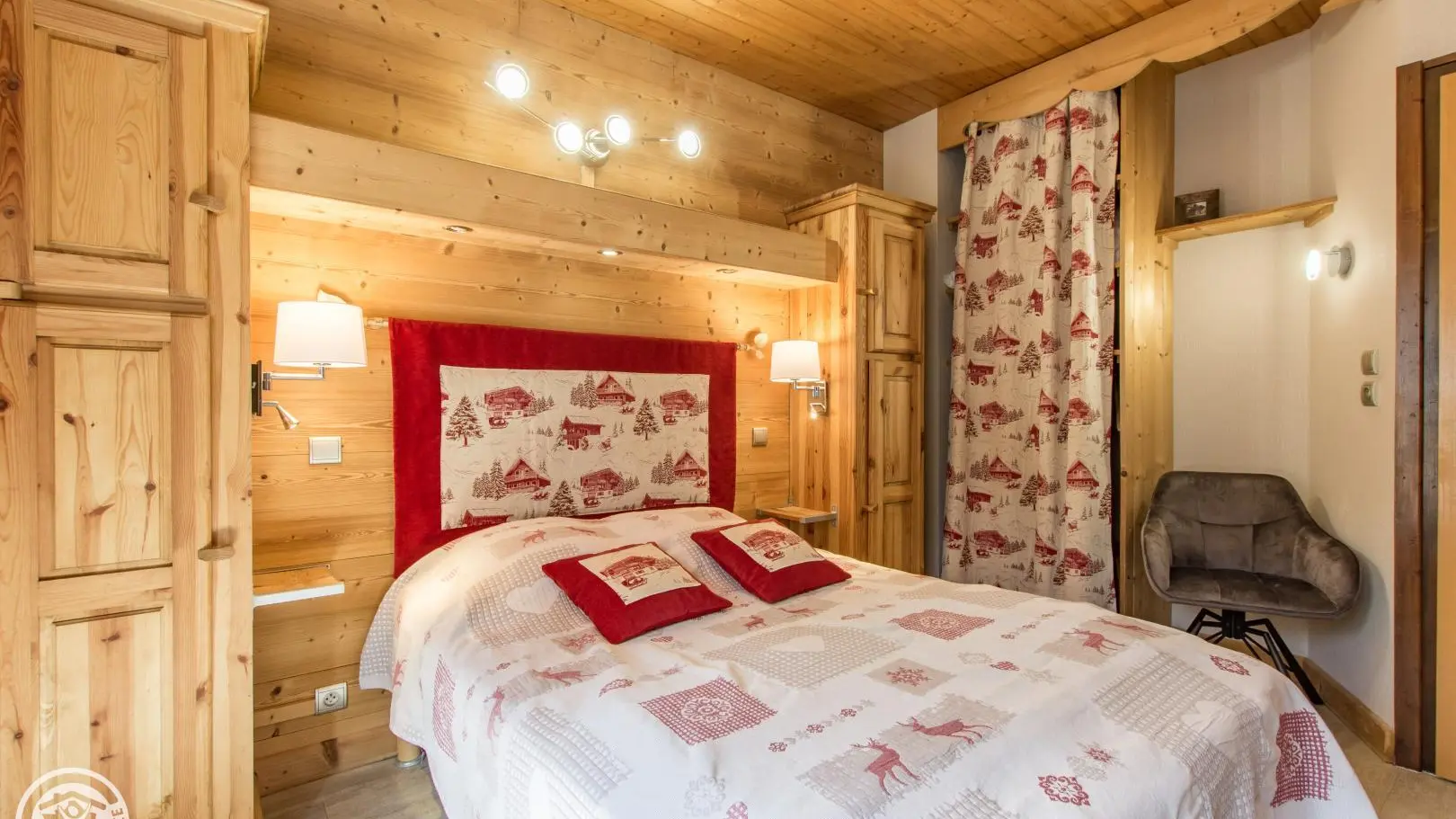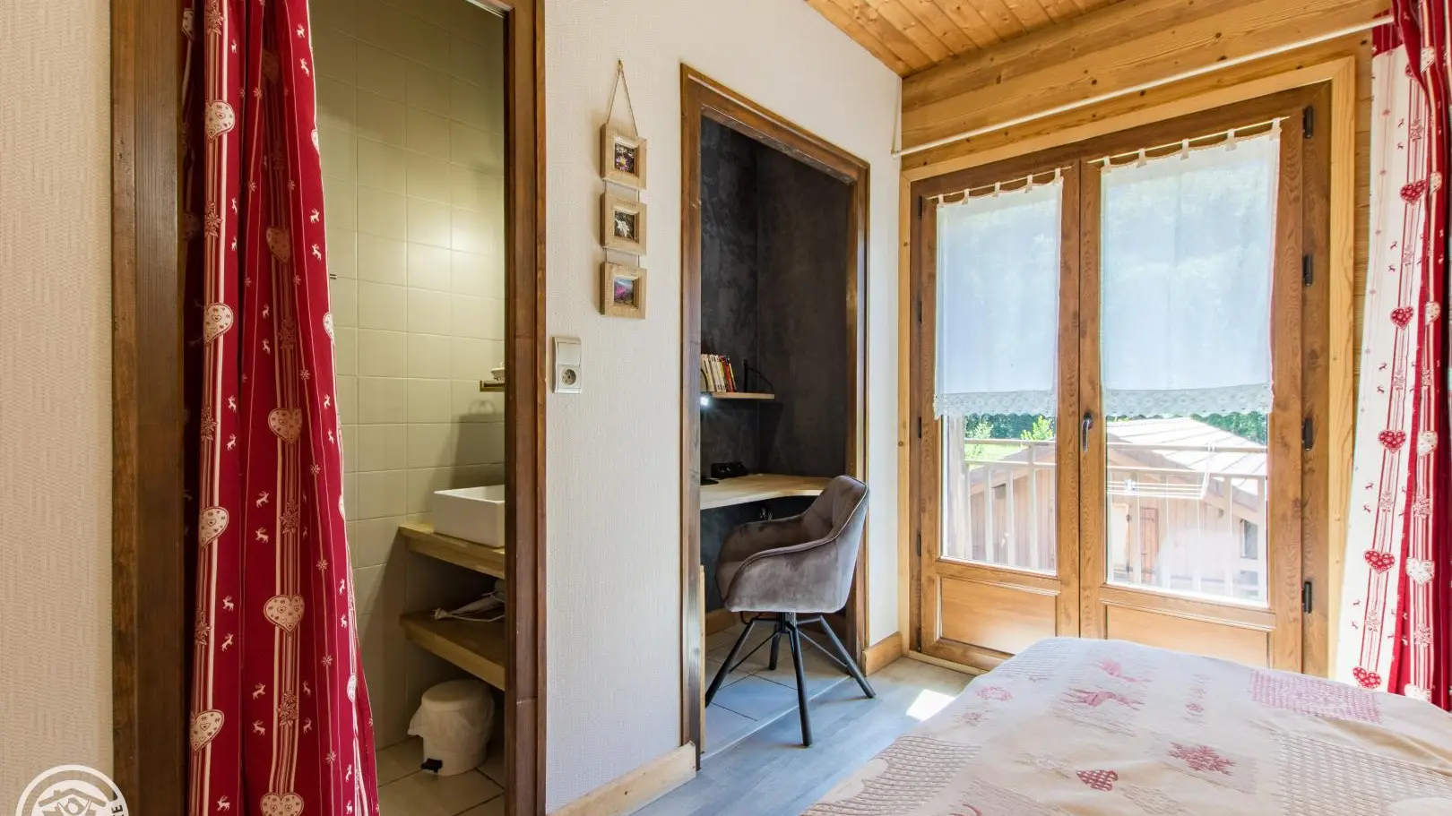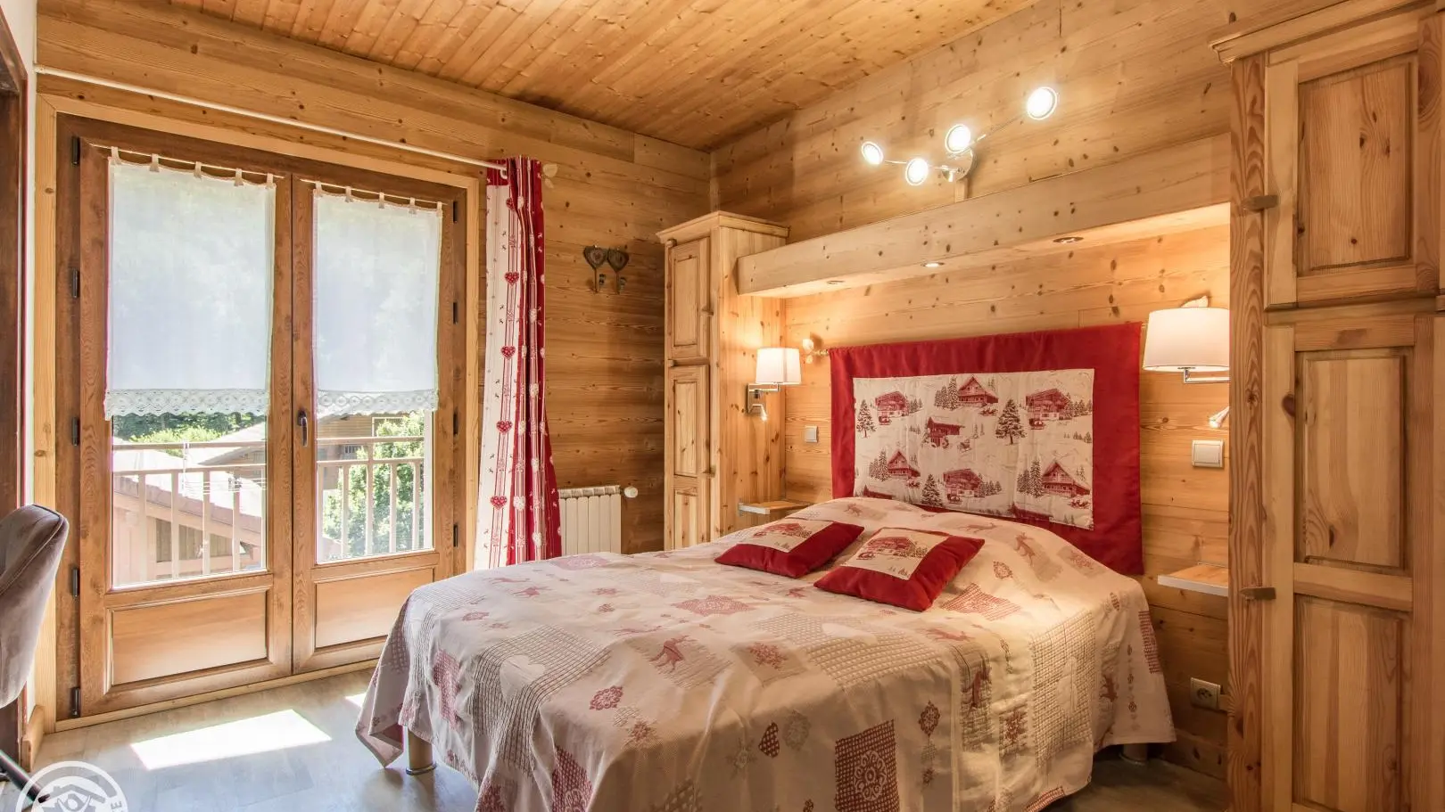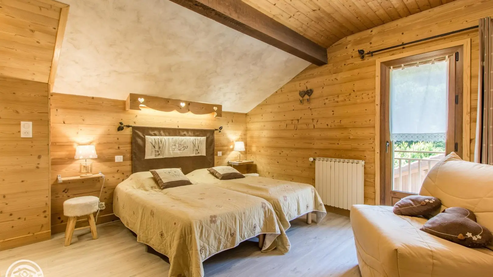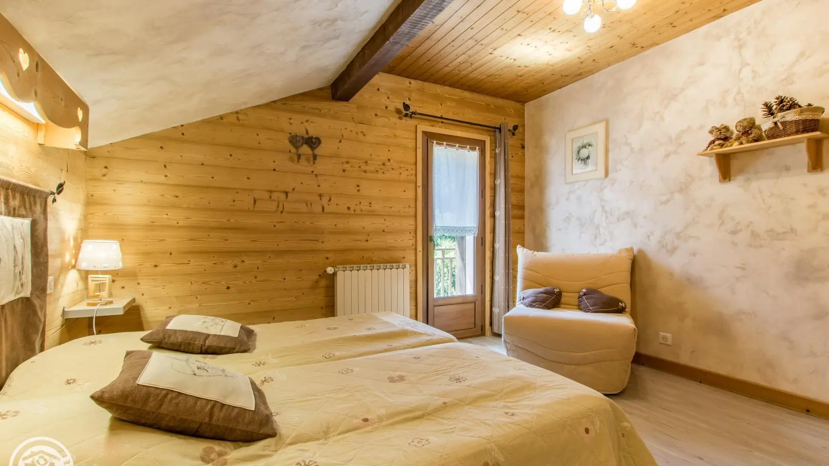 2 bedrooms: bedroom 1 (1 bed 140x190cm, desk, balcony access, bathroom with washbasin on cupboard and shower), bedroom 2 (2 beds 90x190cm that can be pushed together, balcony access, extra bedding type fireside chair 80x190cm).
