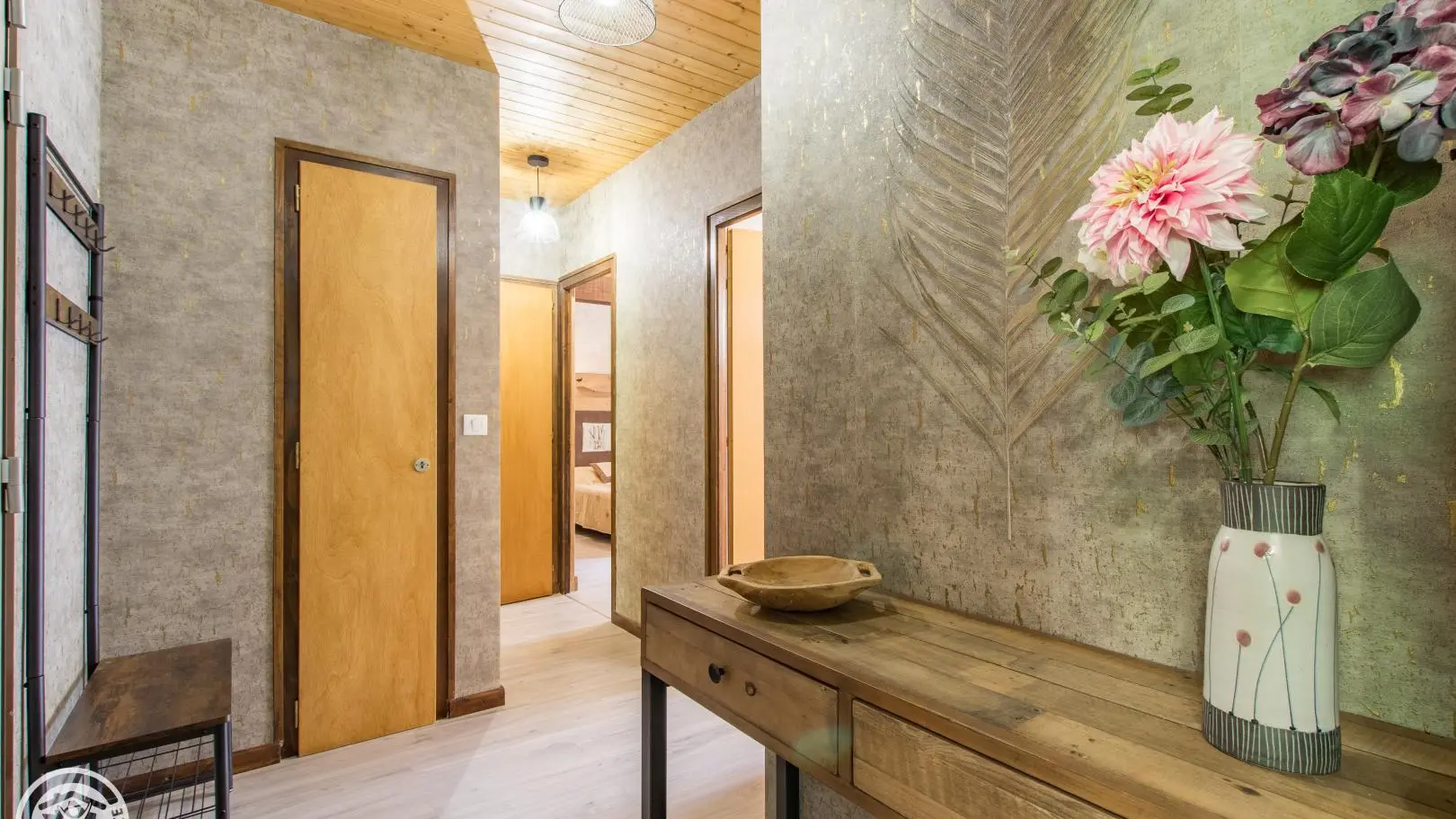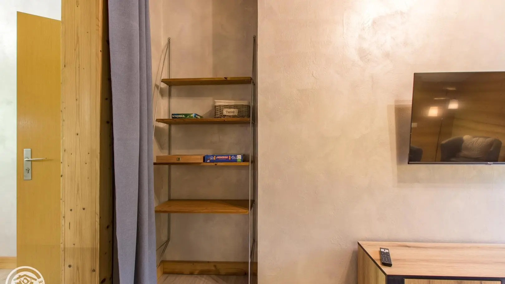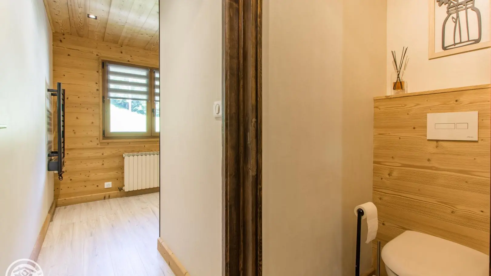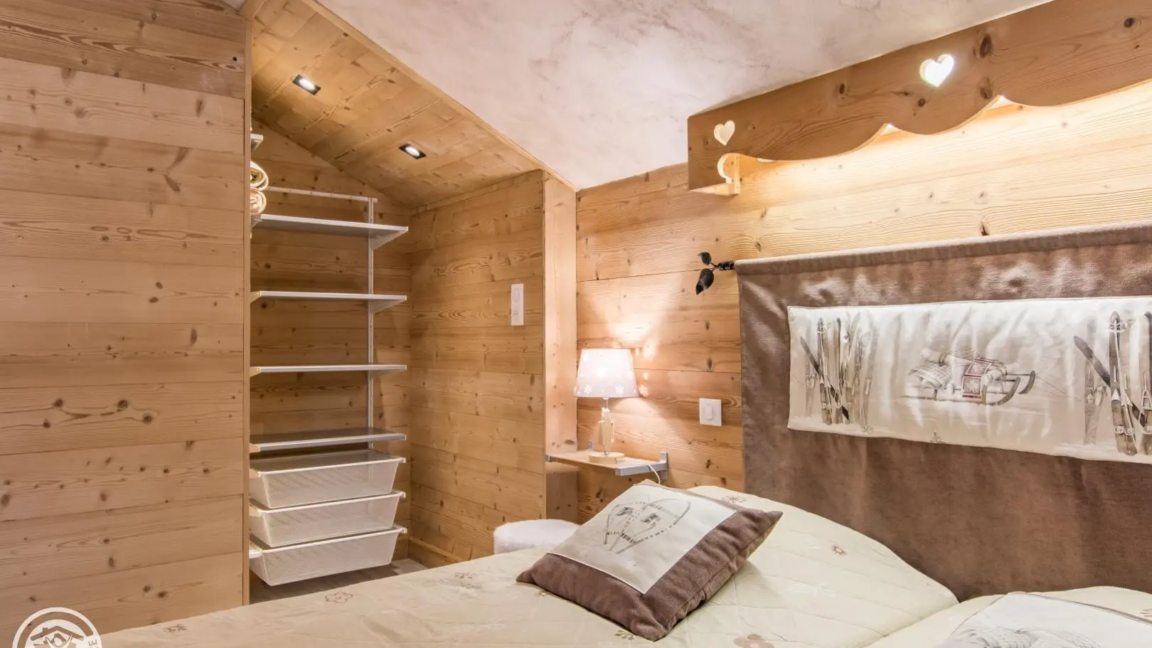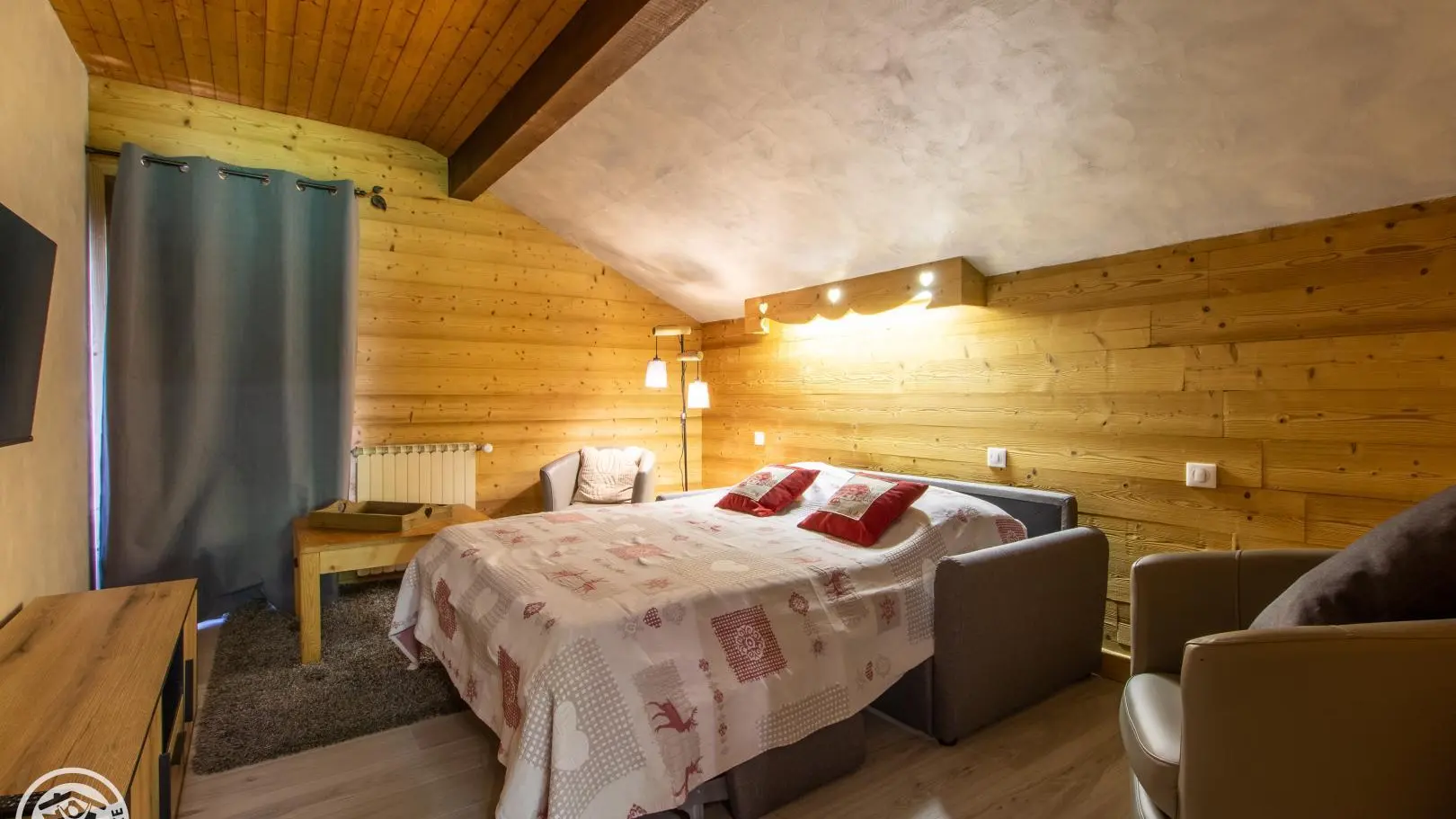 2 bedrooms: bedroom 1 (1 bed 140x190cm, desk, balcony access, bathroom with washbasin on cupboard and shower), bedroom 2 (2 beds 90x190cm that can be pushed together, balcony access, extra bedding type fireside chair 80x190cm).