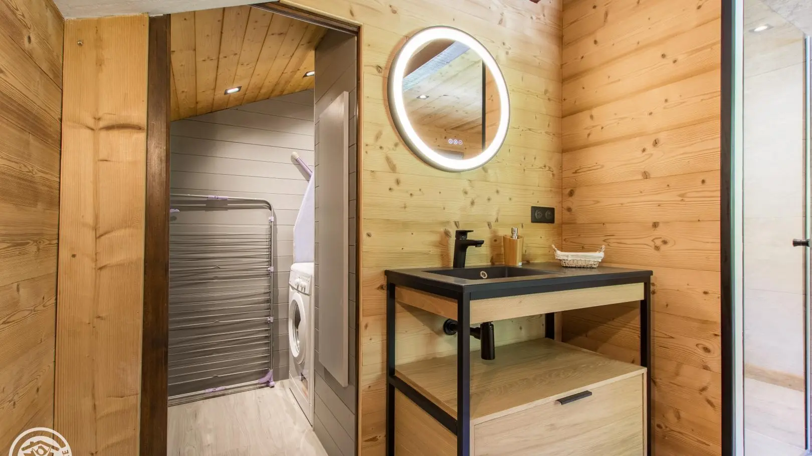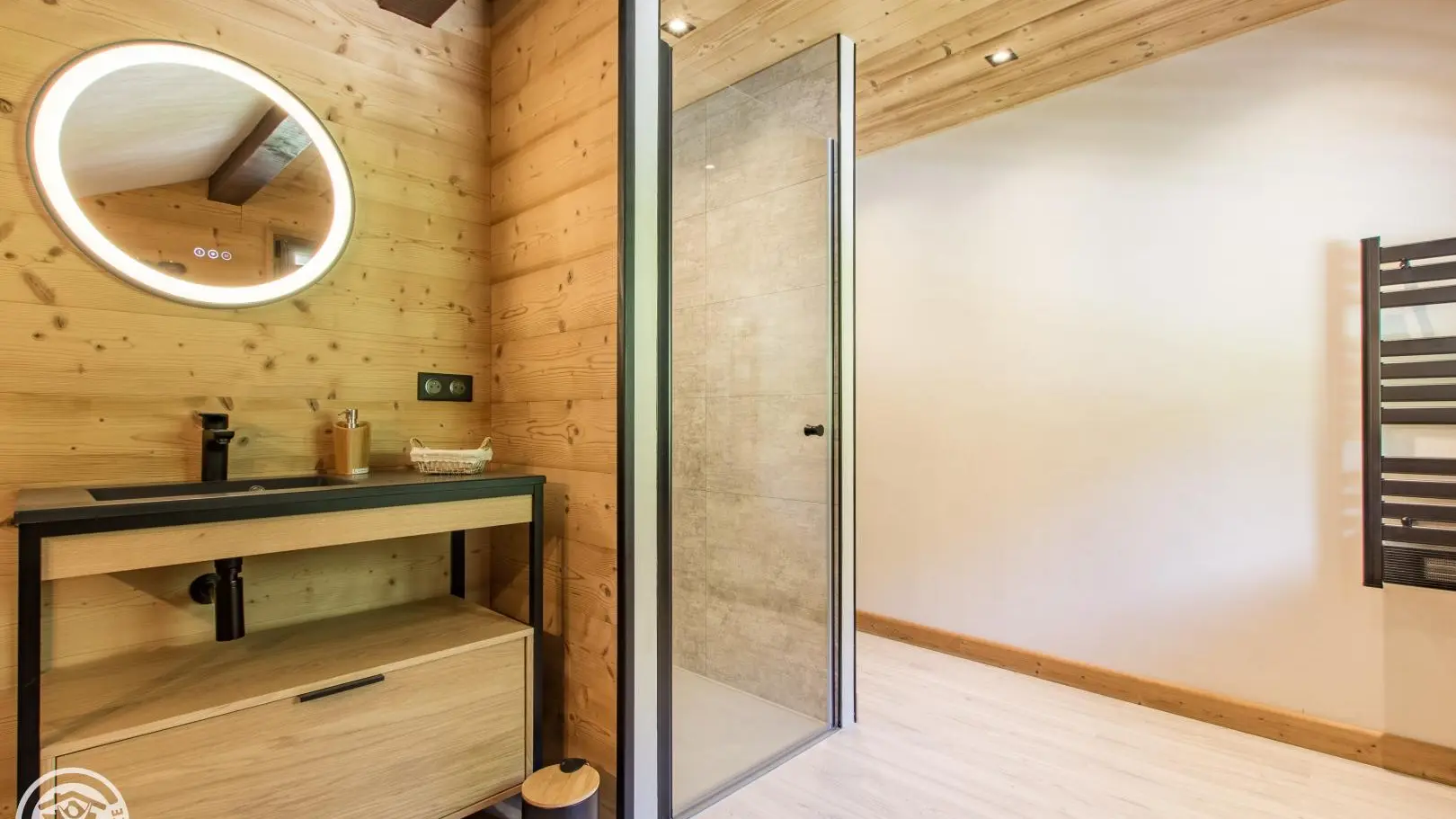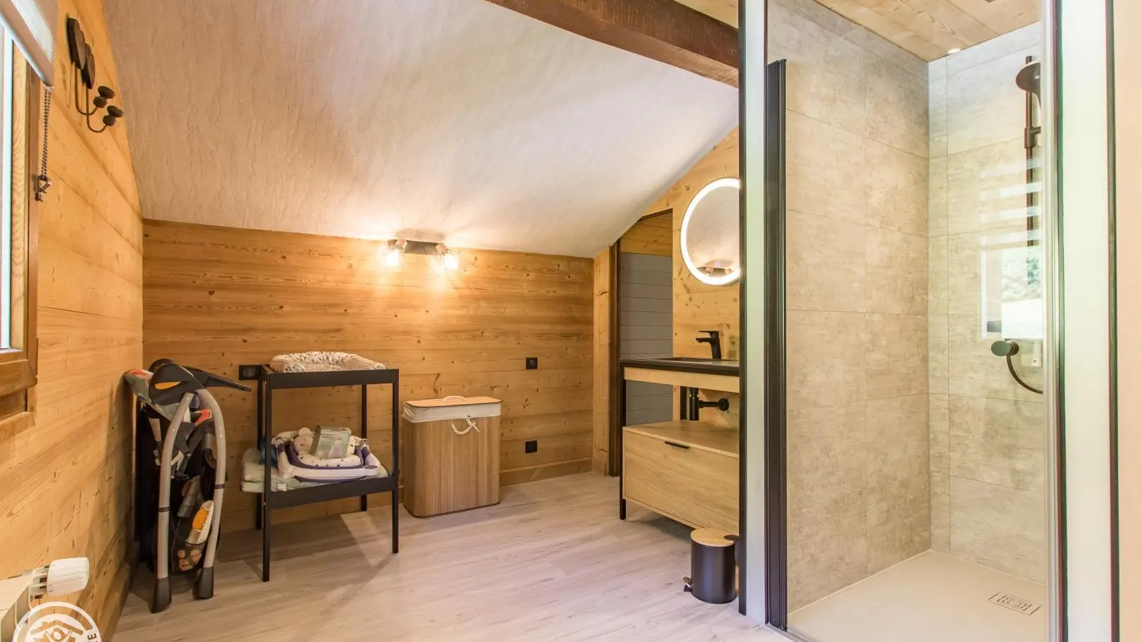 Large bathroom with shower, washbasin on cupboard, wc, space for changing babies, washing machine. 1 separate toilet.