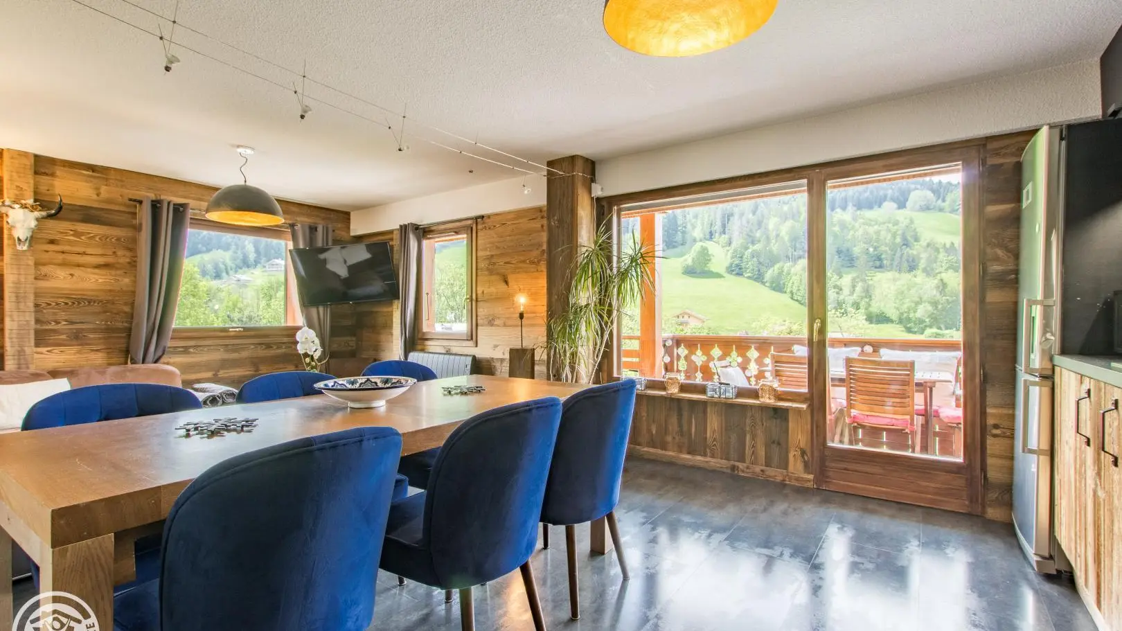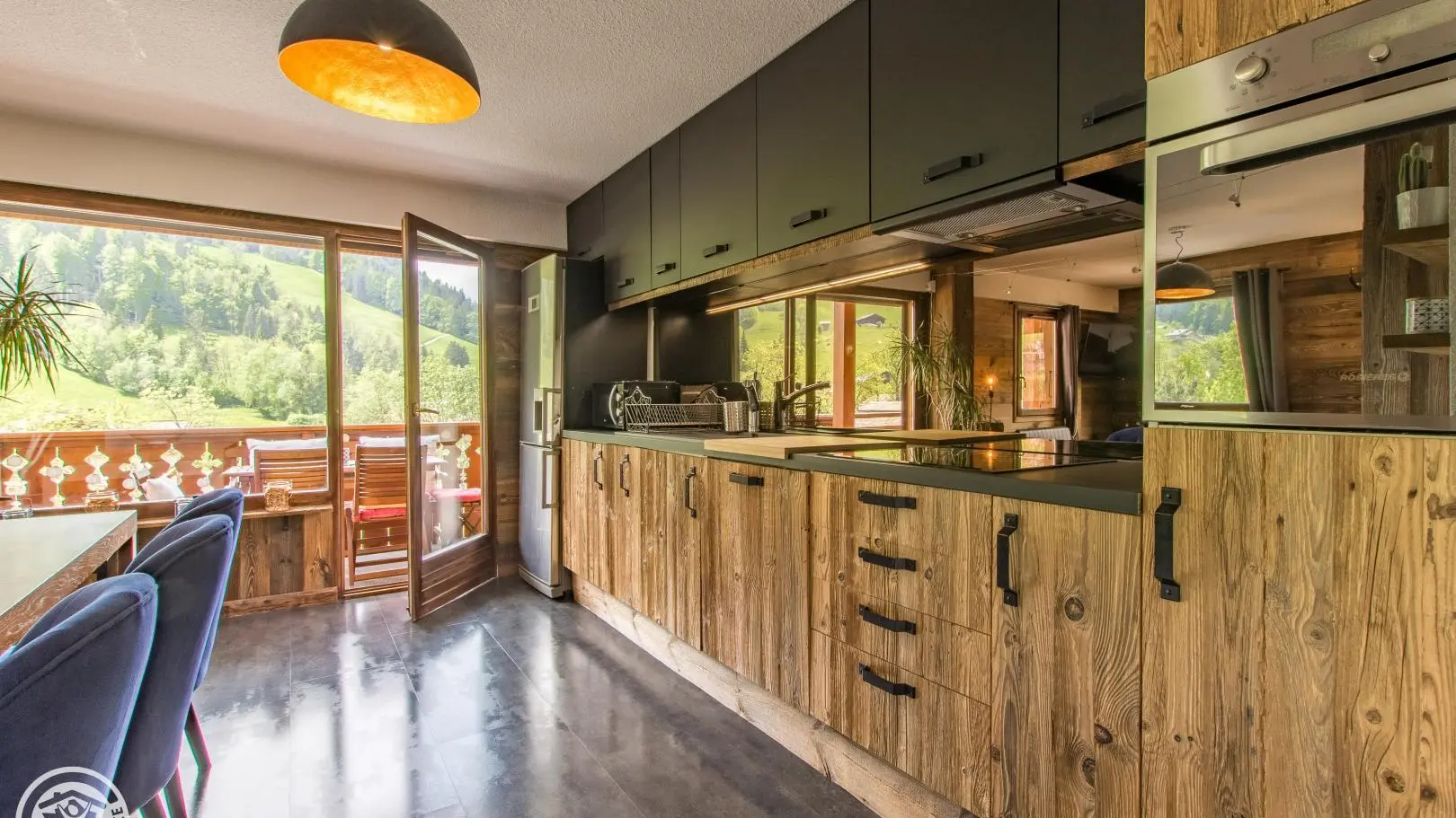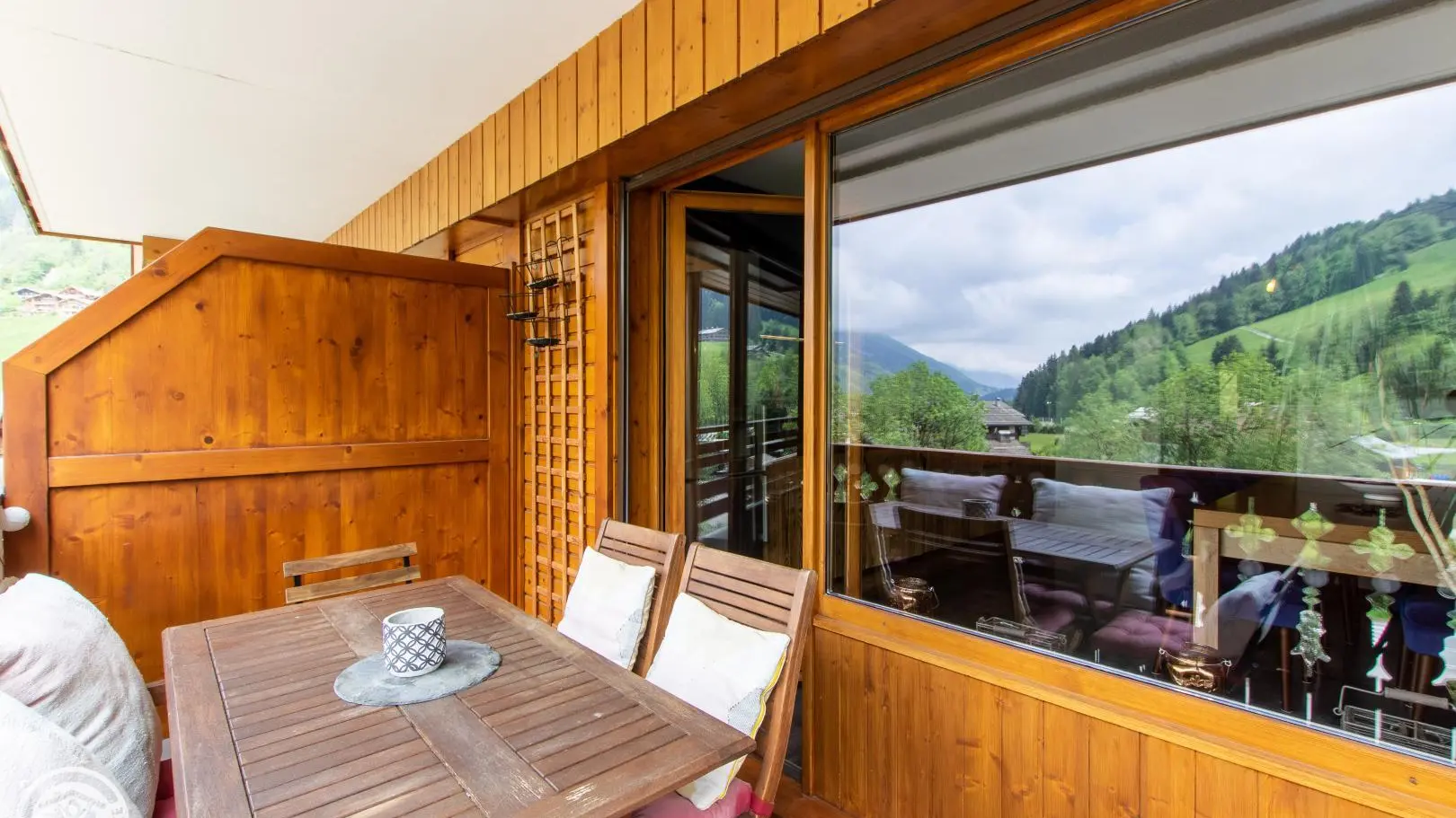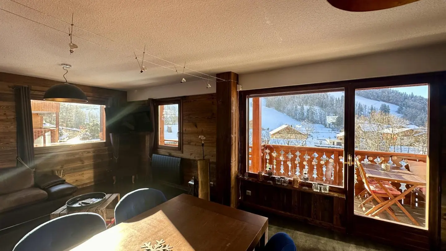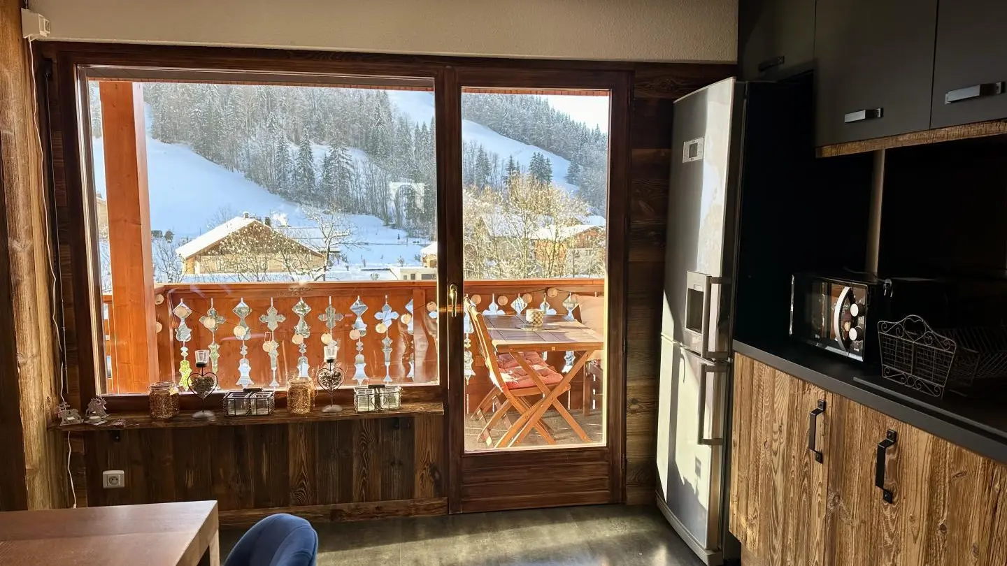 Entrance hall, equipped kitchen open to the bright living room (dining table, corner sofa, television), access to the large balcony offering a magnificent view of the mountains and the village of Grand-Bornand.