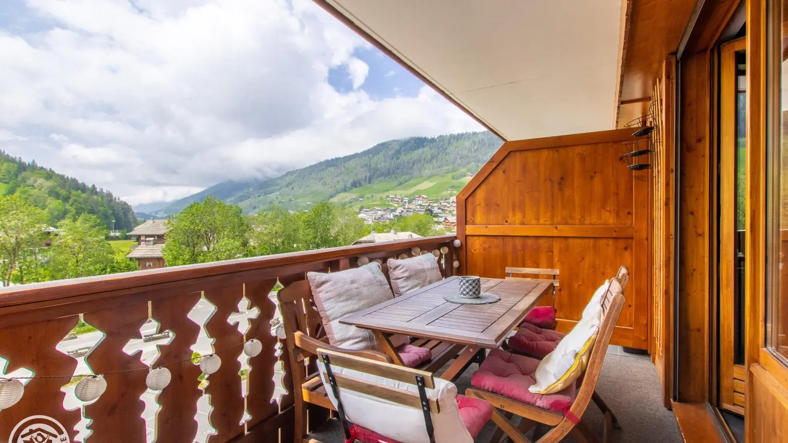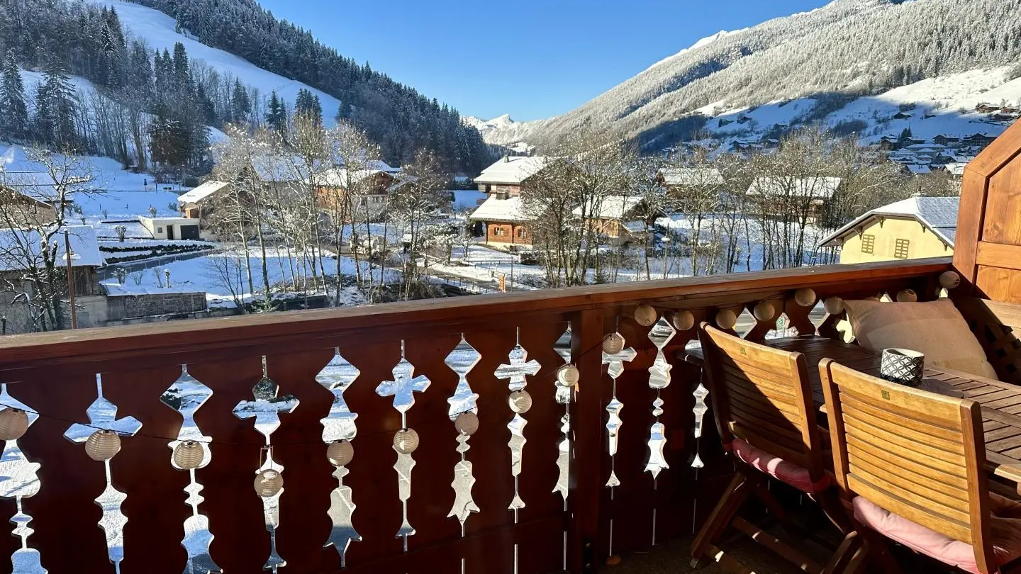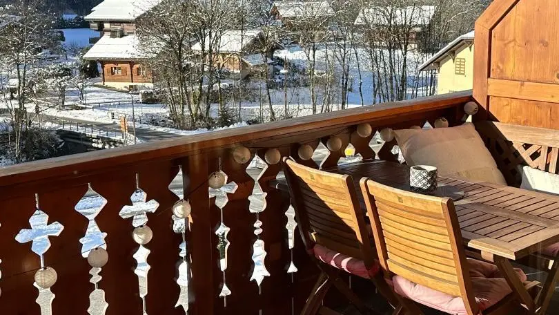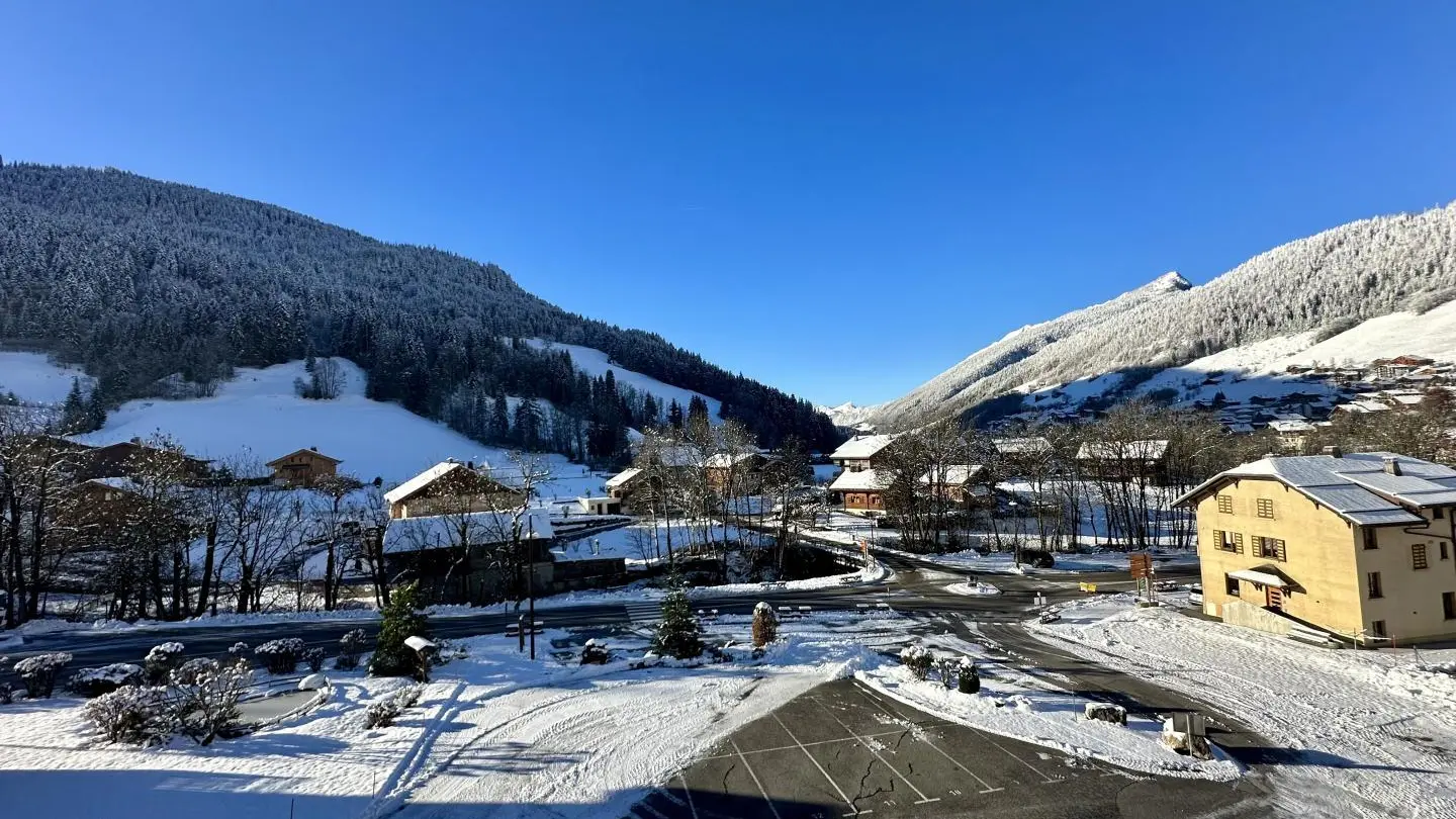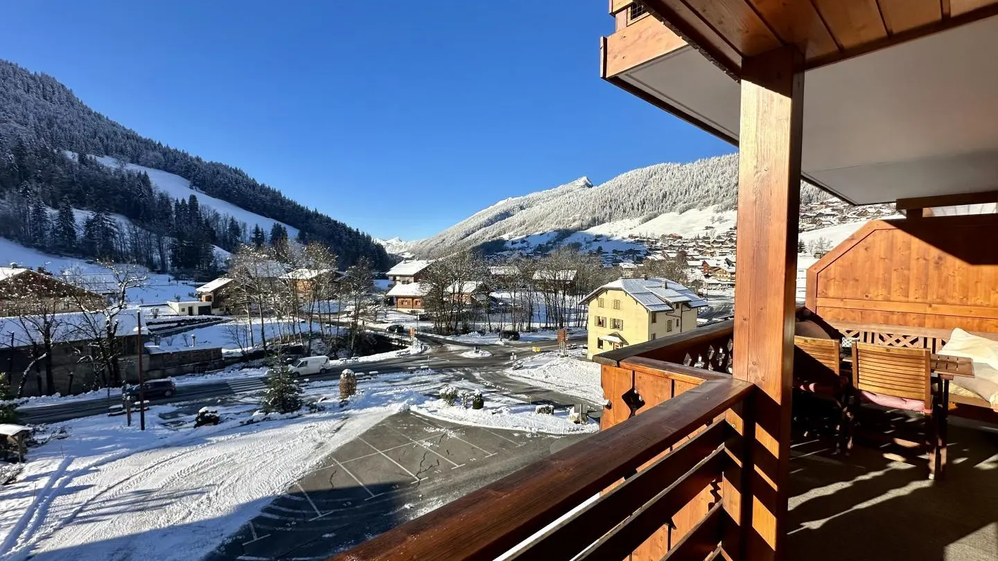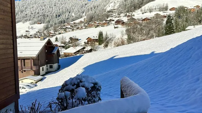 Entrance hall, equipped kitchen open to the bright living room (dining table, corner sofa, television), access to the large balcony offering a magnificent view of the mountains and the village of Grand-Bornand.