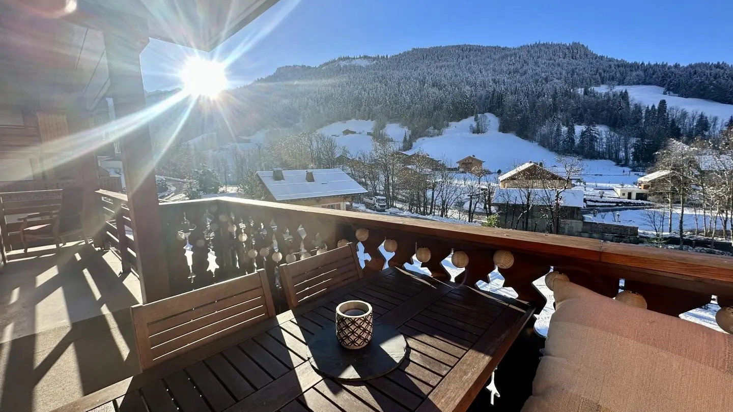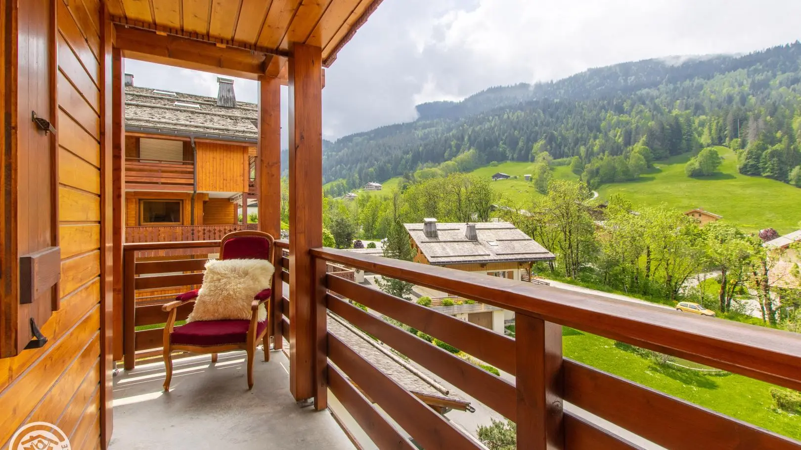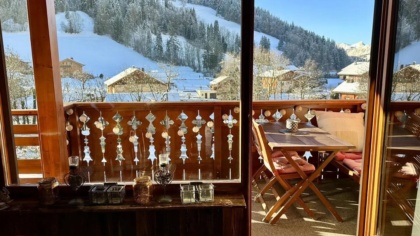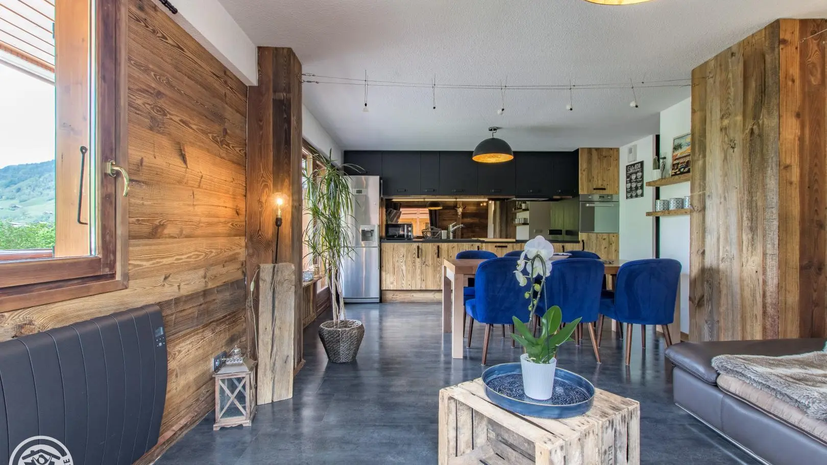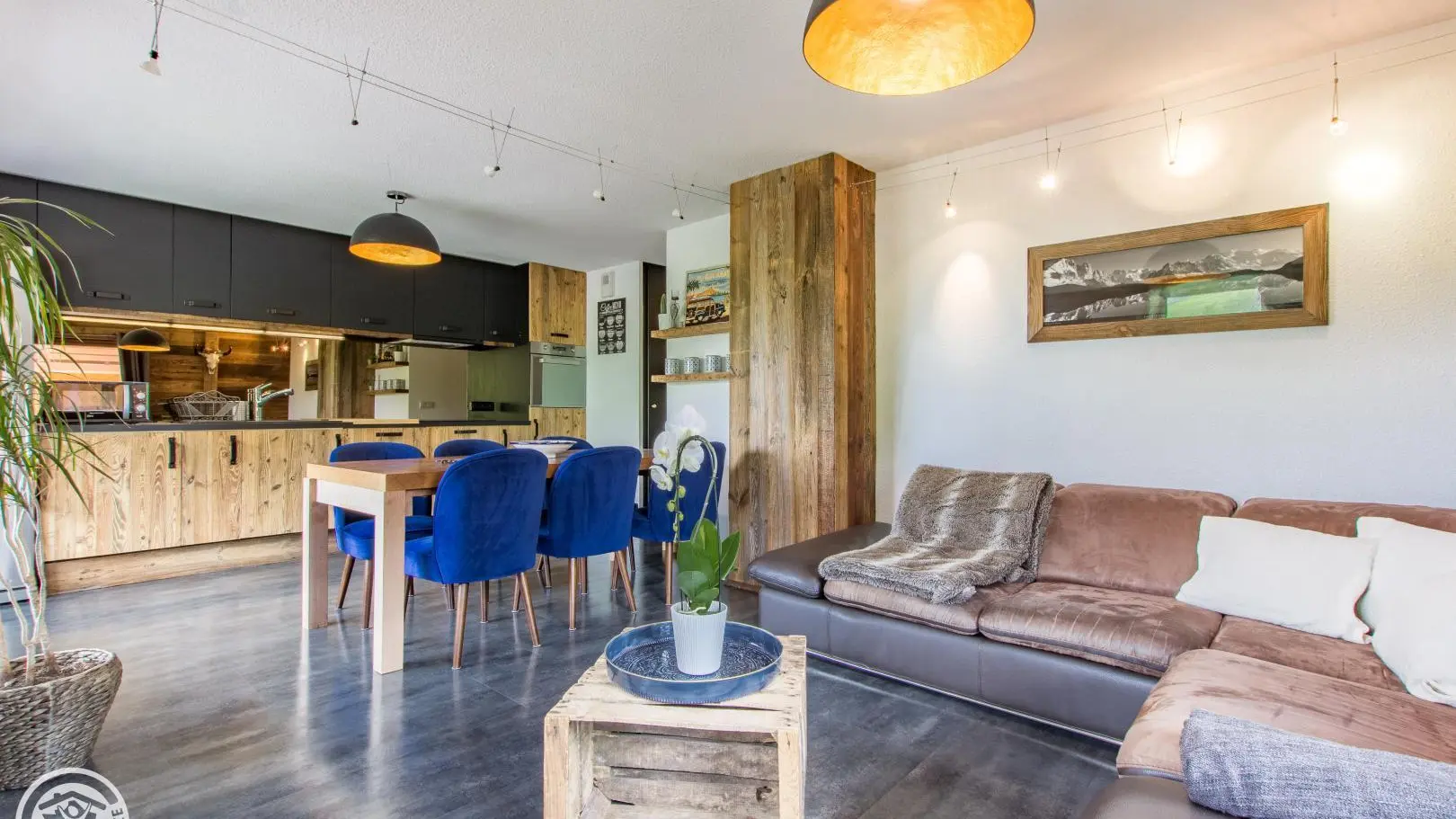Entrance hall, equipped kitchen open to the bright living room (dining table, corner sofa, television), access to the large balcony offering a magnificent view of the mountains and the village of Grand-Bornand.