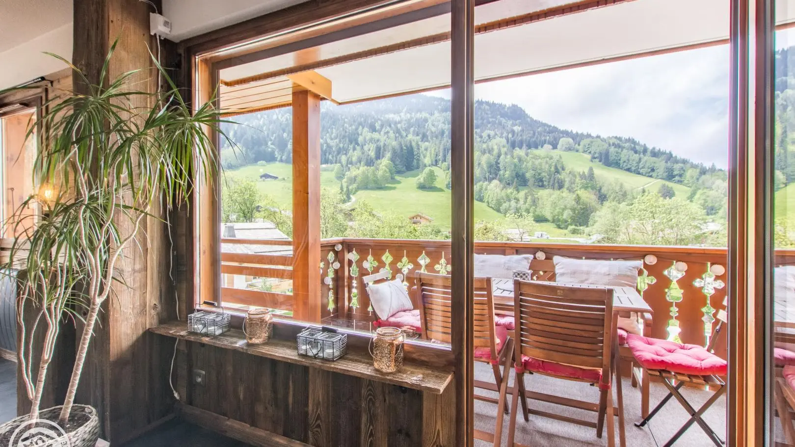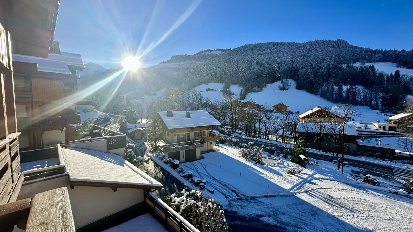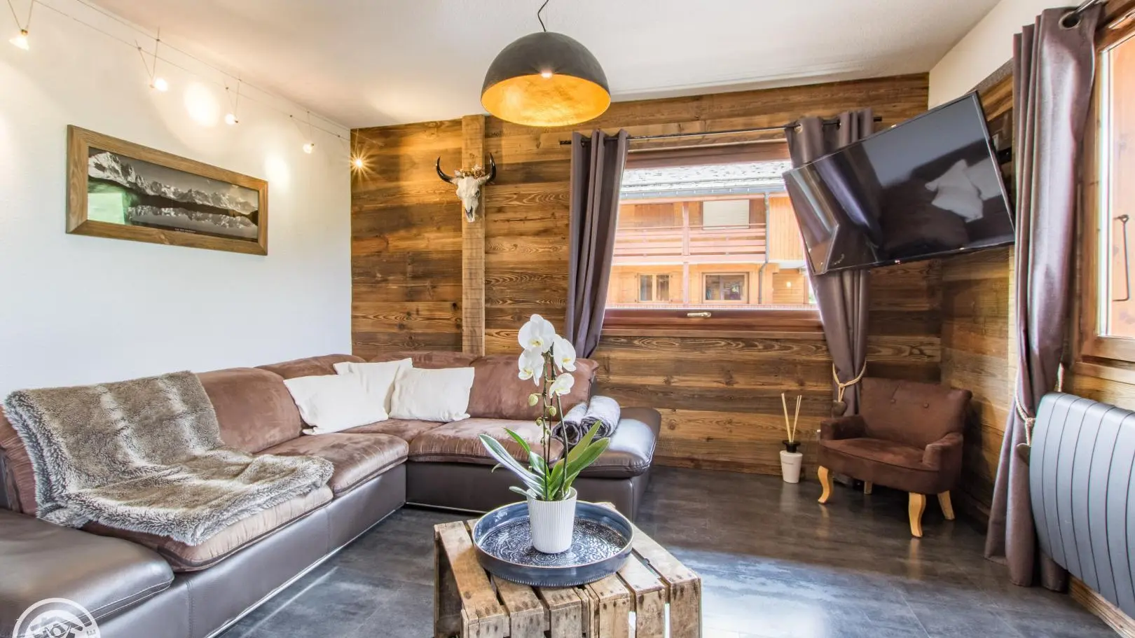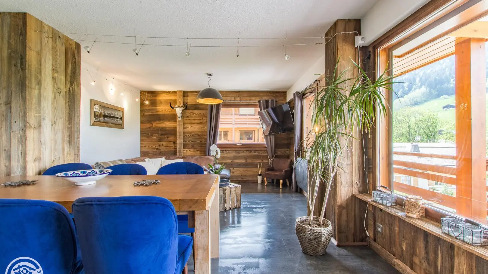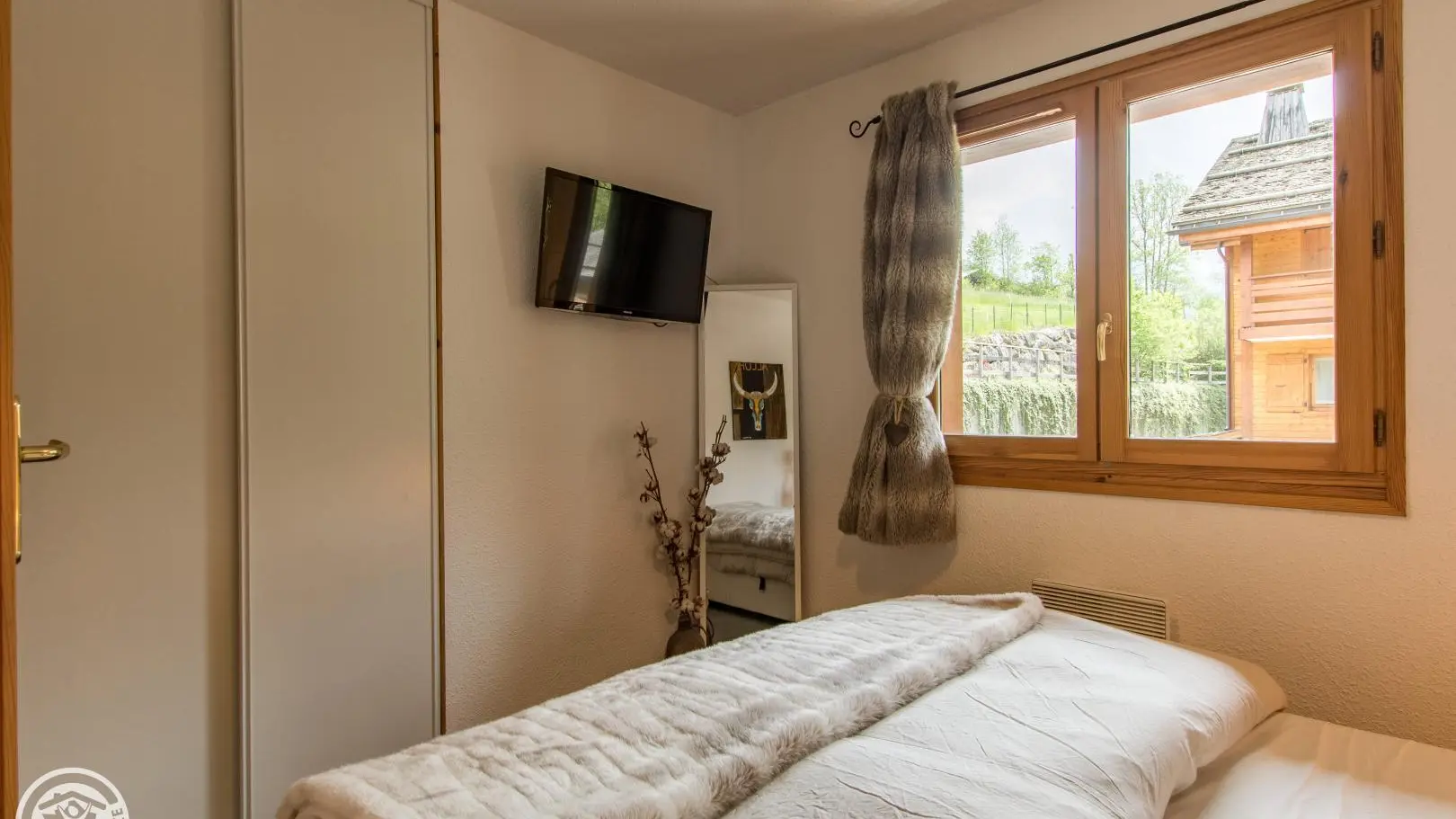 Entrance hall, equipped kitchen open to the bright living room (dining table, corner sofa, television), access to the large balcony offering a magnificent view of the mountains and the village of Grand-Bornand.