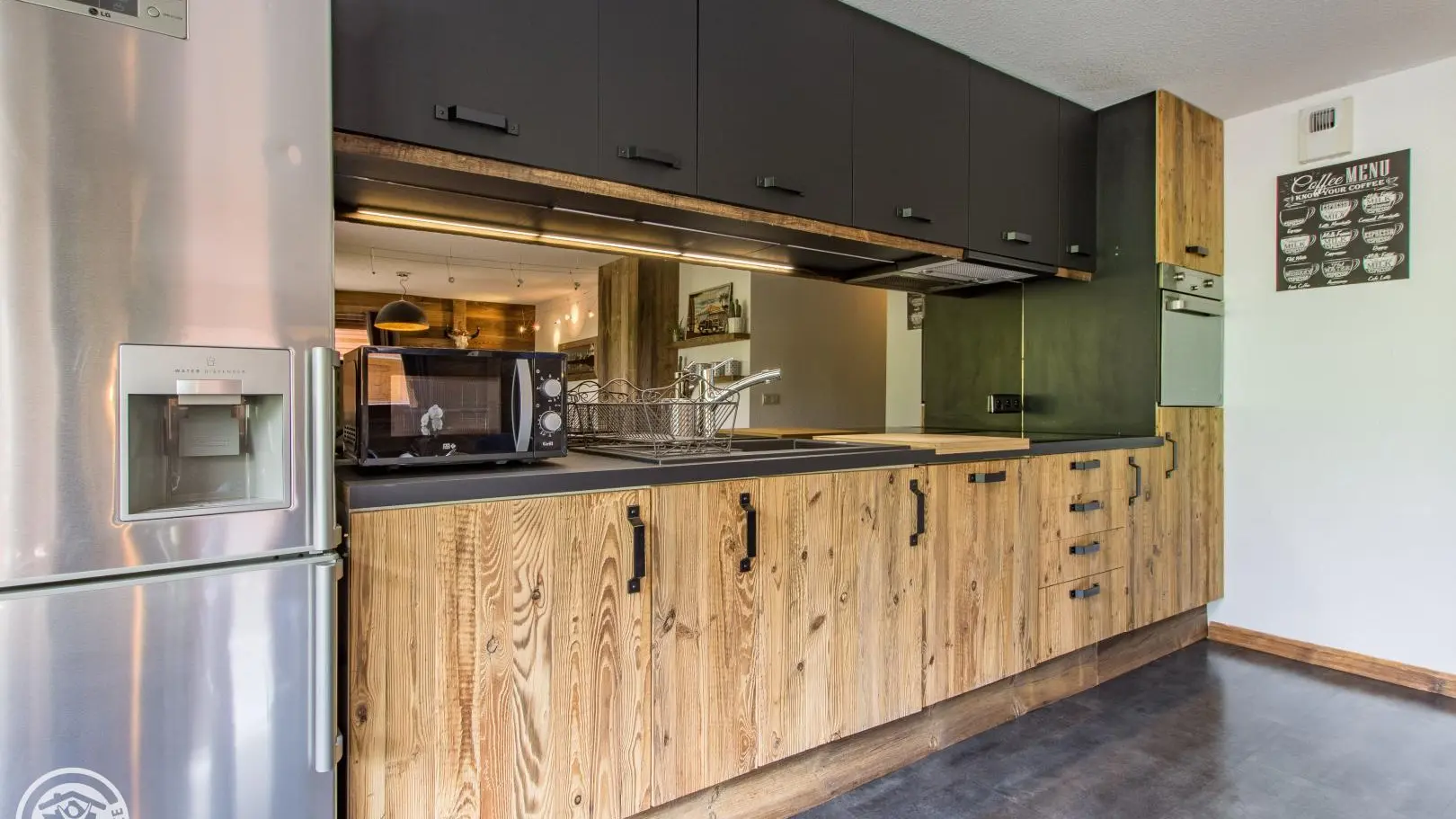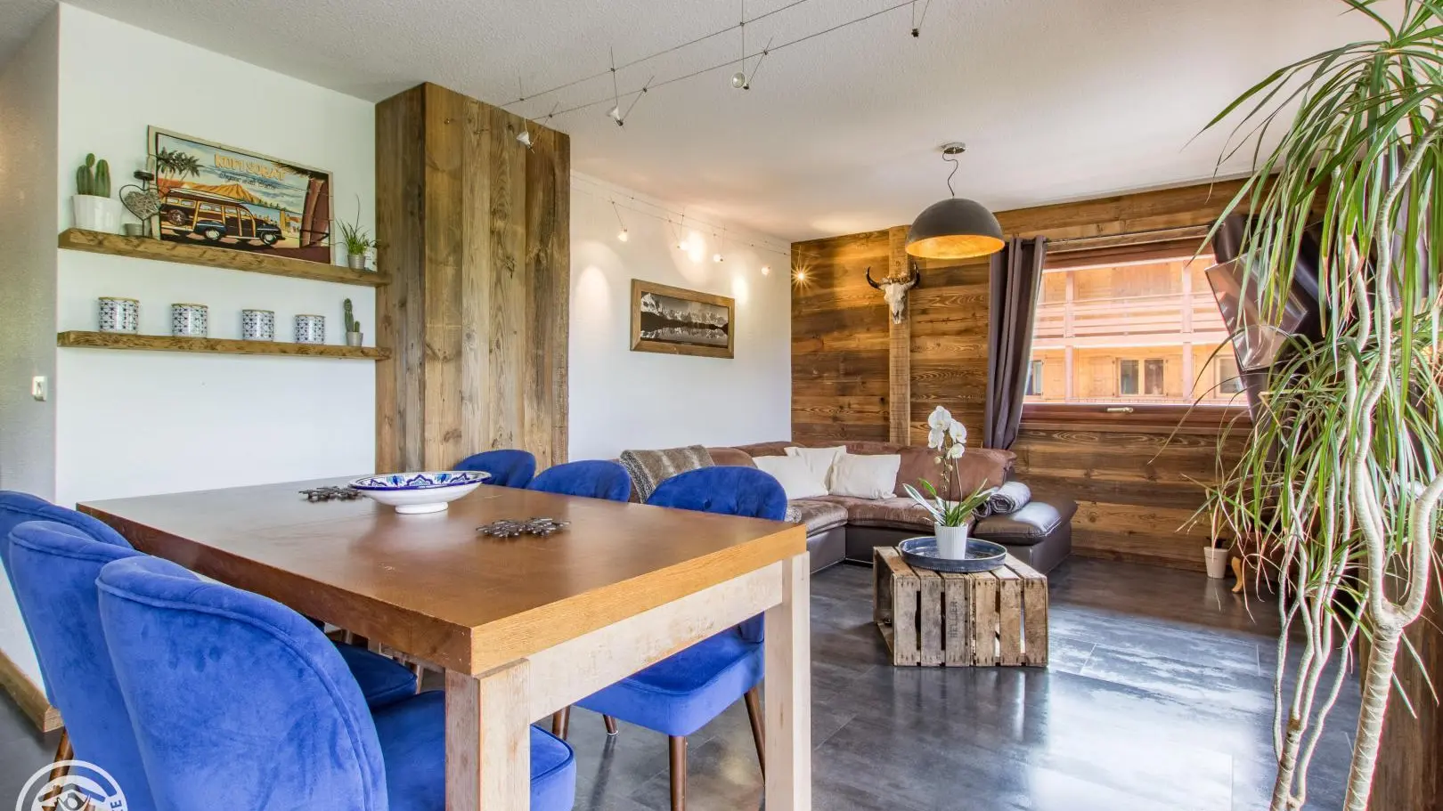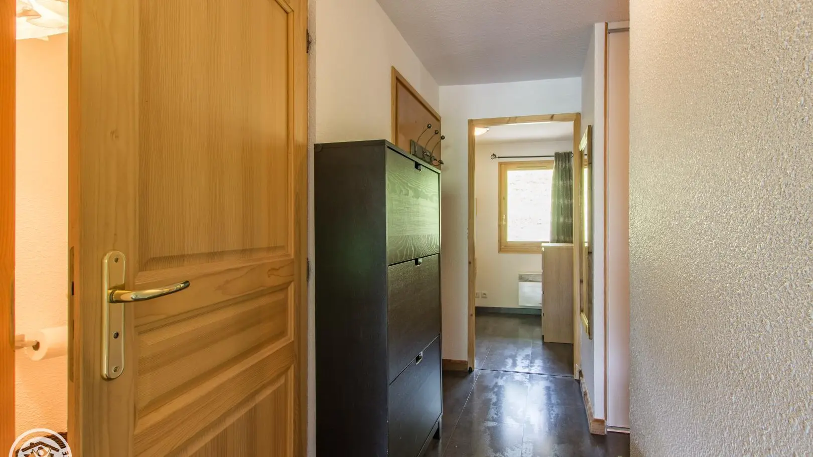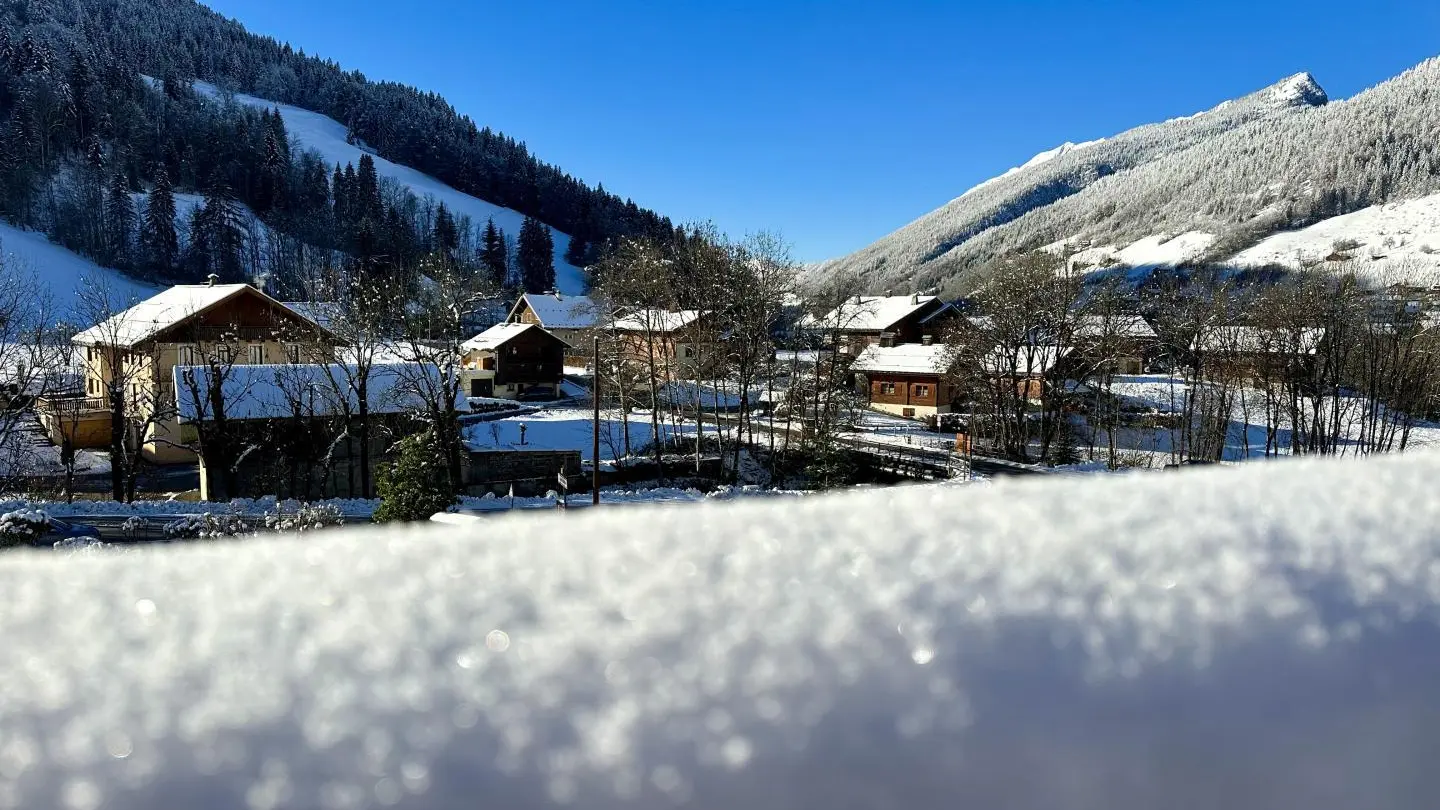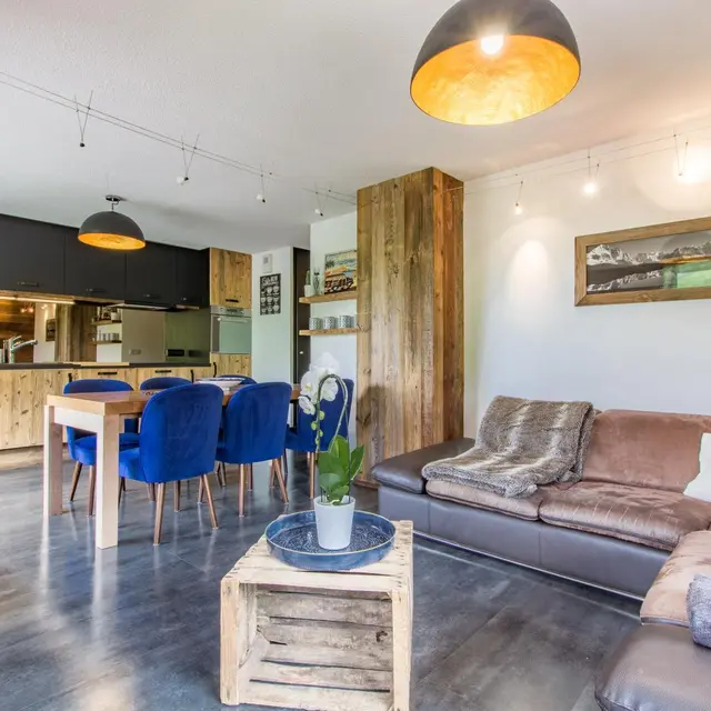 Entrance hall, equipped kitchen open to the bright living room (dining table, corner sofa, television), access to the large balcony offering a magnificent view of the mountains and the village of Grand-Bornand.