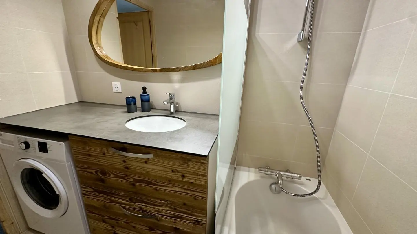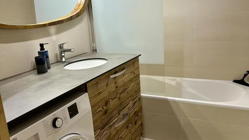 Bathroom with a sink, bathtub, heated towel rail and washing machine. 1 independent toilet.