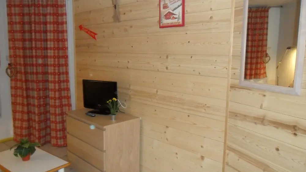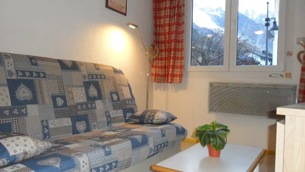 Lounge area with TV, balcony with Mont-Blanc and Bossons glacier views.