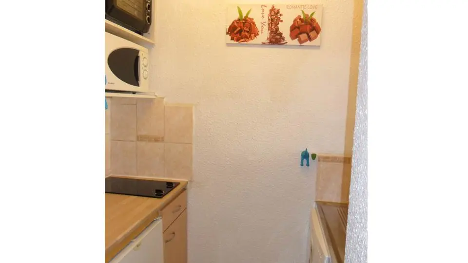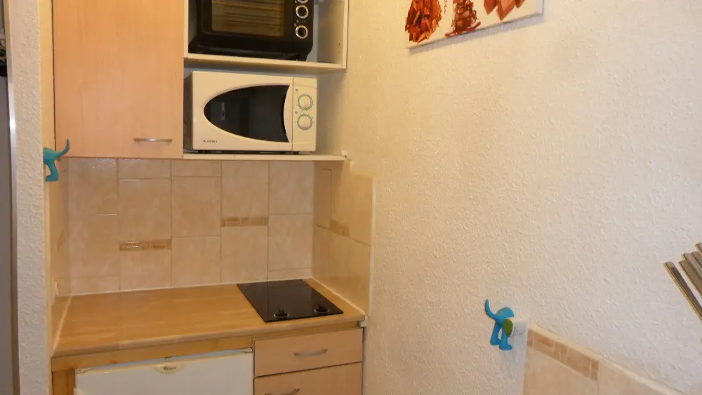 Open-plan kitchen: ceramic hob, mini-oven, microwave, dishwasher, toaster, coffee maker, kettle.
