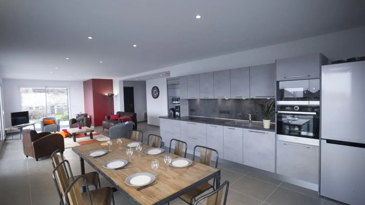 Integrated kitchen open to a large living room giving access to the magnificent terrace/balcony offering a panoramic view of Lake Annecy and the mountains.