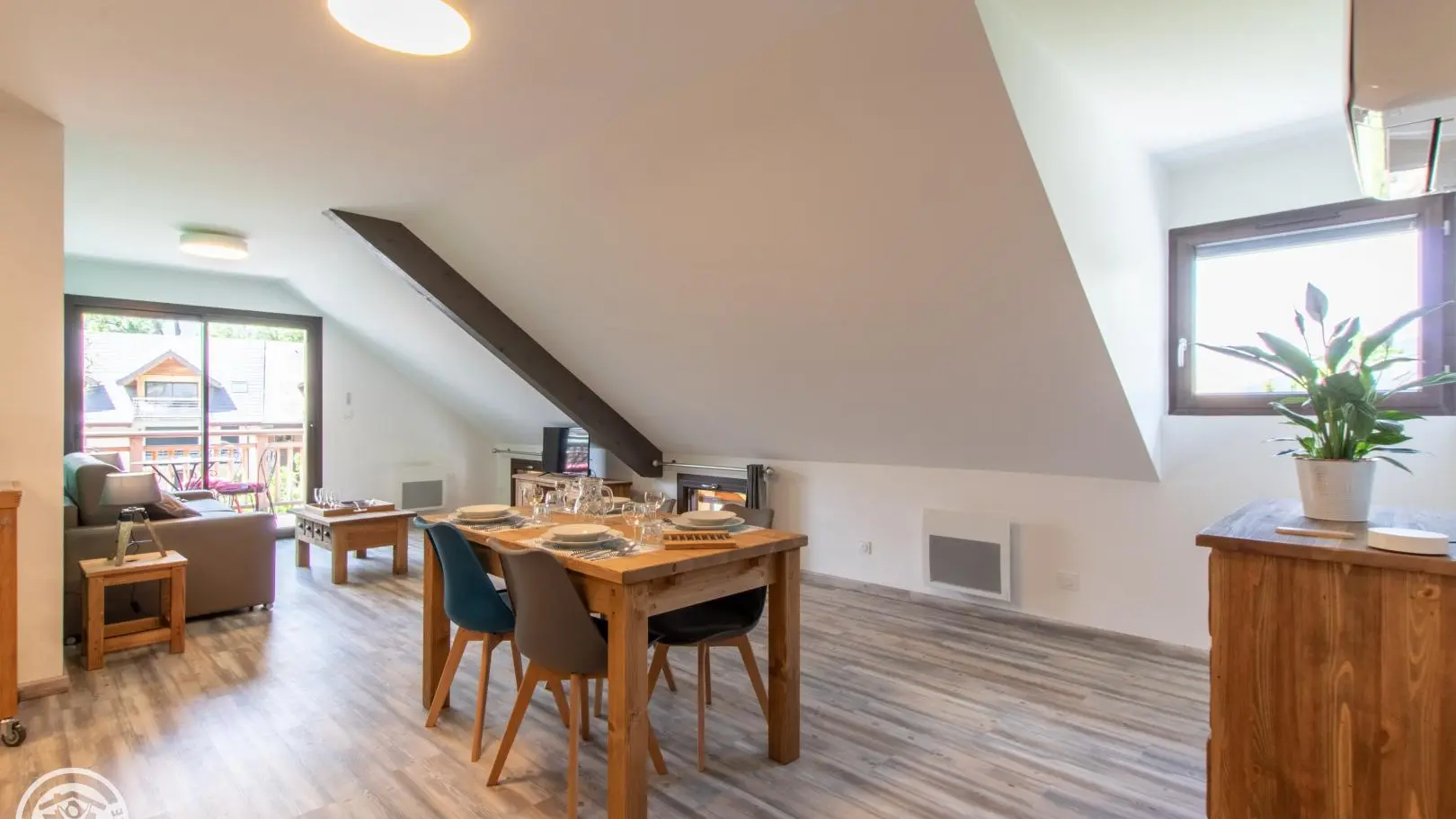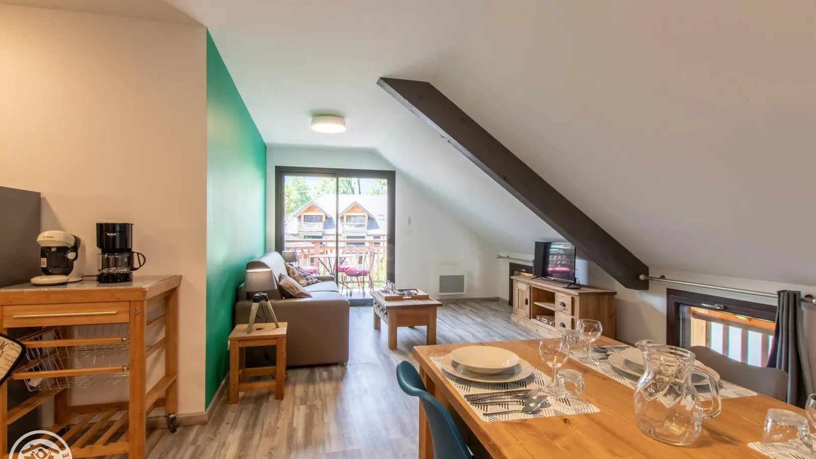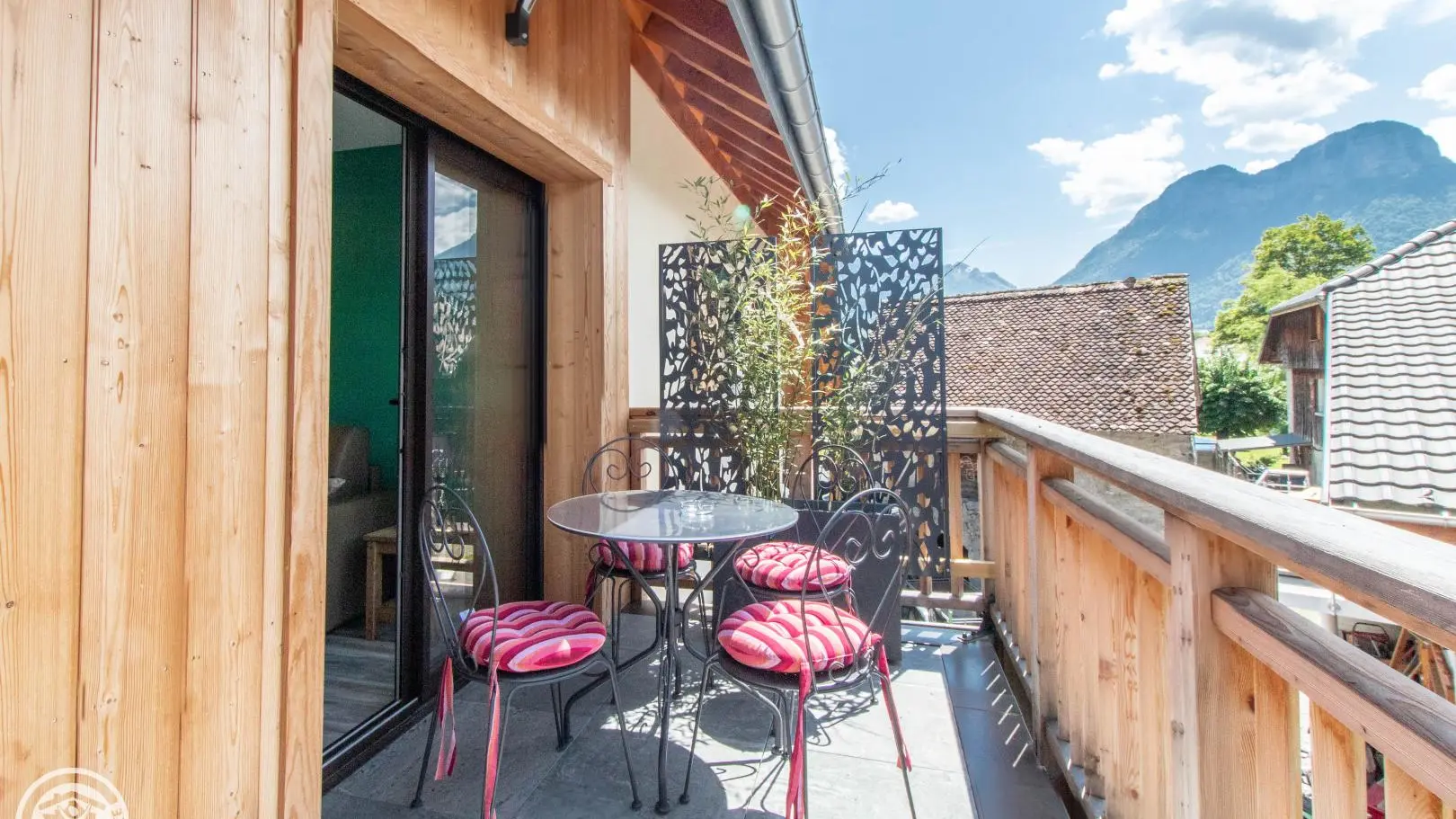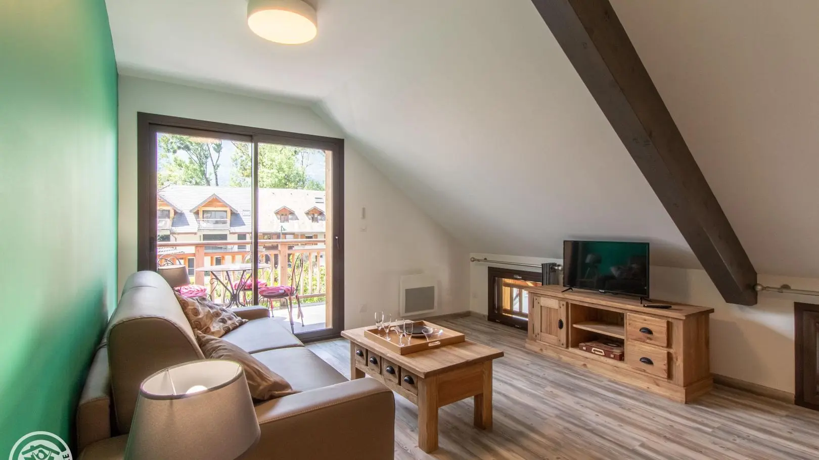 In an old barn completely renovated into a small building comprising four other gîtes (1 on the same level, 3 on the 1st floor), apartment of 51m² (+9m² under attics) fitted out on the 2nd floor. Gîte located in a quiet hamlet of Doussard.