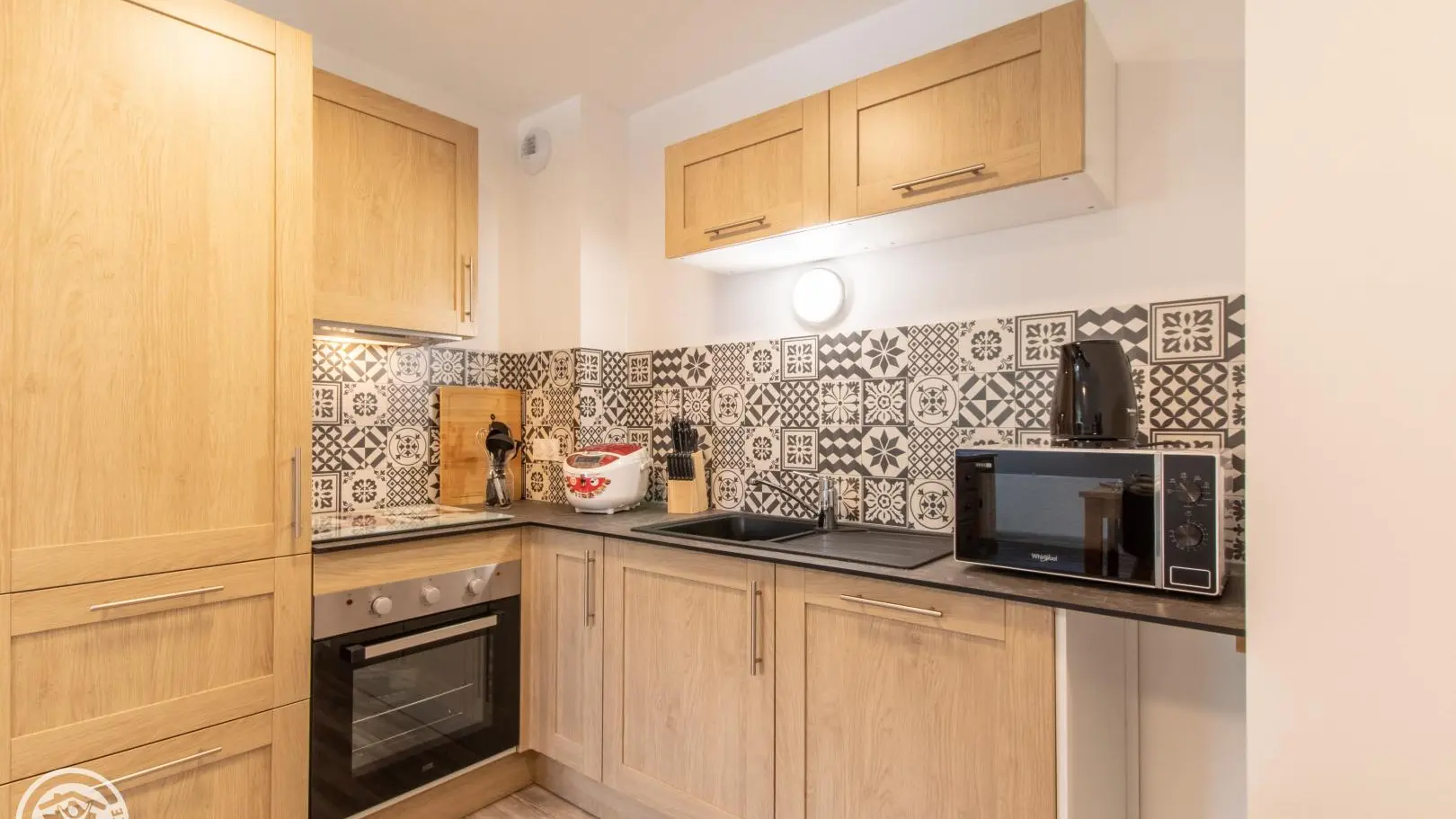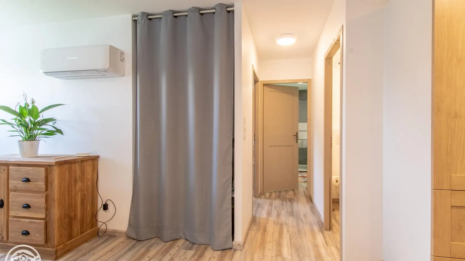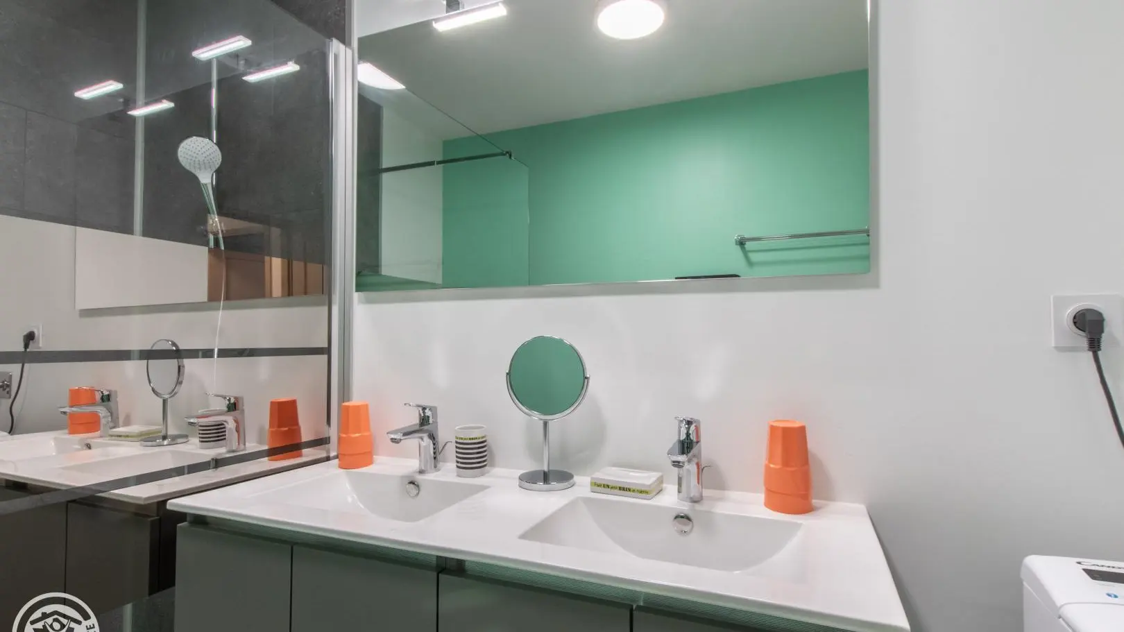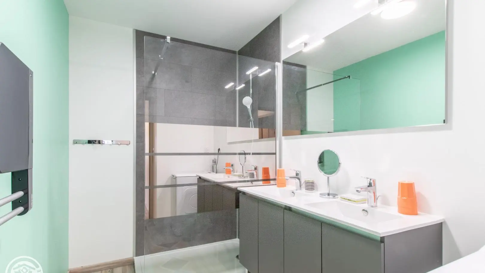 Shower room (large shower, double washbasin on cupboard, heated towel rail, washing machine). Independent WC.
