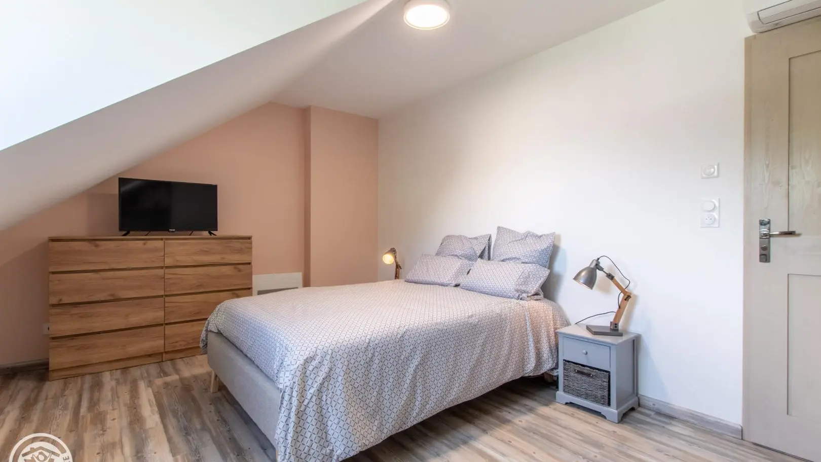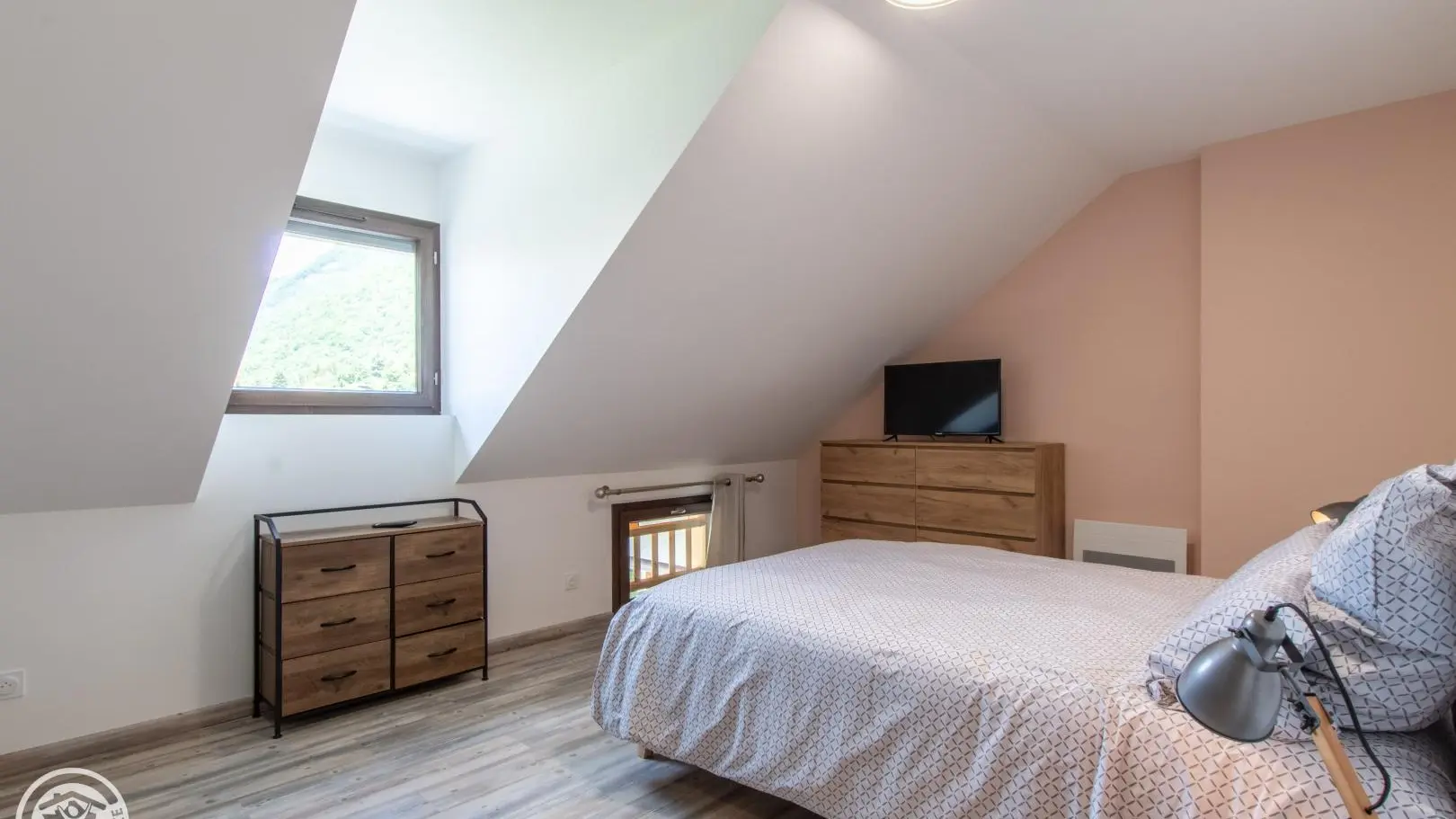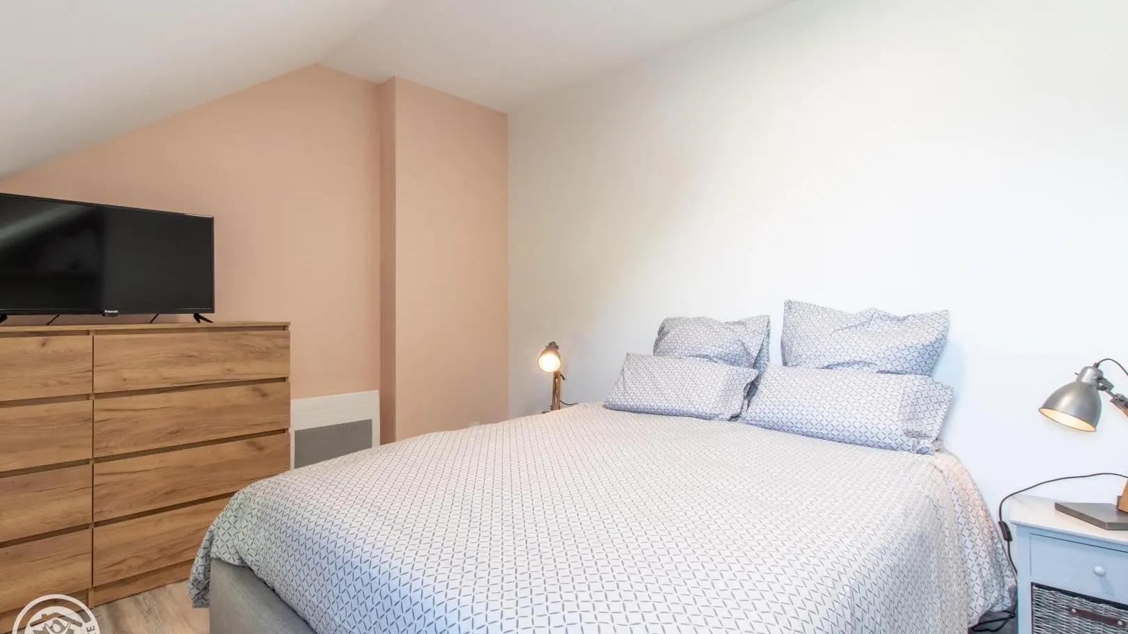 A bedroom with a 140x190cm bed, connected television, wardrobe and chest of drawers, reversible air conditioning.