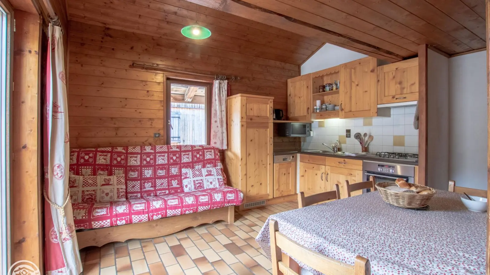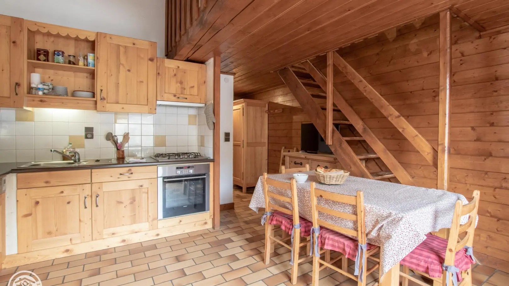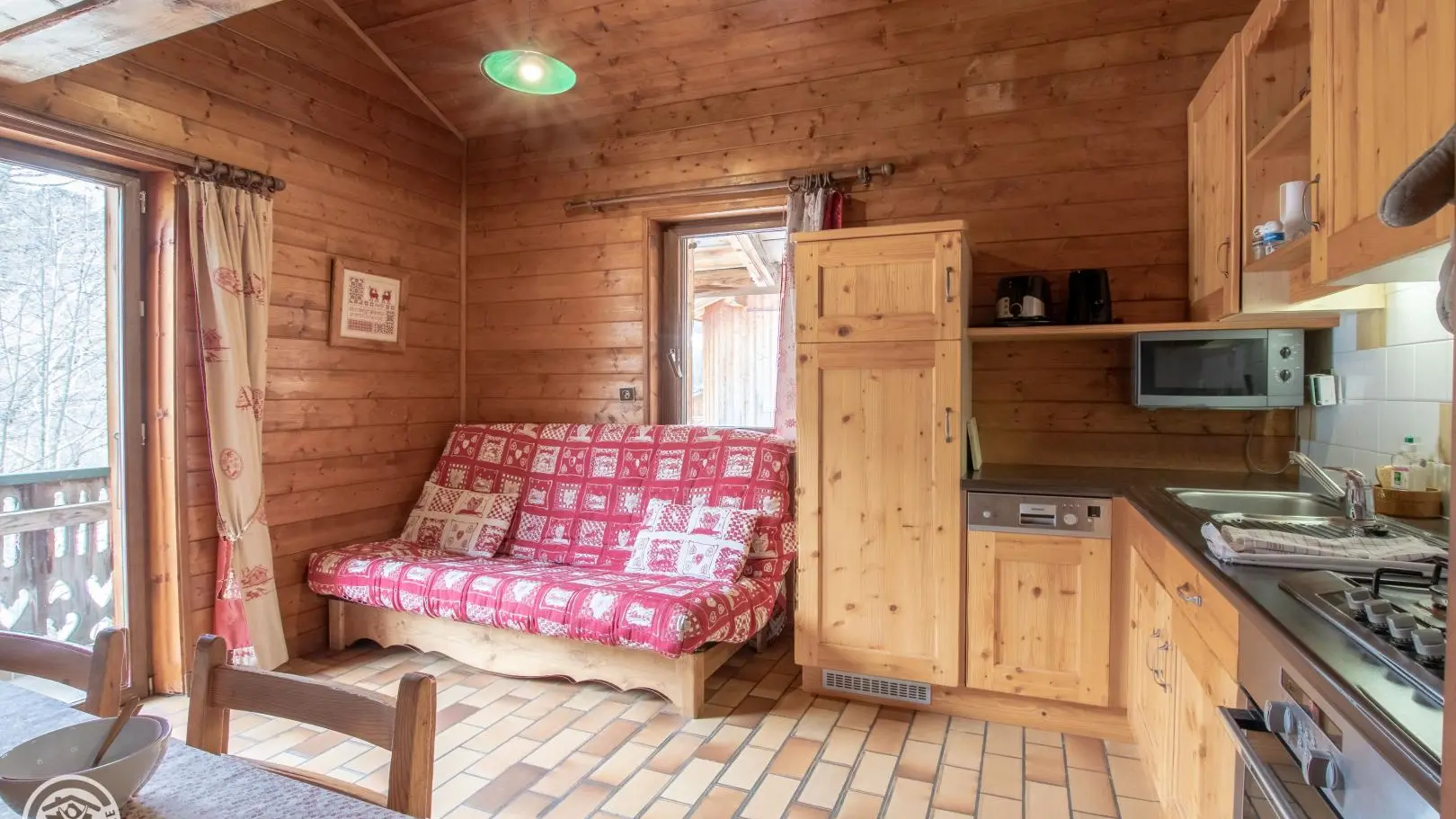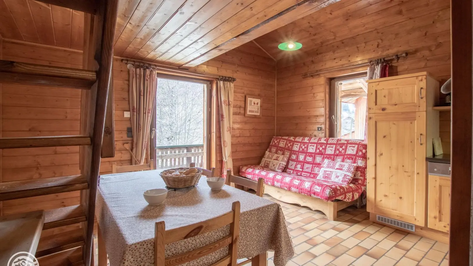 Near the ski resort at Les Gets, old flower-decked chalet comprising 6 gîtes et owners' home. Gîte - Marmotte - (28m2, same level access) on 1st floor: hall/alcove (2 bunk beds), fitted kitchen opening onto living room, shower room/WC. Mezzanine (double bed). For hire : bed linen. Underfloor central heating. Balcony, garden, shared games et barbecue. Le Mont-Chéry cable-car et ski slopes 300m. Free shuttle 300m. Shops et organised activities 300m. Paragliding landing site 200m. Leisure centre 1.2km. Golf (18-hole) at Les Chavannes. 10% reduction for stays of 3 weeks.