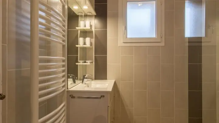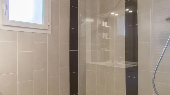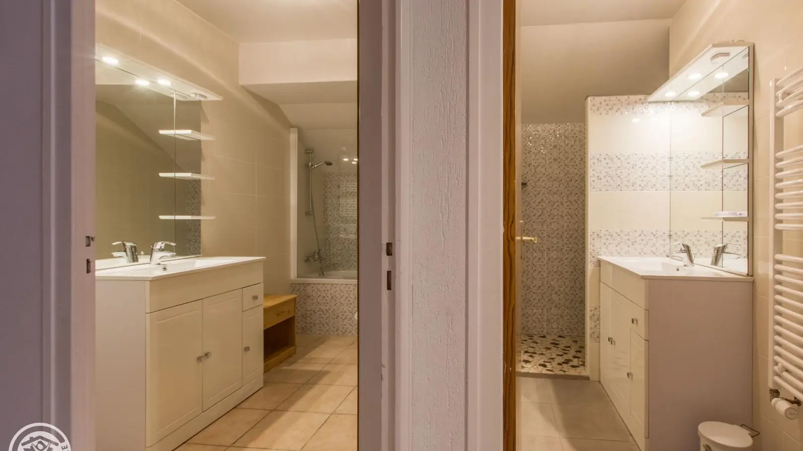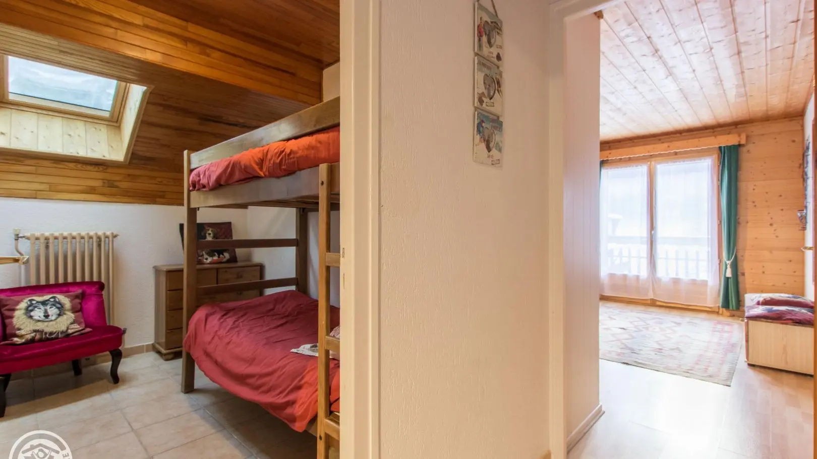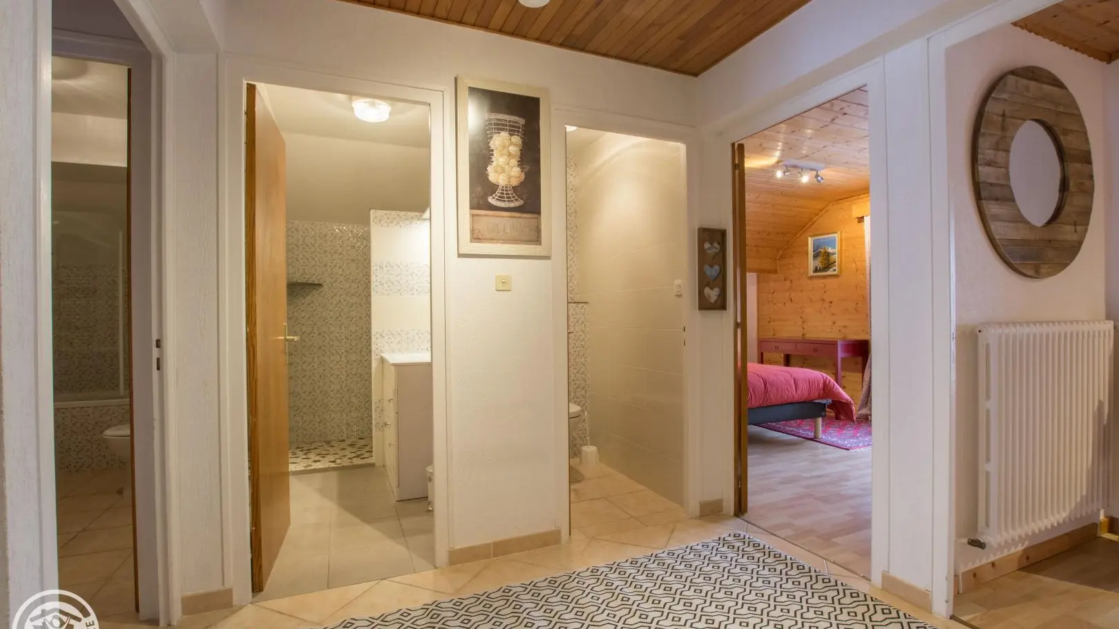 1st floor of the chalet with 5 bedrooms: bedrooms 5 (2 beds 90com, sink), bedroom 6 (1 bed 140cm, sink), bedroom 7 (3 beds 90cm,), bedroom 8 (1 bed 140 + 1 bed 80cm), bedroom 9 (2 bunk beds 80cm). 1 bathroom (shower) + 1 bathroom (bath, wc) + 1 independent wc.