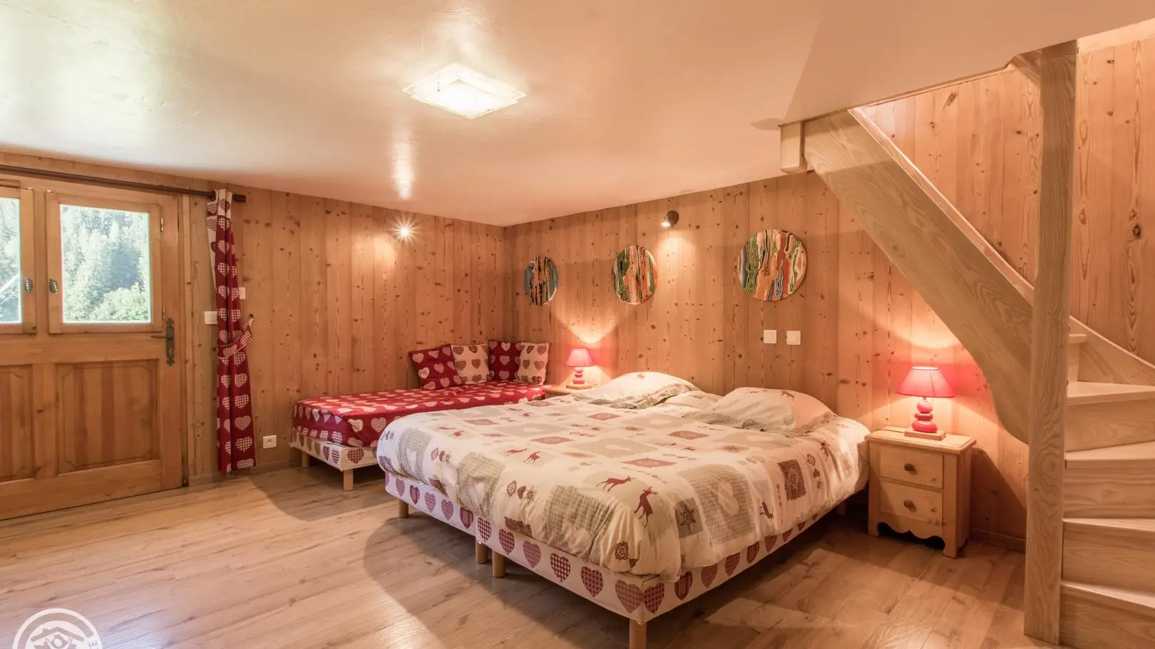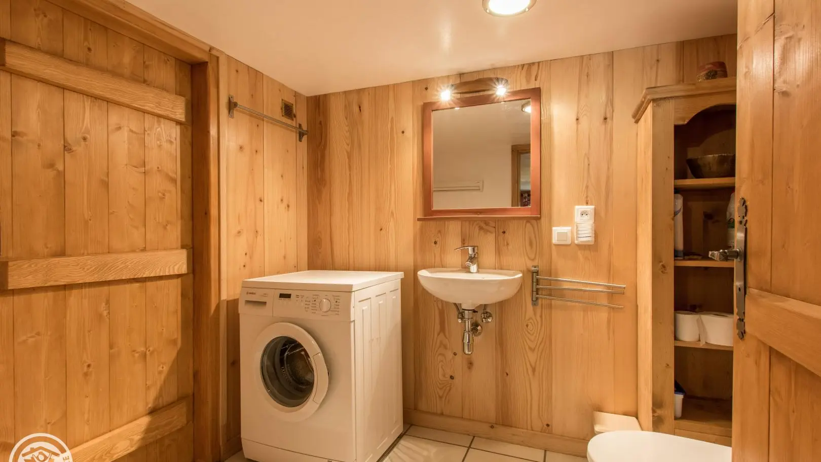 Lower part of the chalet (access by steep staircase from the living room or from outside the chalet) - ceiling height of 1.92cm: large bedroom 2 with 3 90x190cm beds, 2 of which can be combined to create 1 double bed, desk. Separate toilet with sink, washing machine.