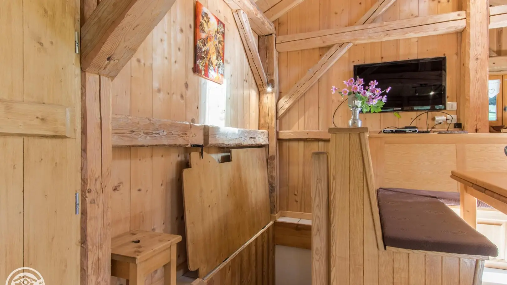 Ground floor: fitted kitchen open to the living room with a wood stove (wood included), small bedroom 1 with 1 140x190cm bed. From the living room, access (by ladder) to the low mezzanine with 2 90cm mattresses on the floor. Shower room (shower) / wc.