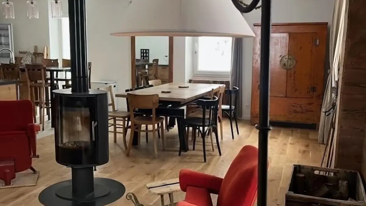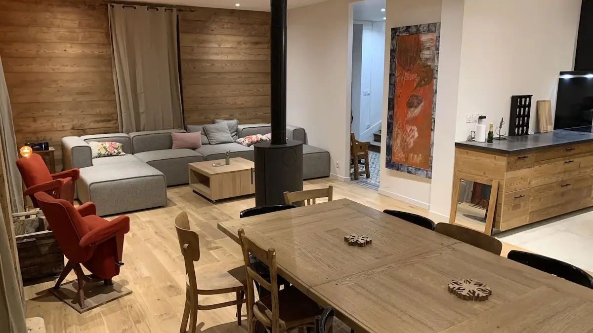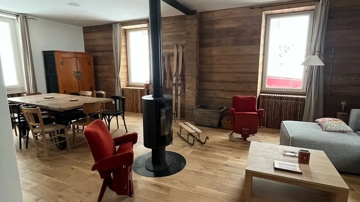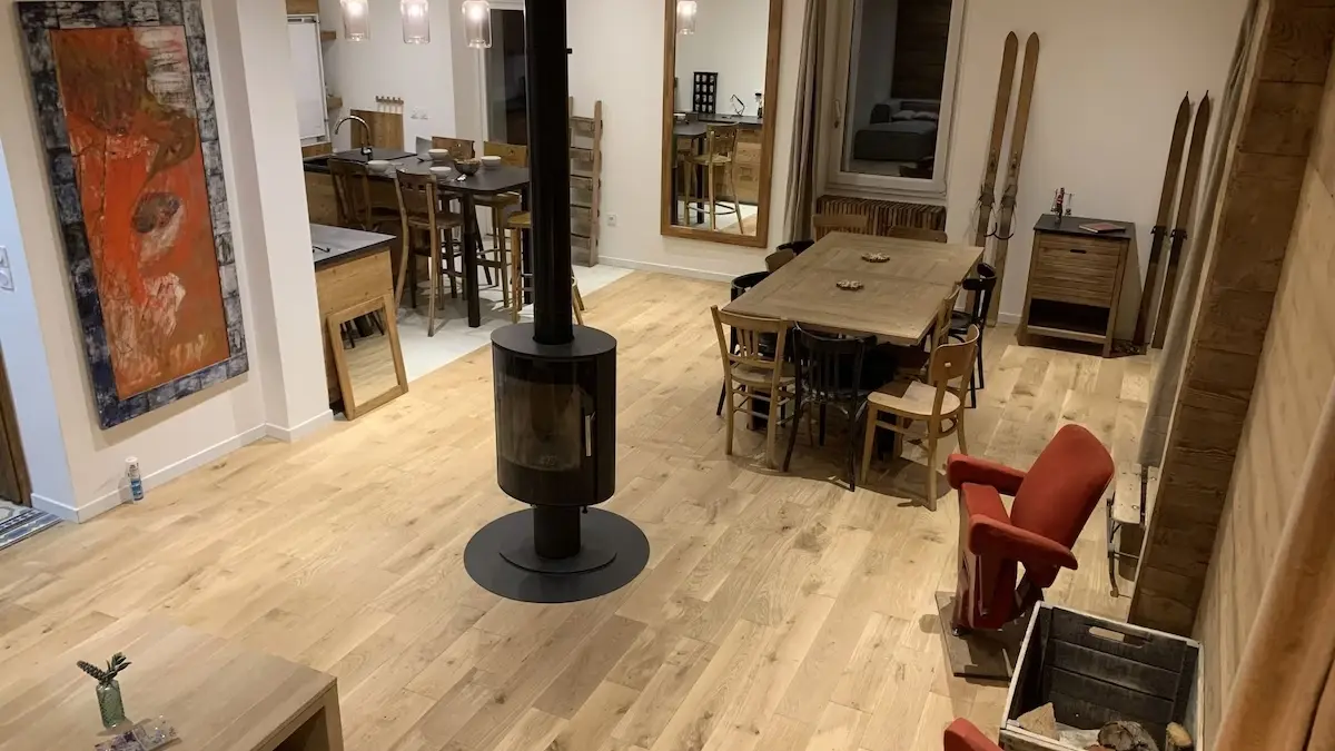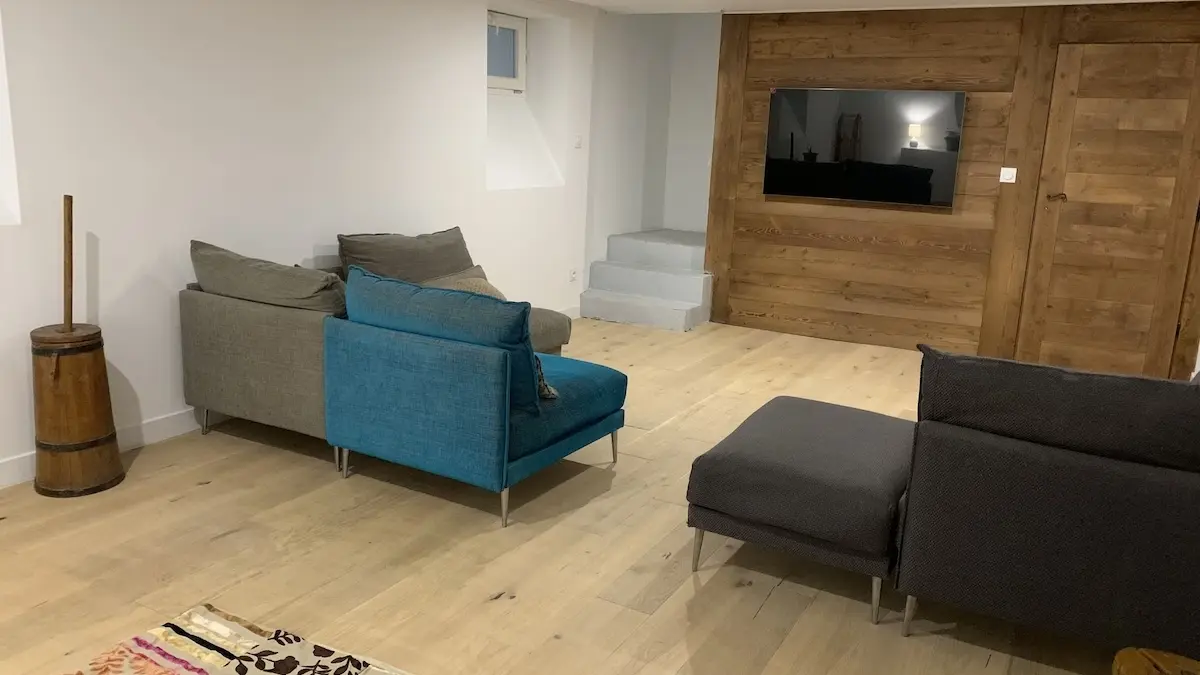 Our chalet has 5 bedrooms, 4 with double beds and one with single beds. The stove is in the middle of the large living room and the TV in the basement room.