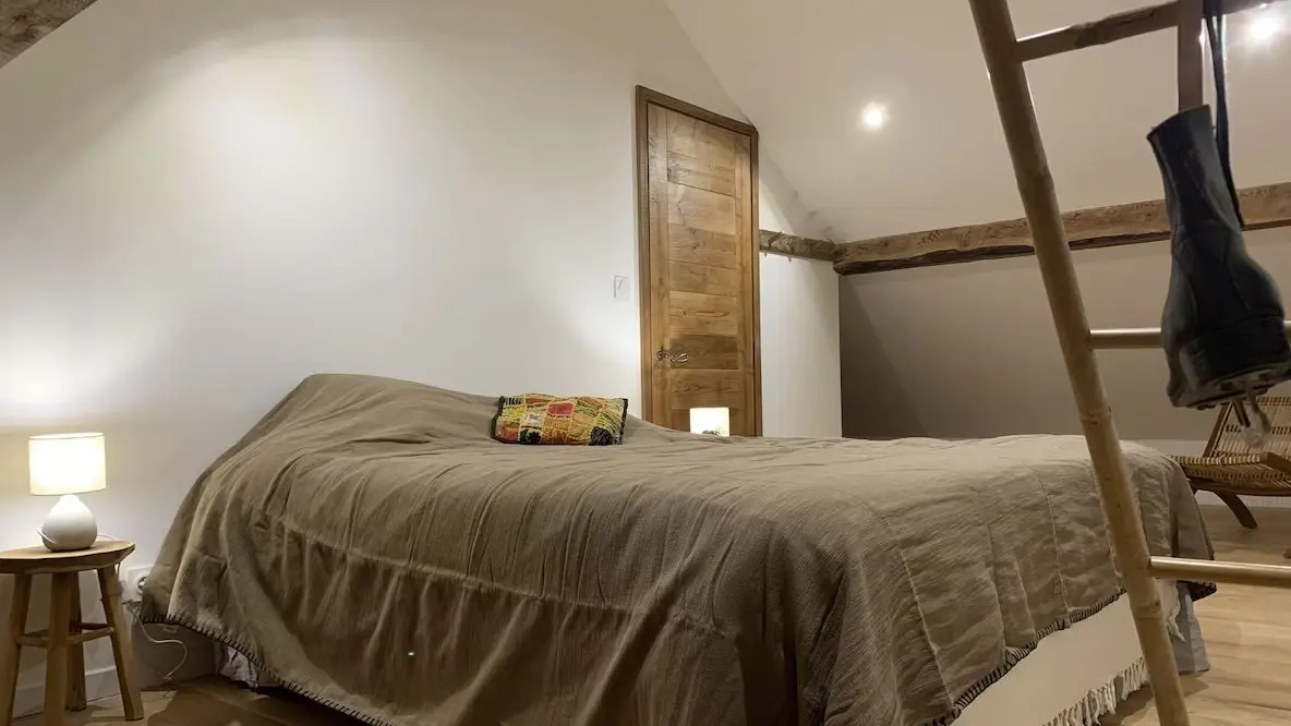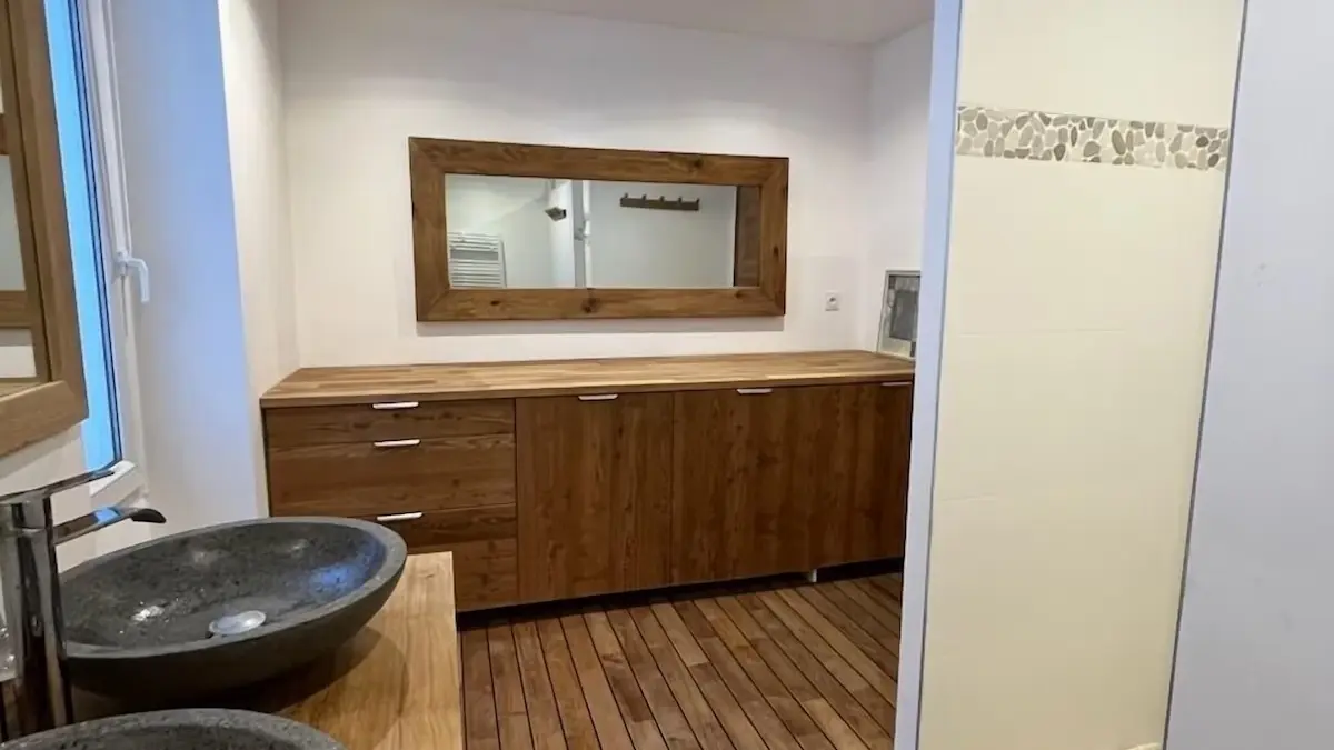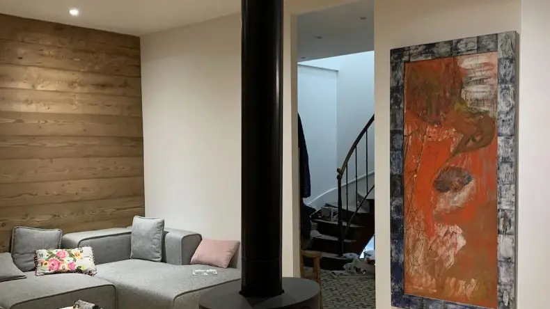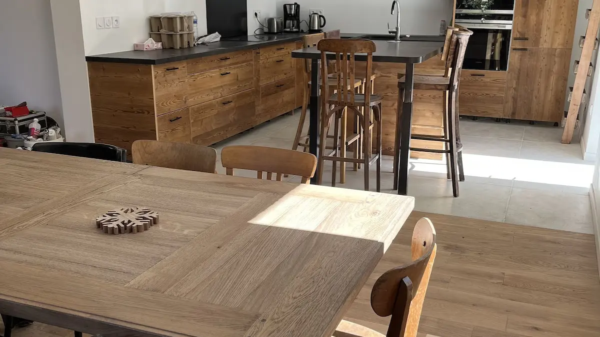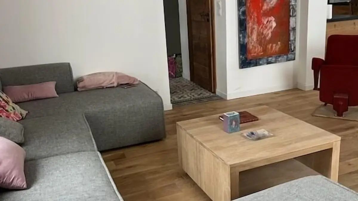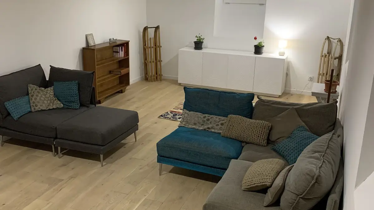 Our chalet has 5 bedrooms, 4 with double beds and one with single beds. The stove is in the middle of the large living room and the TV in the basement room.