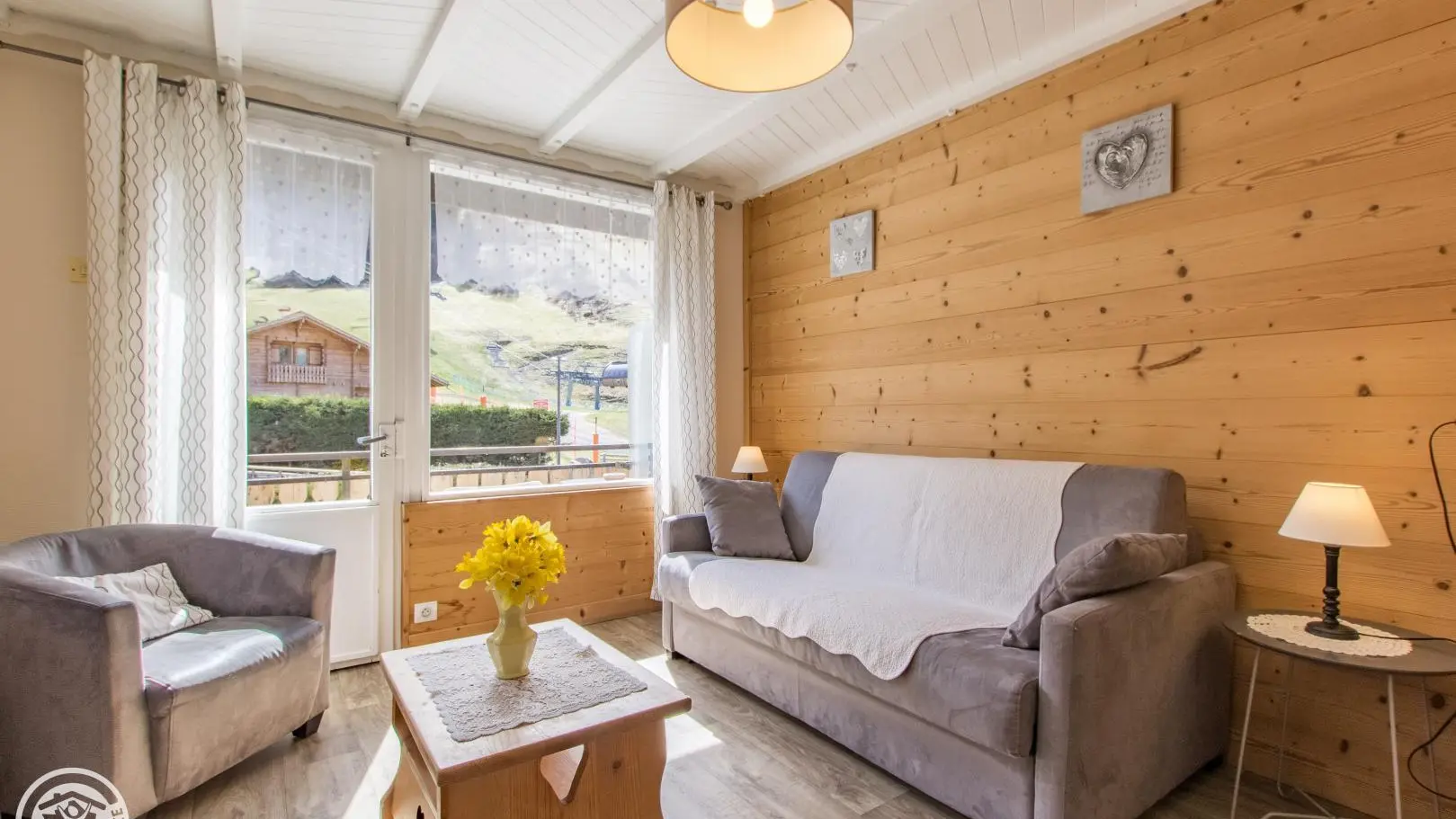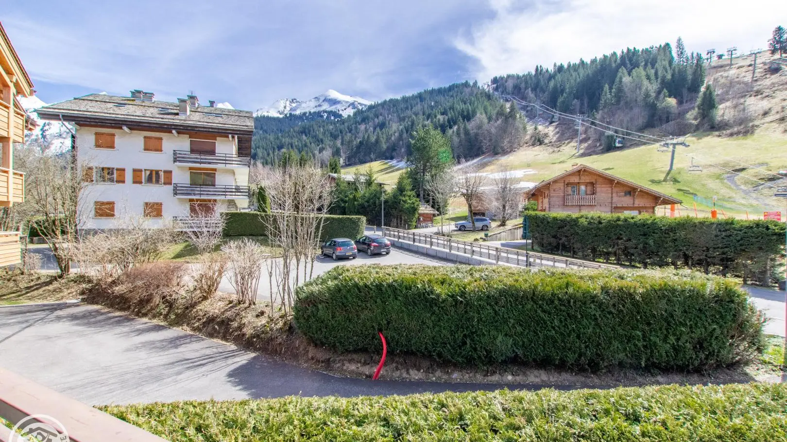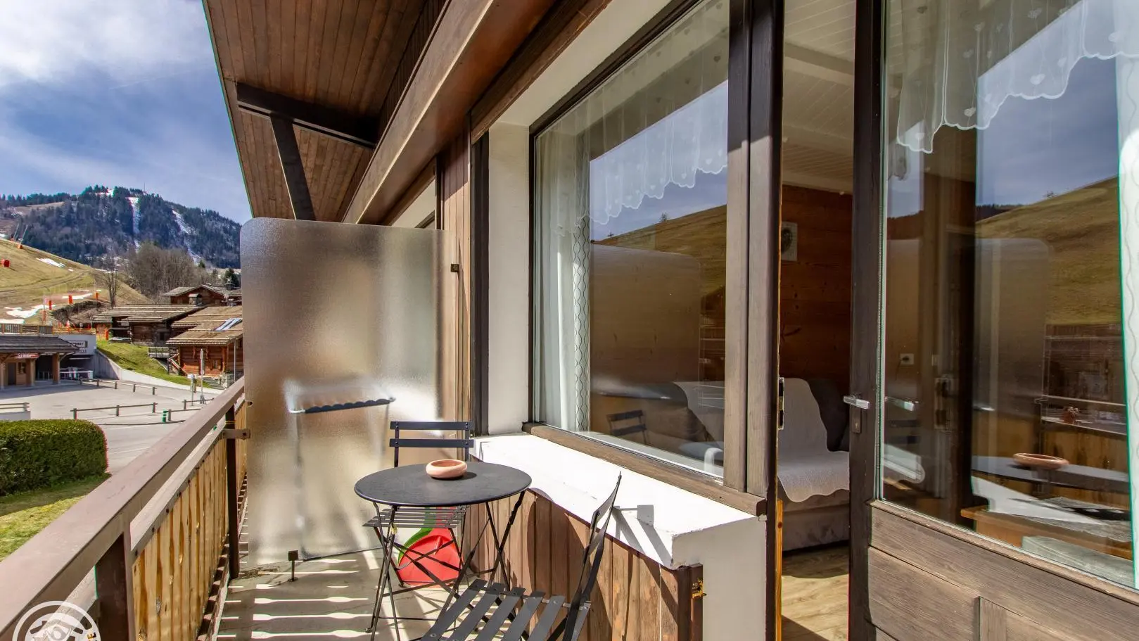 South-east facing balcony with garden furniture for 2 people. Beautiful panorama of the mountains and the slopes in winter.