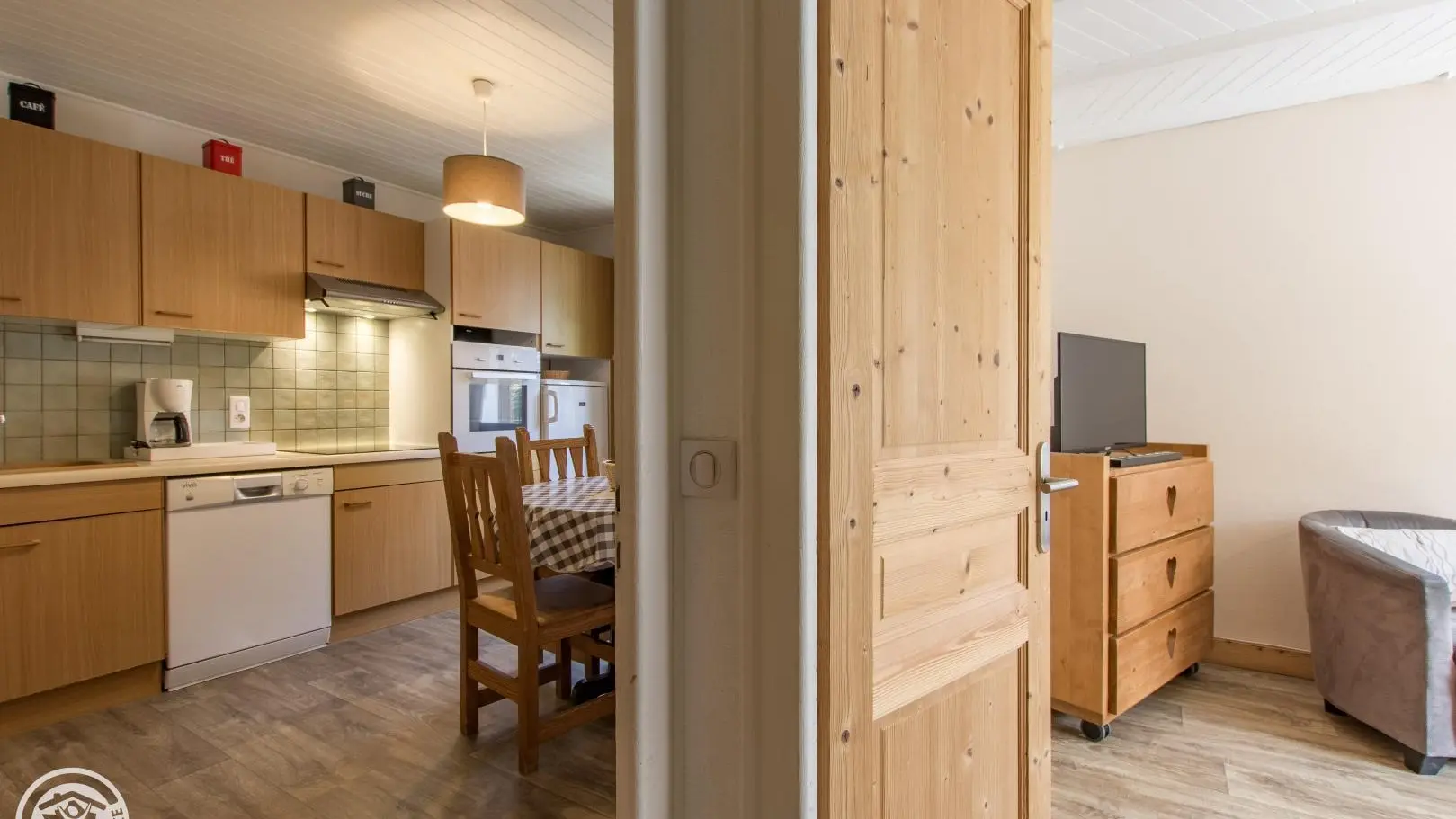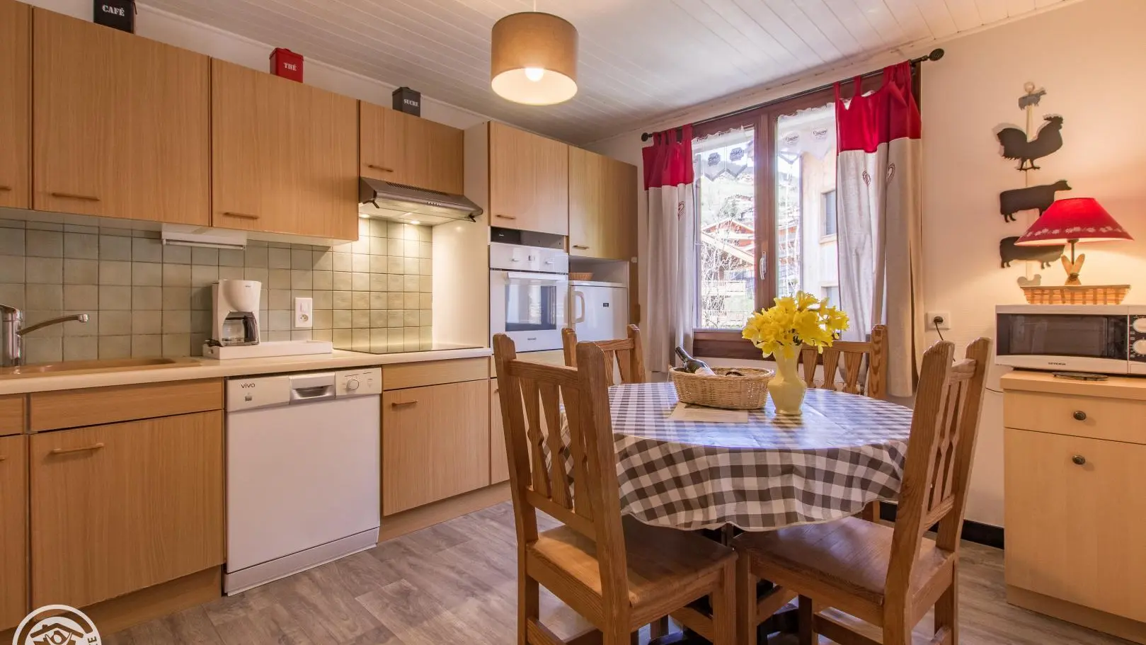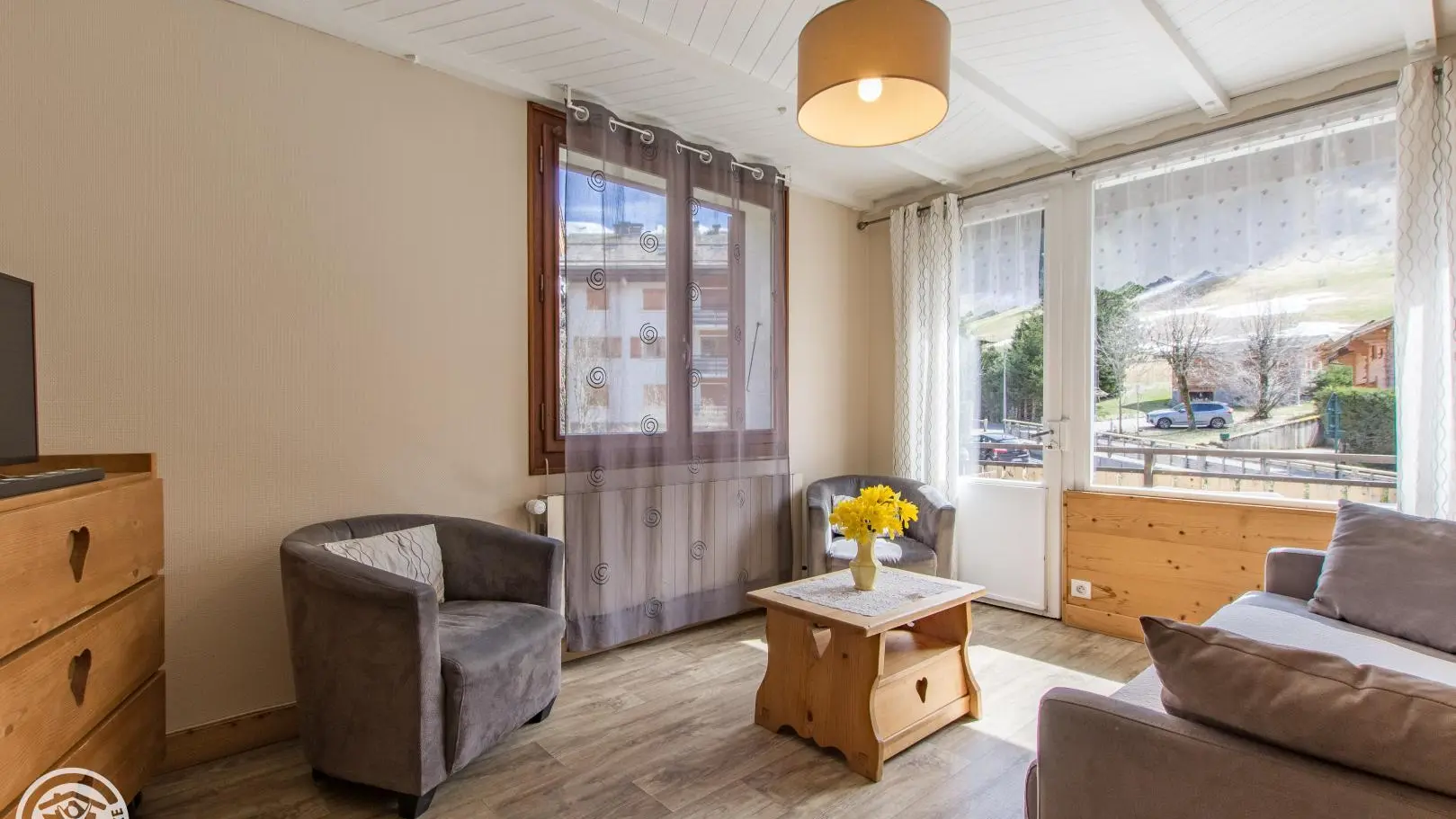 46m² / gîte on the 1st floor of a large house also including 1 owner's accommodation and 3 other rentals. The house is ideally located, very close to the city center and opposite the Bossonnet ski lifts. Common entrance. Large hallway at the entrance, equipped kitchen with dining table. Living room separated from the kitchen with rapido convertible sofa (sleeping for 2 people), armchairs, television, access to the balcony offering a beautiful mountain view.