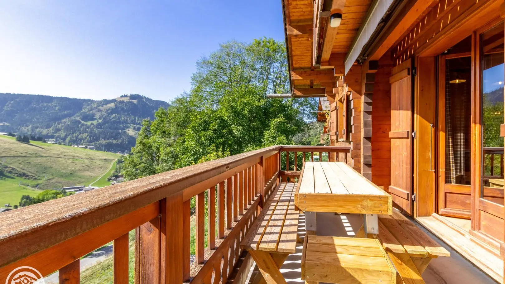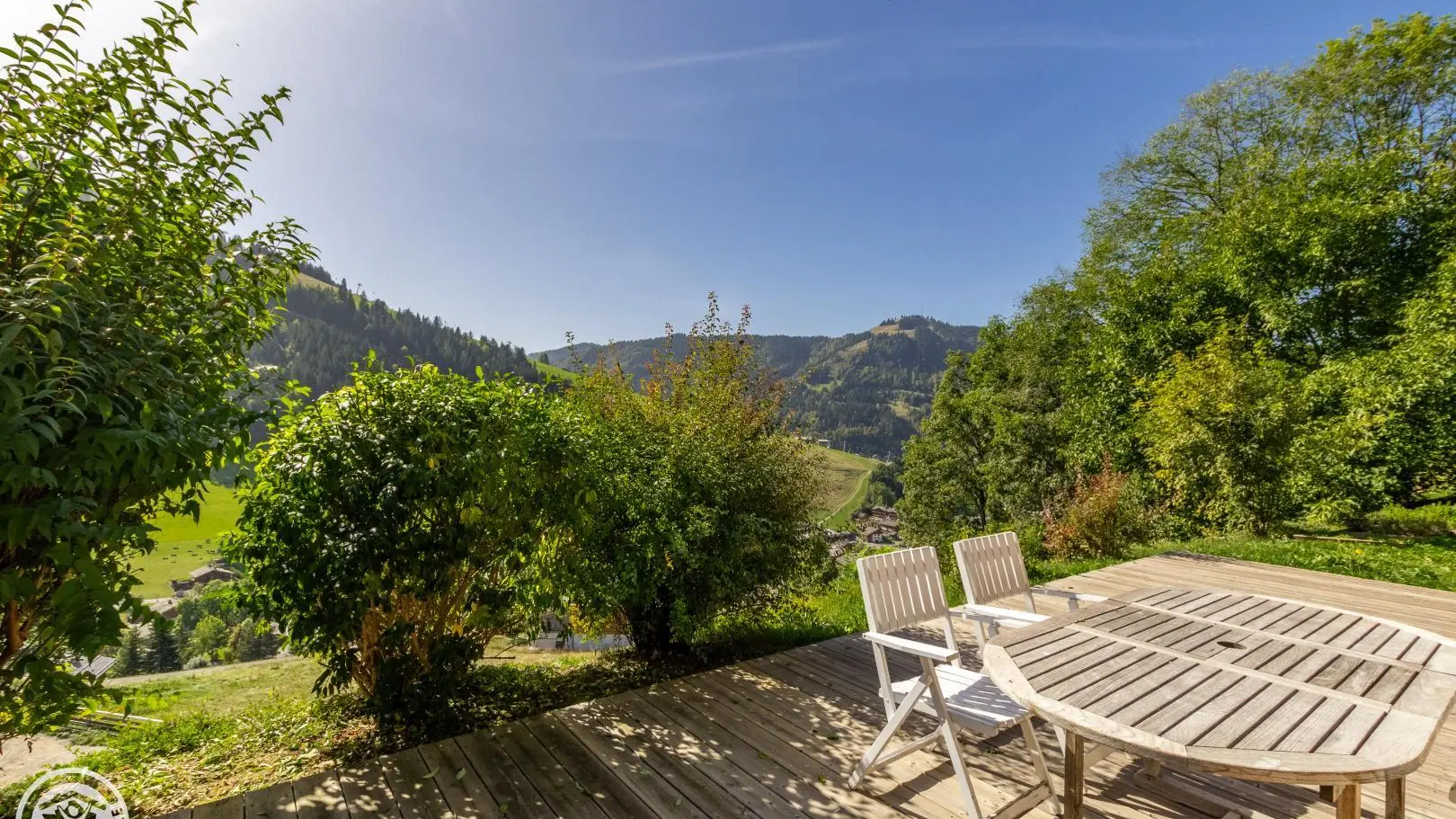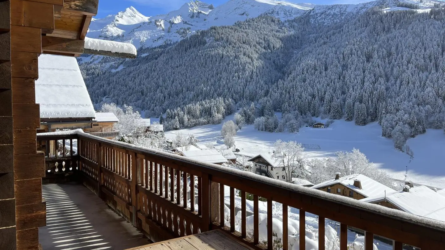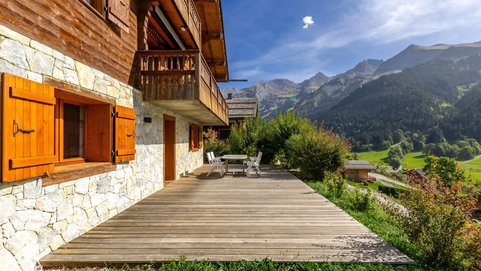 Balcony on the same level as the living room with garden furniture and blinds. Wooden terrace on the lower part of the chalet. Little garden. Magnificent view of the mountains and the resort of La Clusaz.