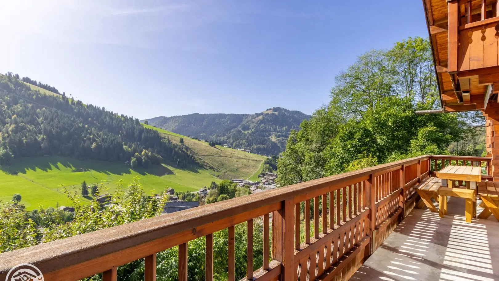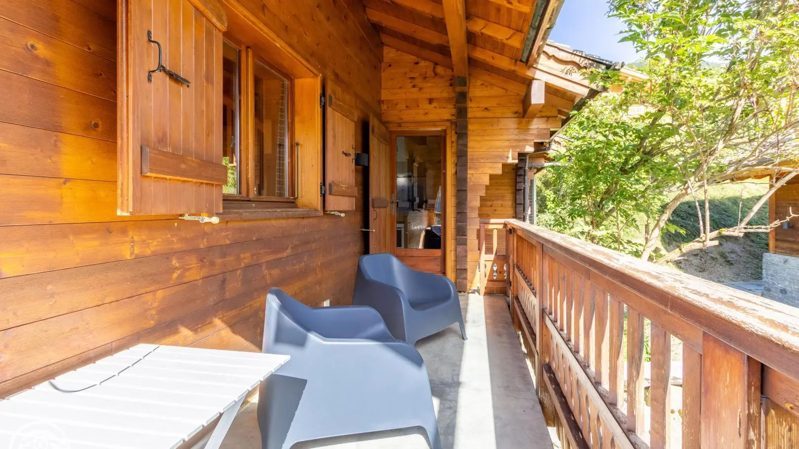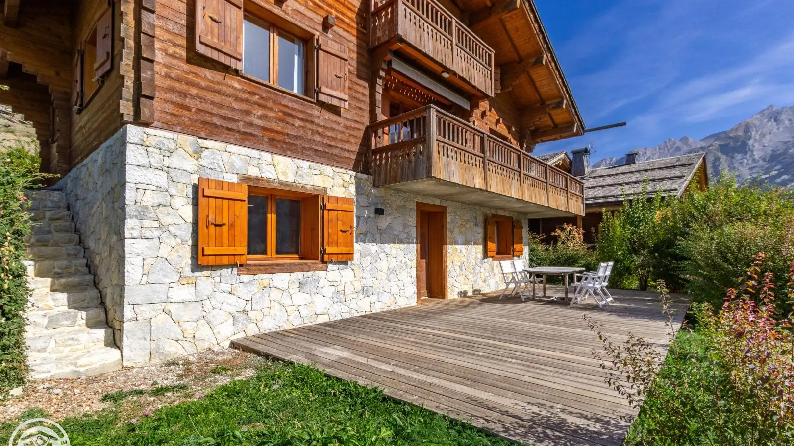 Balcony on the same level as the living room with garden furniture and blinds. Wooden terrace on the lower part of the chalet. Little garden. Magnificent view of the mountains and the resort of La Clusaz.