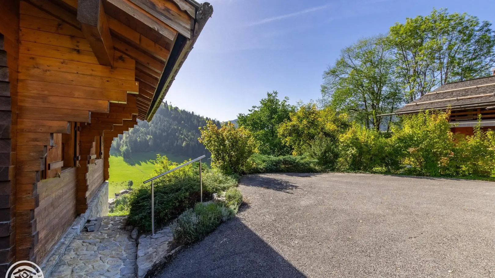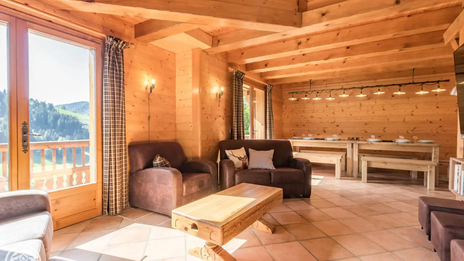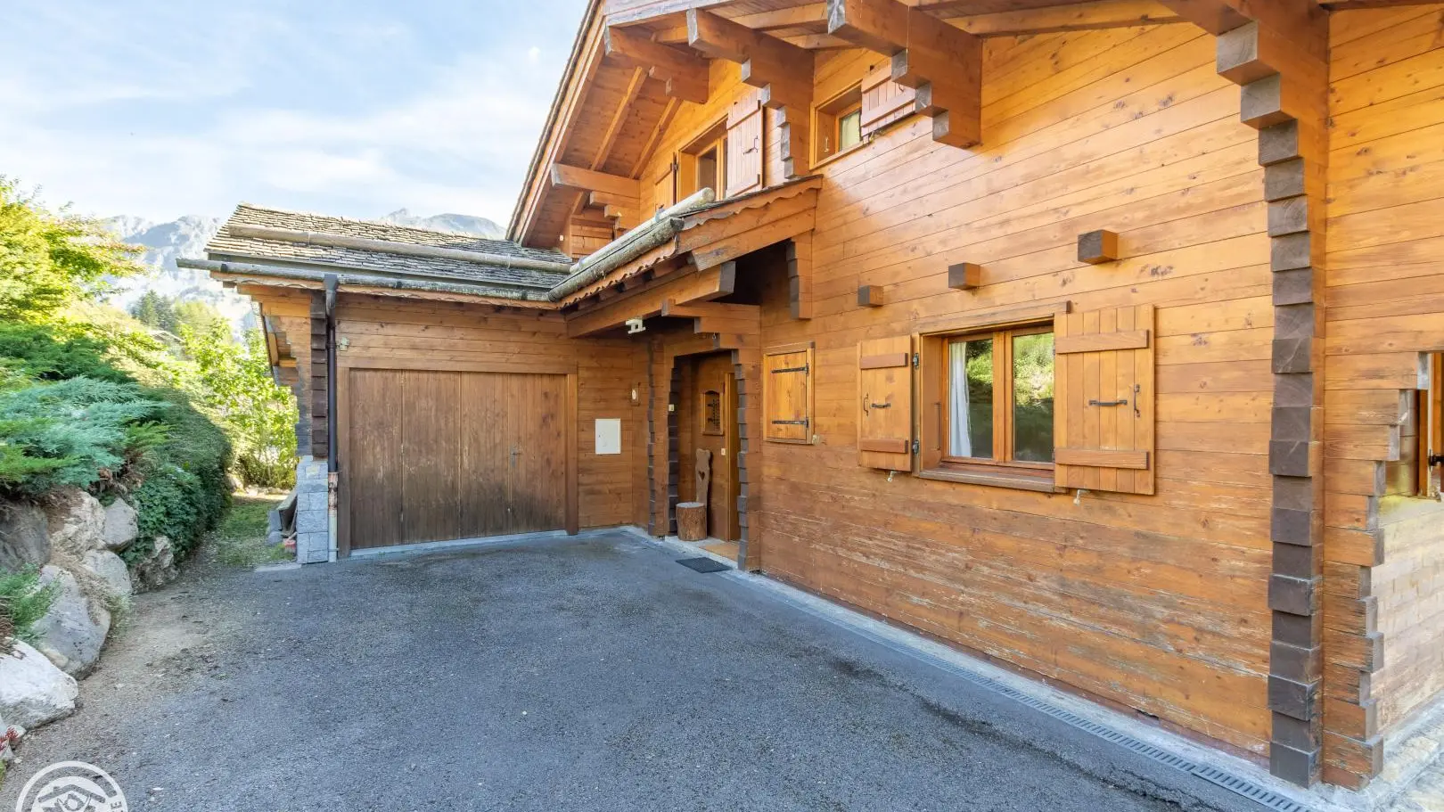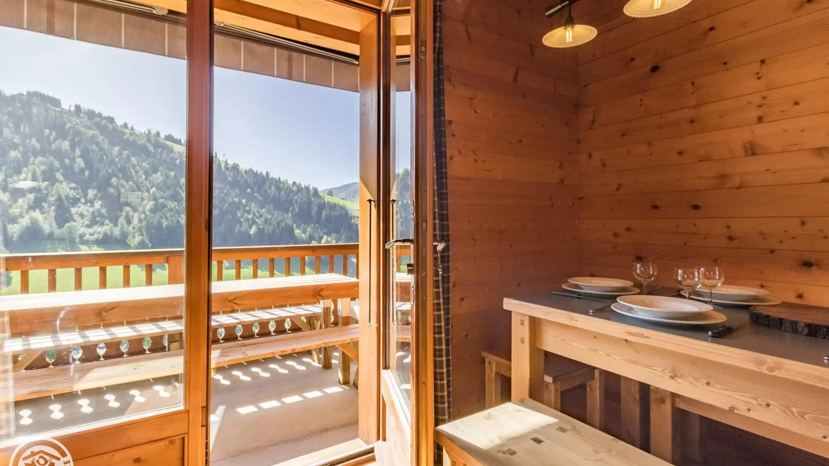 Balcony on the same level as the living room with garden furniture and blinds. Wooden terrace on the lower part of the chalet. Little garden. Magnificent view of the mountains and the resort of La Clusaz.