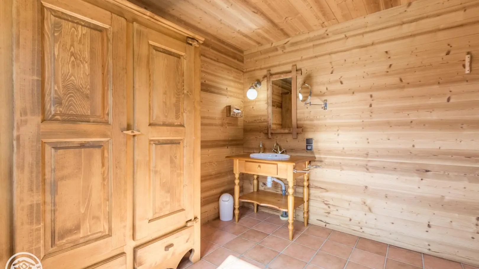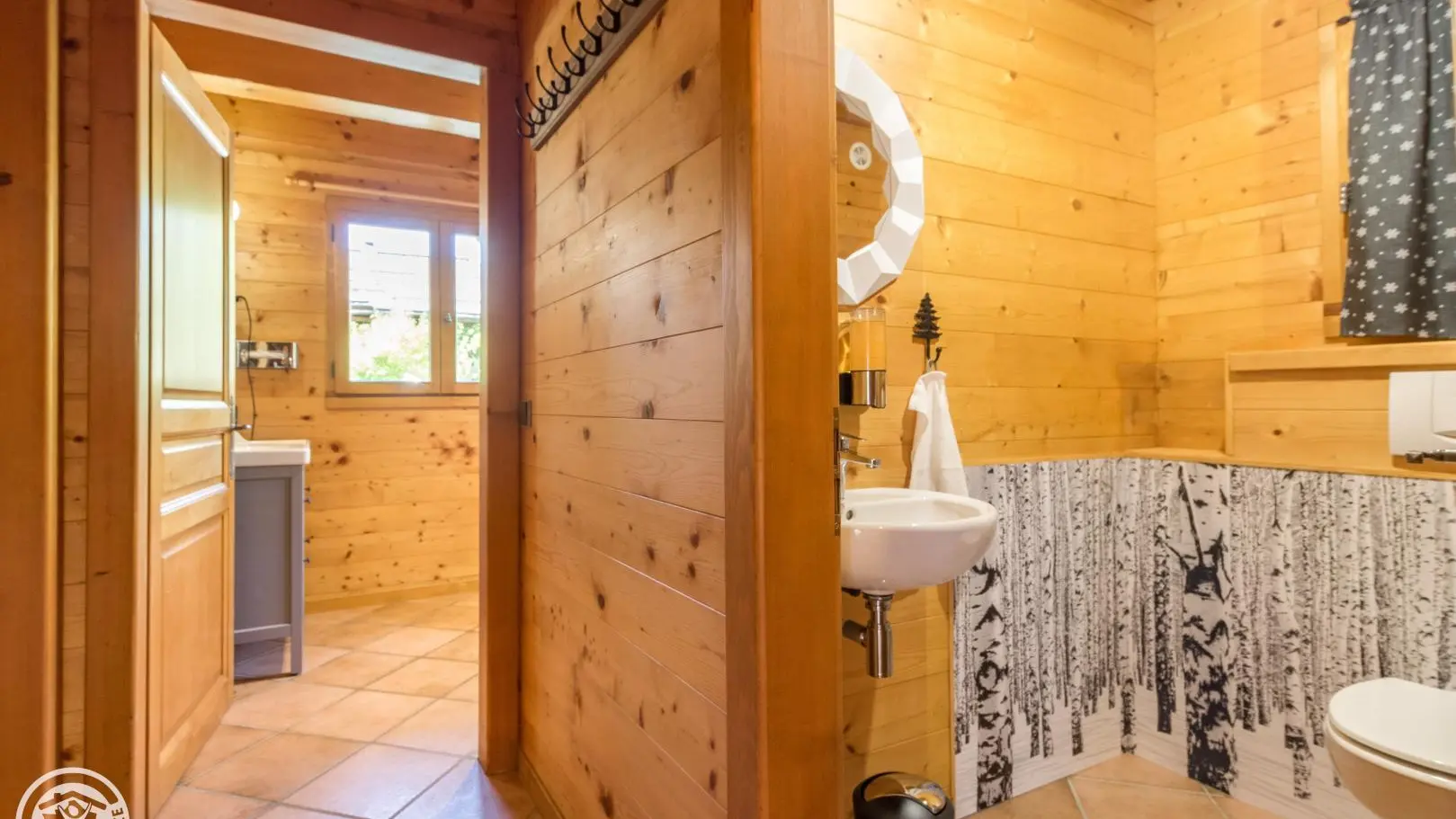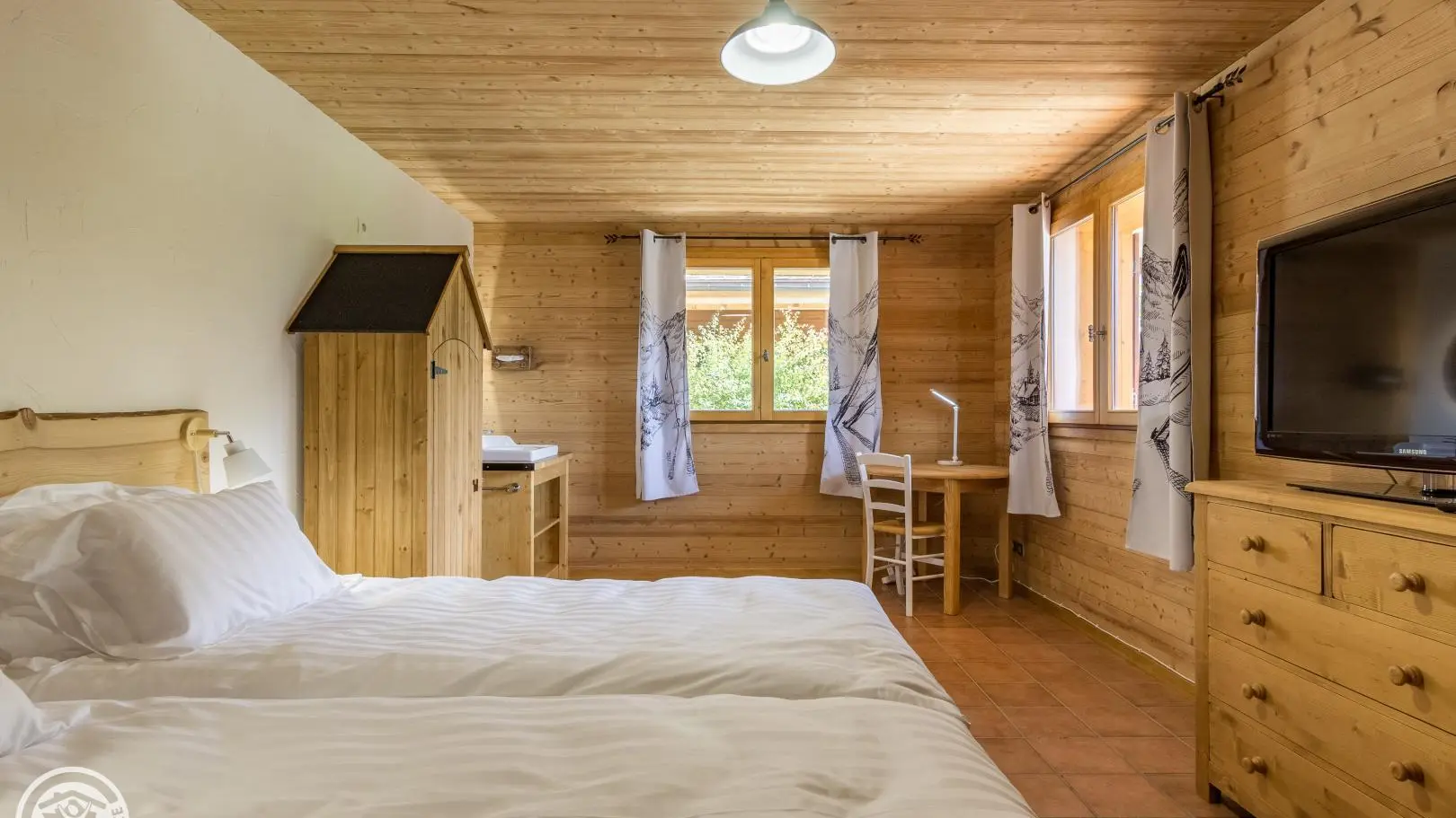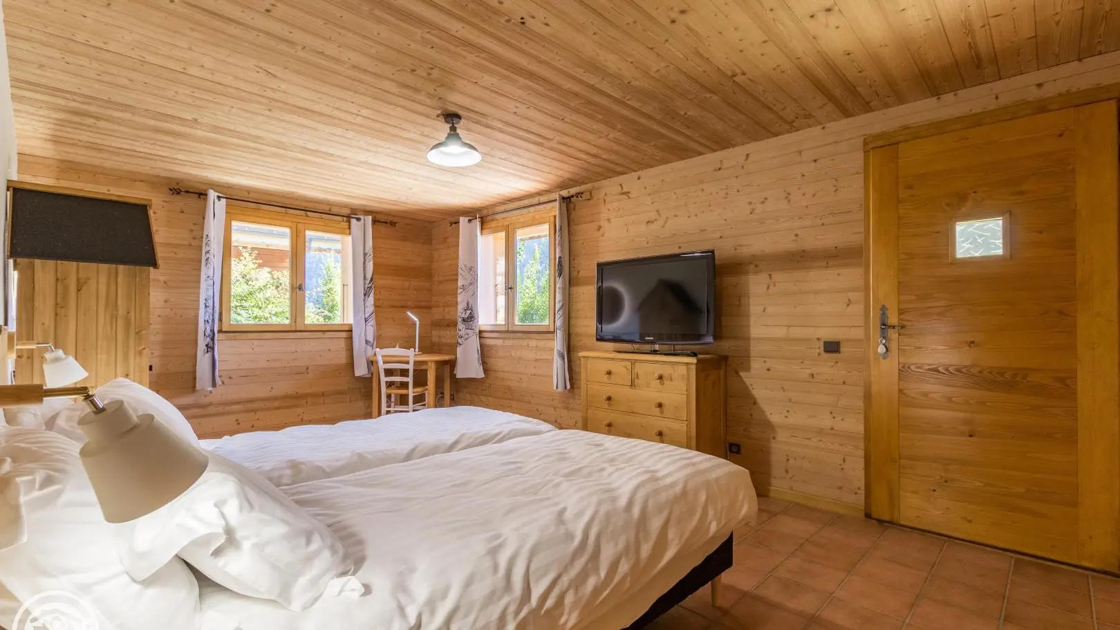 Garden level (lower part of the chalet): bedroom 2 (1 160x200cm bed, sink), bedroom 3 (2 90x200cm beds that can be joined together, sink, TV, access to the terrace), 1 separate toilet.