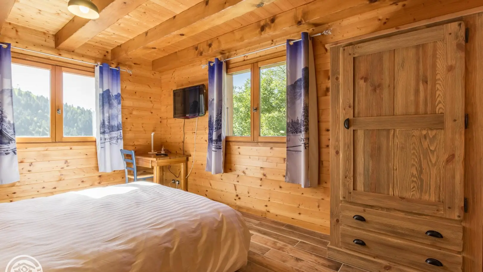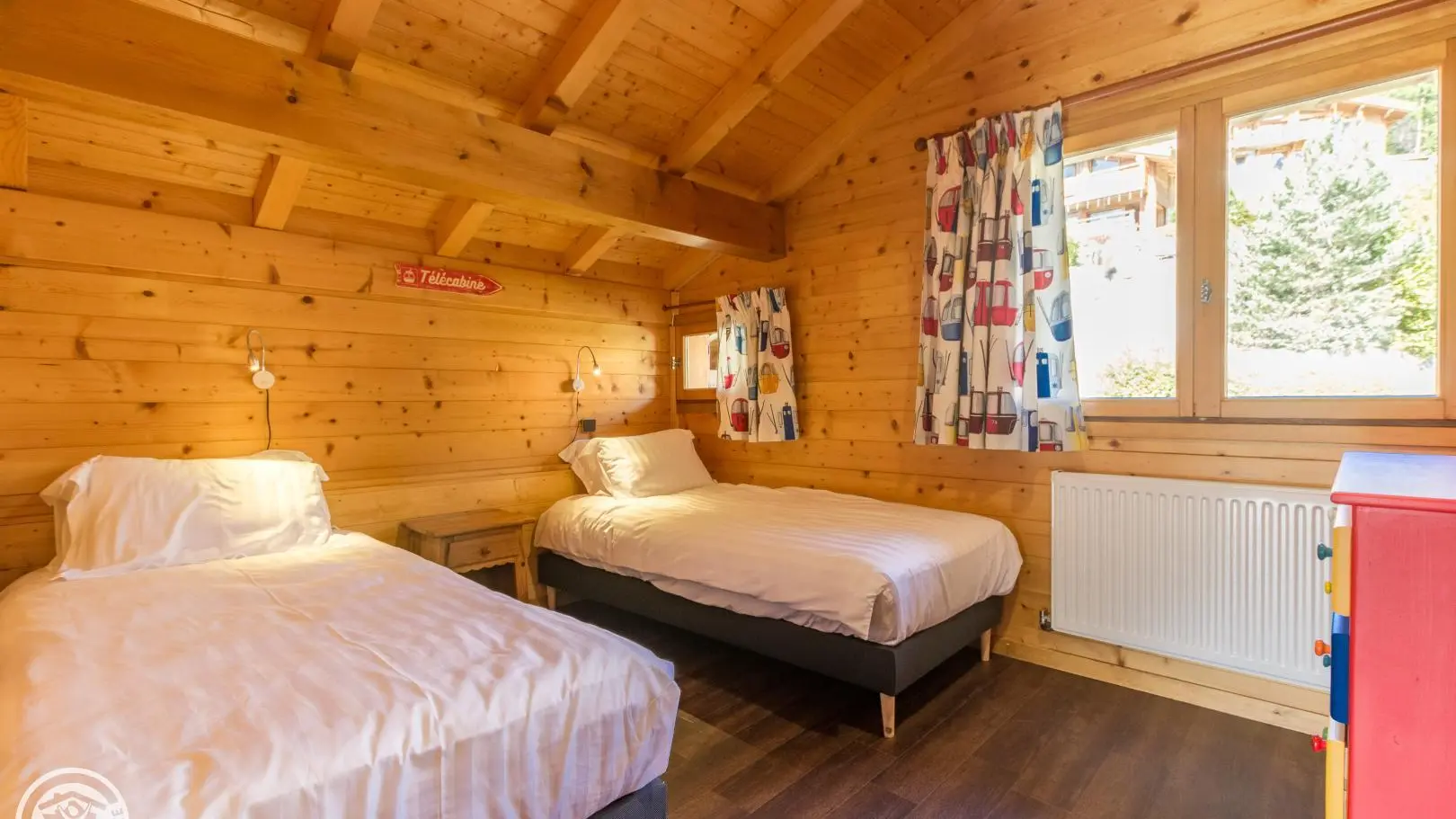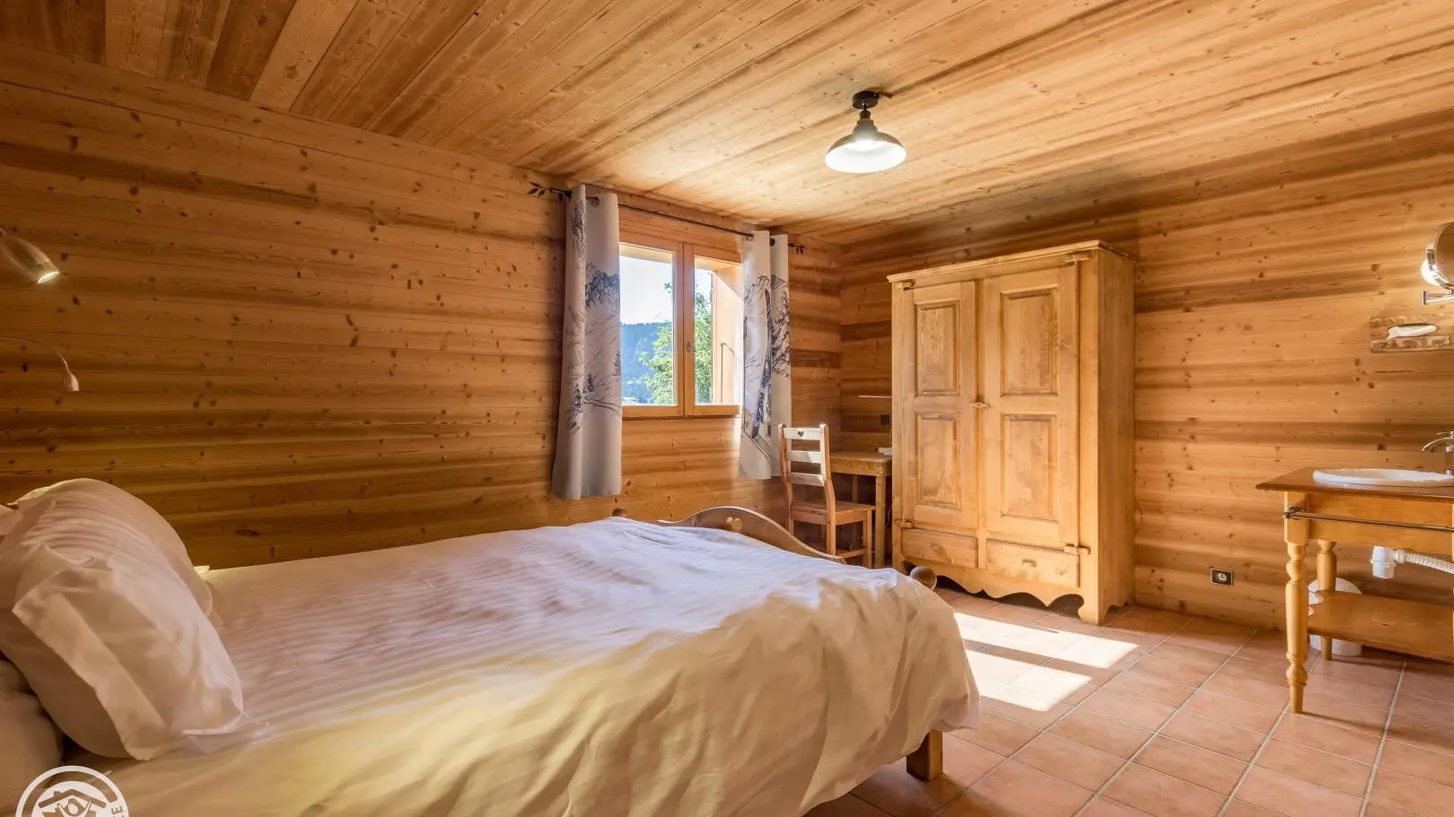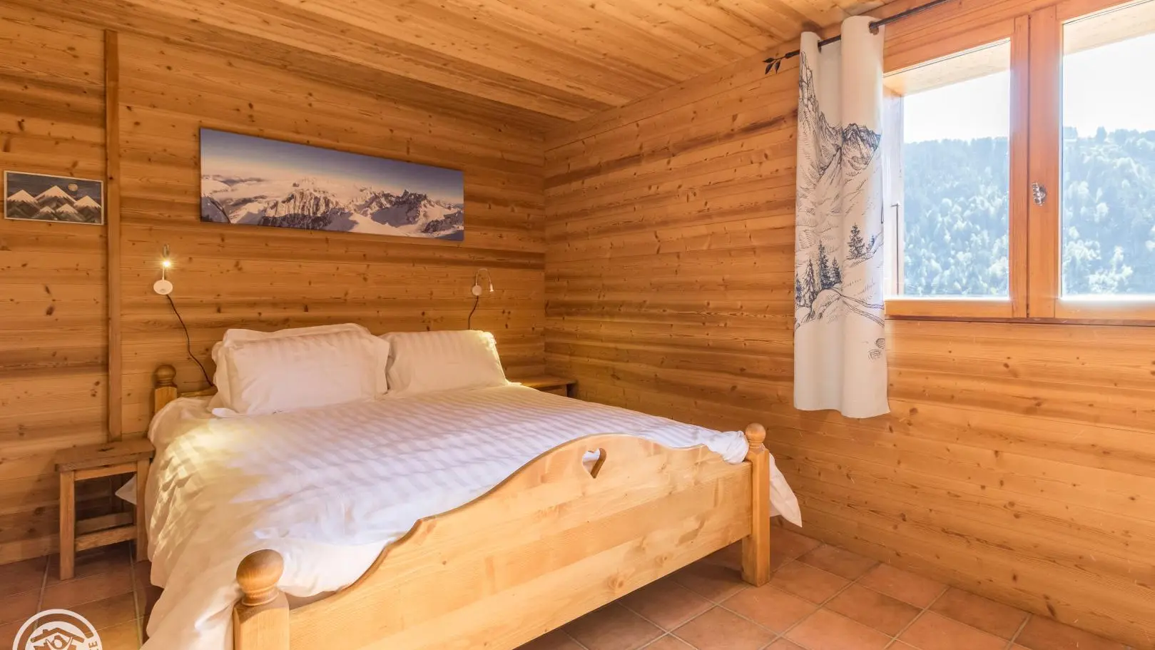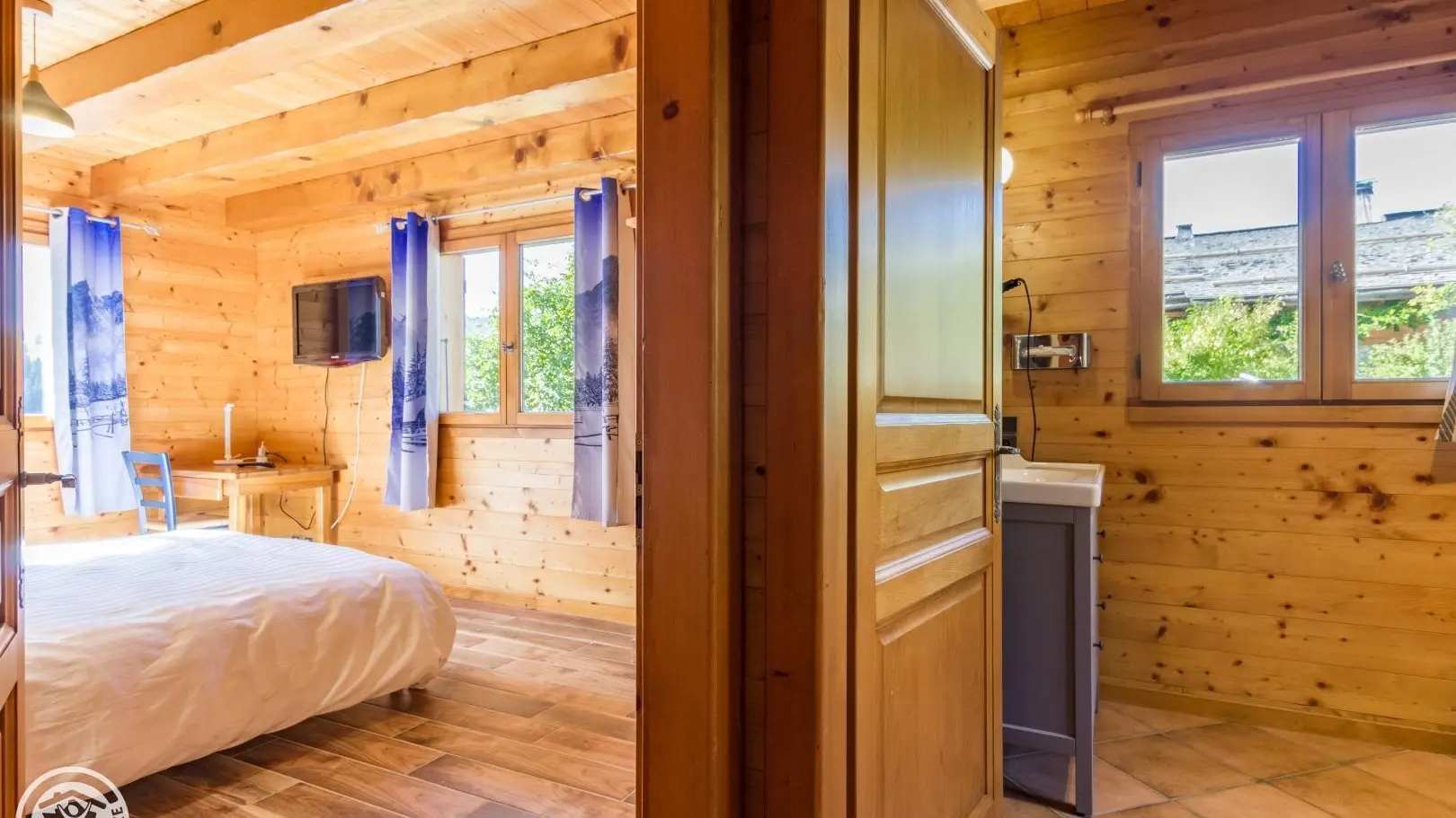 Garden level (lower part of the chalet): bedroom 2 (1 160x200cm bed, sink), bedroom 3 (2 90x200cm beds that can be joined together, sink, TV, access to the terrace), 1 separate toilet.