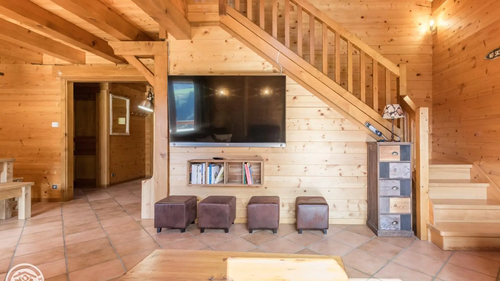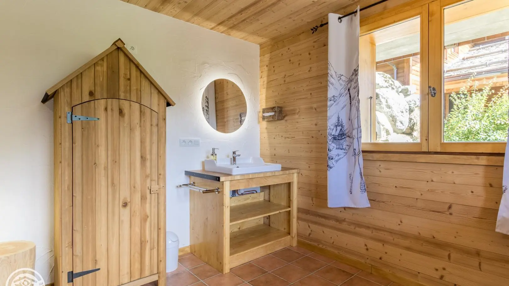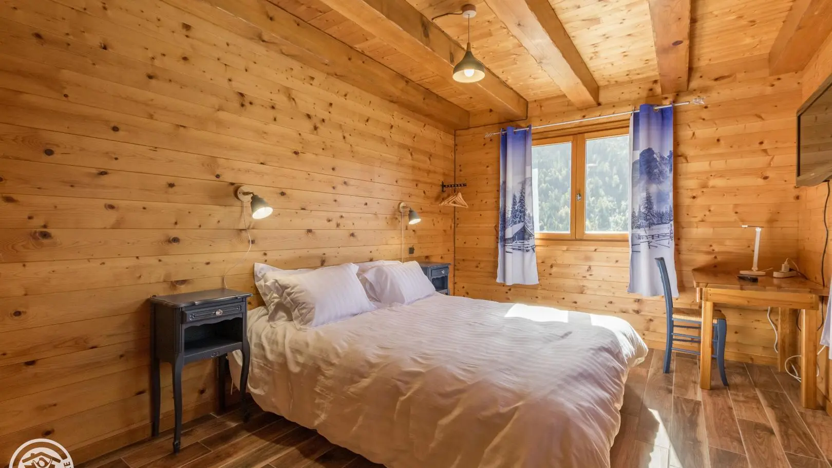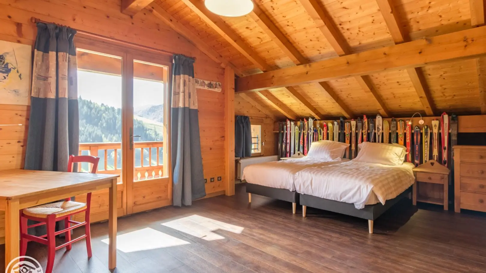 Garden level (lower part of the chalet): bedroom 2 (1 160x200cm bed, sink), bedroom 3 (2 90x200cm beds that can be joined together, sink, TV, access to the terrace), 1 separate toilet.