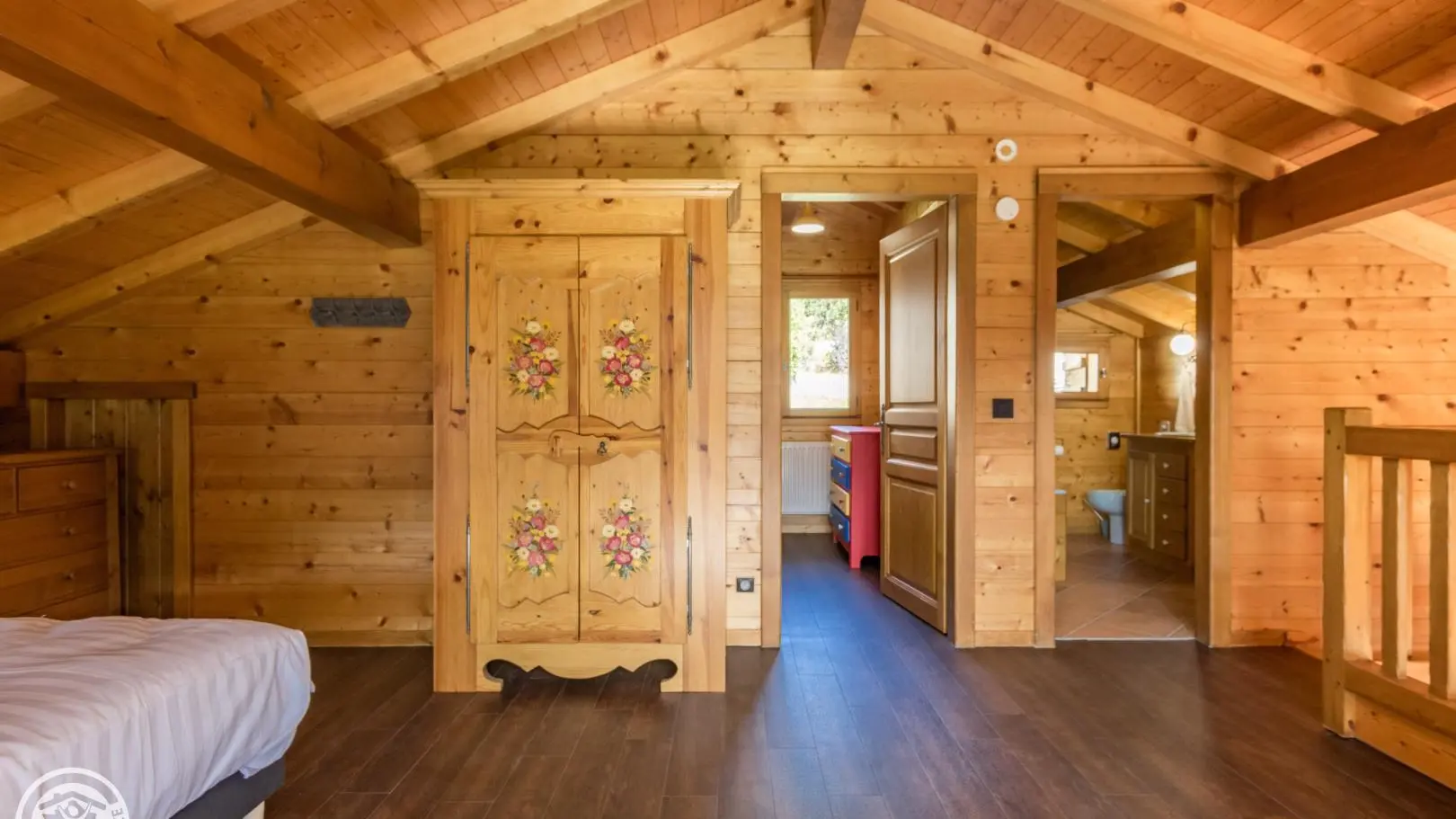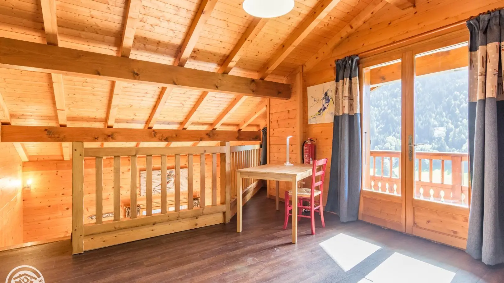 1st floor of the chalet: mezzanine with sleeping area (2 90x200cm beds that can be put together, desk, balcony access), bedroom 4 (2 90x200cm beds that can be put together), bathroom (bath, sink, toilet).