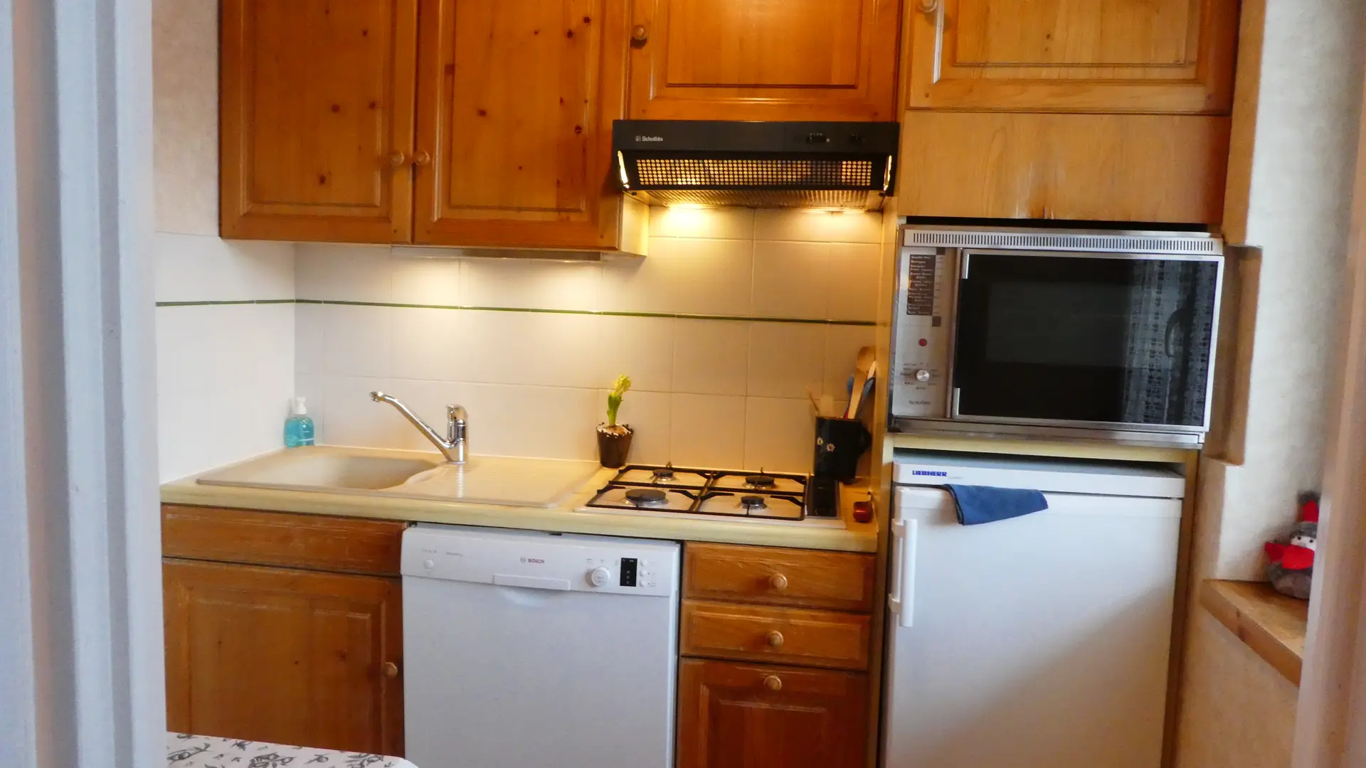 Separate kitchen: 4 burners, hood, electric oven, microwave, dishwasher.