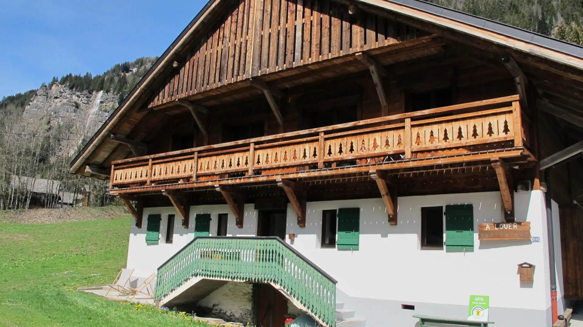 Balcony, land around the chalet with a private space at the back equipped with a garden. Deckchairs. View of the mountains.